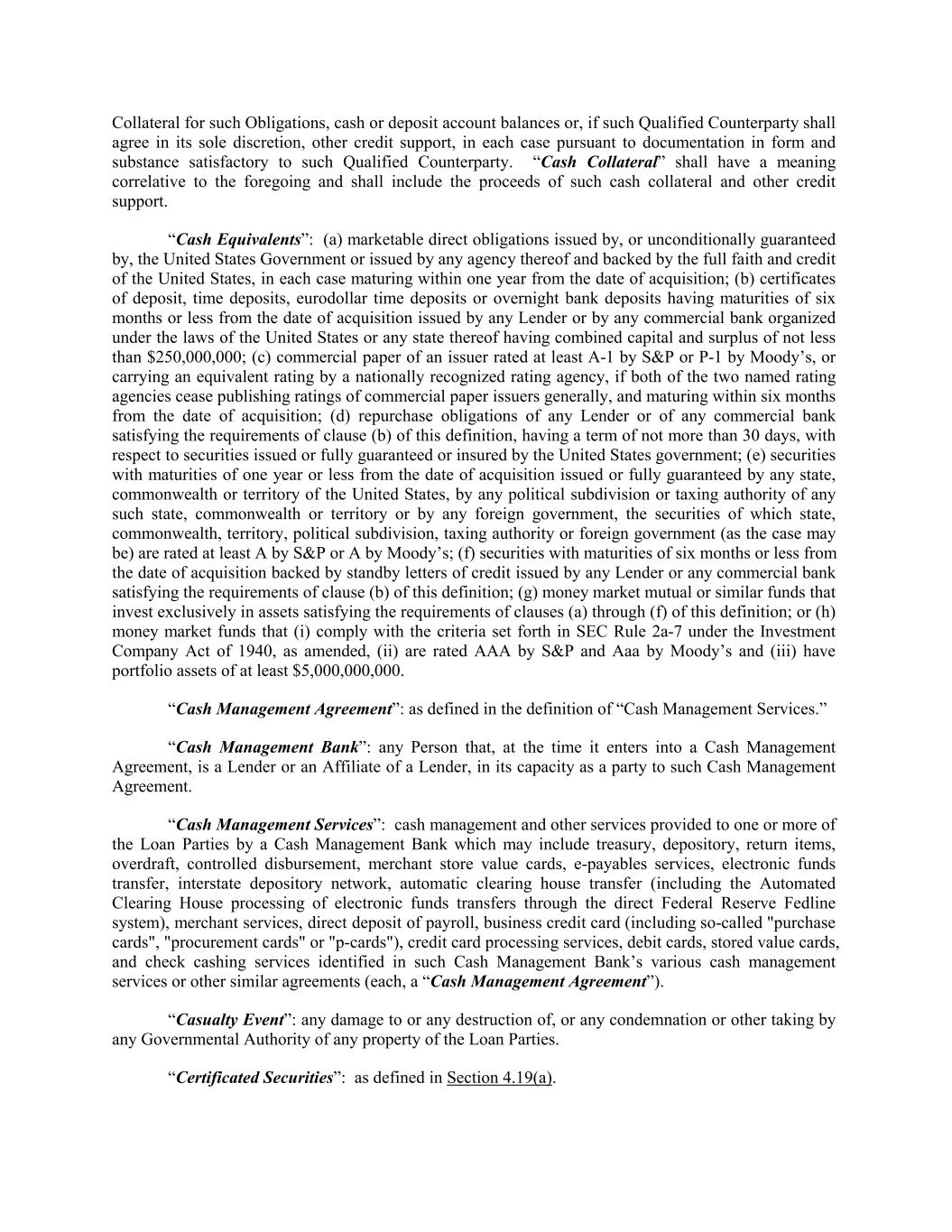 Collateral for such Obligations, cash or deposit account balances or, if such Qualified Counterparty shall agree in its sole discretion, other credit support, in each case pursuant to documentation in form and substance satisfactory to such Qualified Counterparty. “Cash Collateral” shall have a meaning correlative to the foregoing and shall include the proceeds of such cash collateral and other credit support. “Cash Equivalents”: (a) marketable direct obligations issued by, or unconditionally guaranteed by, the United States Government or issued by any agency thereof and backed by the full faith and credit of the United States, in each case maturing within one year from the date of acquisition; (b) certificates of deposit, time deposits, eurodollar time deposits or overnight bank deposits having maturities of six months or less from the date of acquisition issued by any Lender or by any commercial bank organized under the laws of the United States or any state thereof having combined capital and surplus of not less than $250,000,000; (c) commercial paper of an issuer rated at least A-1 by S&P or P-1 by Moody’s, or carrying an equivalent rating by a nationally recognized rating agency, if both of the two named rating agencies cease publishing ratings of commercial paper issuers generally, and maturing within six months from the date of acquisition; (d) repurchase obligations of any Lender or of any commercial bank satisfying the requirements of clause (b) of this definition, having a term of not more than 30 days, with respect to securities issued or fully guaranteed or insured by the United States government; (e) securities with maturities of one year or less from the date of acquisition issued or fully guaranteed by any state, commonwealth or territory of the United States, by any political subdivision or taxing authority of any such state, commonwealth or territory or by any foreign government, the securities of which state, commonwealth, territory, political subdivision, taxing authority or foreign government (as the case may be) are rated at least A by S&P or A by Moody’s; (f) securities with maturities of six months or less from the date of acquisition backed by standby letters of credit issued by any Lender or any commercial bank satisfying the requirements of clause (b) of this definition; (g) money market mutual or similar funds that invest exclusively in assets satisfying the requirements of clauses (a) through (f) of this definition; or (h) money market funds that (i) comply with the criteria set forth in SEC Rule 2a-7 under the Investment Company Act of 1940, as amended, (ii) are rated AAA by S&P and Aaa by Moody’s and (iii) have portfolio assets of at least $5,000,000,000. “Cash Management Agreement”: as defined in the definition of “Cash Management Services.” “Cash Management Bank”: any Person that, at the time it enters into a Cash Management Agreement, is a Lender or an Affiliate of a Lender, in its capacity as a party to such Cash Management Agreement. “Cash Management Services”: cash management and other services provided to one or more of the Loan Parties by a Cash Management Bank which may include treasury, depository, return items, overdraft, controlled disbursement, merchant store value cards, e-payables services, electronic funds transfer, interstate depository network, automatic clearing house transfer (including the Automated Clearing House processing of electronic funds transfers through the direct Federal Reserve Fedline system), merchant services, direct deposit of payroll, business credit card (including so-called "purchase cards", "procurement cards" or "p-cards"), credit card processing services, debit cards, stored value cards, and check cashing services identified in such Cash Management Bank’s various cash management services or other similar agreements (each, a “Cash Management Agreement”). “Casualty Event”: any damage to or any destruction of, or any condemnation or other taking by any Governmental Authority of any property of the Loan Parties. “Certificated Securities”: as defined in Section 4.19(a).