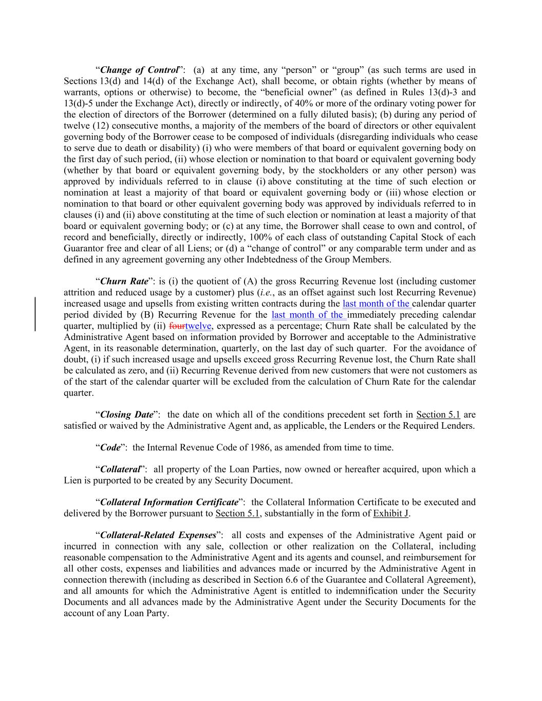 “Change of Control”: (a) at any time, any “person” or “group” (as such terms are used in Sections 13(d) and 14(d) of the Exchange Act), shall become, or obtain rights (whether by means of warrants, options or otherwise) to become, the “beneficial owner” (as defined in Rules 13(d)-3 and 13(d)-5 under the Exchange Act), directly or indirectly, of 40% or more of the ordinary voting power for the election of directors of the Borrower (determined on a fully diluted basis); (b) during any period of twelve (12) consecutive months, a majority of the members of the board of directors or other equivalent governing body of the Borrower cease to be composed of individuals (disregarding individuals who cease to serve due to death or disability) (i) who were members of that board or equivalent governing body on the first day of such period, (ii) whose election or nomination to that board or equivalent governing body (whether by that board or equivalent governing body, by the stockholders or any other person) was approved by individuals referred to in clause (i) above constituting at the time of such election or nomination at least a majority of that board or equivalent governing body or (iii) whose election or nomination to that board or other equivalent governing body was approved by individuals referred to in clauses (i) and (ii) above constituting at the time of such election or nomination at least a majority of that board or equivalent governing body; or (c) at any time, the Borrower shall cease to own and control, of record and beneficially, directly or indirectly, 100% of each class of outstanding Capital Stock of each Guarantor free and clear of all Liens; or (d) a “change of control” or any comparable term under and as defined in any agreement governing any other Indebtedness of the Group Members. “Churn Rate”: is (i) the quotient of (A) the gross Recurring Revenue lost (including customer attrition and reduced usage by a customer) plus (i.e., as an offset against such lost Recurring Revenue) increased usage and upsells from existing written contracts during the last month of the calendar quarter period divided by (B) Recurring Revenue for the last month of the immediately preceding calendar quarter, multiplied by (ii) fourtwelve, expressed as a percentage; Churn Rate shall be calculated by the Administrative Agent based on information provided by Borrower and acceptable to the Administrative Agent, in its reasonable determination, quarterly, on the last day of such quarter. For the avoidance of doubt, (i) if such increased usage and upsells exceed gross Recurring Revenue lost, the Churn Rate shall be calculated as zero, and (ii) Recurring Revenue derived from new customers that were not customers as of the start of the calendar quarter will be excluded from the calculation of Churn Rate for the calendar quarter. “Closing Date”: the date on which all of the conditions precedent set forth in Section 5.1 are satisfied or waived by the Administrative Agent and, as applicable, the Lenders or the Required Lenders. “Code”: the Internal Revenue Code of 1986, as amended from time to time. “Collateral”: all property of the Loan Parties, now owned or hereafter acquired, upon which a Lien is purported to be created by any Security Document. “Collateral Information Certificate”: the Collateral Information Certificate to be executed and delivered by the Borrower pursuant to Section 5.1, substantially in the form of Exhibit J. “Collateral-Related Expenses”: all costs and expenses of the Administrative Agent paid or incurred in connection with any sale, collection or other realization on the Collateral, including reasonable compensation to the Administrative Agent and its agents and counsel, and reimbursement for all other costs, expenses and liabilities and advances made or incurred by the Administrative Agent in connection therewith (including as described in Section 6.6 of the Guarantee and Collateral Agreement), and all amounts for which the Administrative Agent is entitled to indemnification under the Security Documents and all advances made by the Administrative Agent under the Security Documents for the account of any Loan Party.