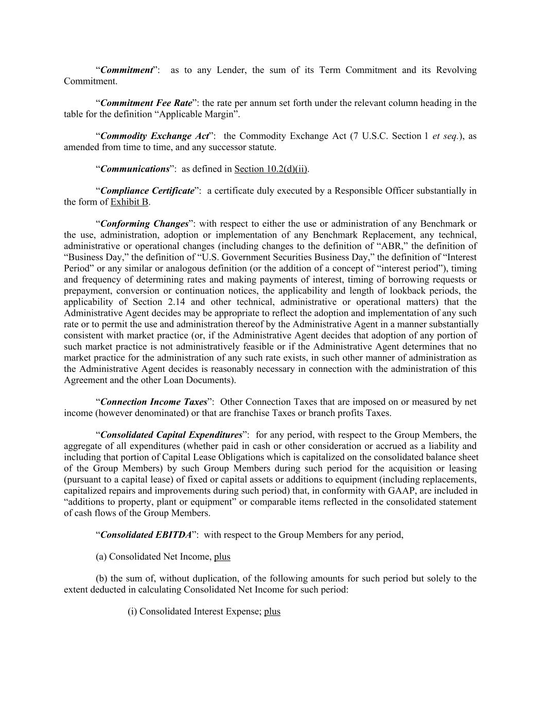 “Commitment”: as to any Lender, the sum of its Term Commitment and its Revolving Commitment. “Commitment Fee Rate”: the rate per annum set forth under the relevant column heading in the table for the definition “Applicable Margin”. “Commodity Exchange Act”: the Commodity Exchange Act (7 U.S.C. Section 1 et seq.), as amended from time to time, and any successor statute. “Communications”: as defined in Section 10.2(d)(ii). “Compliance Certificate”: a certificate duly executed by a Responsible Officer substantially in the form of Exhibit B. “Conforming Changes”: with respect to either the use or administration of any Benchmark or the use, administration, adoption or implementation of any Benchmark Replacement, any technical, administrative or operational changes (including changes to the definition of “ABR,” the definition of “Business Day,” the definition of “U.S. Government Securities Business Day,” the definition of “Interest Period” or any similar or analogous definition (or the addition of a concept of “interest period”), timing and frequency of determining rates and making payments of interest, timing of borrowing requests or prepayment, conversion or continuation notices, the applicability and length of lookback periods, the applicability of Section 2.14 and other technical, administrative or operational matters) that the Administrative Agent decides may be appropriate to reflect the adoption and implementation of any such rate or to permit the use and administration thereof by the Administrative Agent in a manner substantially consistent with market practice (or, if the Administrative Agent decides that adoption of any portion of such market practice is not administratively feasible or if the Administrative Agent determines that no market practice for the administration of any such rate exists, in such other manner of administration as the Administrative Agent decides is reasonably necessary in connection with the administration of this Agreement and the other Loan Documents). “Connection Income Taxes”: Other Connection Taxes that are imposed on or measured by net income (however denominated) or that are franchise Taxes or branch profits Taxes. “Consolidated Capital Expenditures”: for any period, with respect to the Group Members, the aggregate of all expenditures (whether paid in cash or other consideration or accrued as a liability and including that portion of Capital Lease Obligations which is capitalized on the consolidated balance sheet of the Group Members) by such Group Members during such period for the acquisition or leasing (pursuant to a capital lease) of fixed or capital assets or additions to equipment (including replacements, capitalized repairs and improvements during such period) that, in conformity with GAAP, are included in “additions to property, plant or equipment” or comparable items reflected in the consolidated statement of cash flows of the Group Members. “Consolidated EBITDA”: with respect to the Group Members for any period, (a) Consolidated Net Income, plus (b) the sum of, without duplication, of the following amounts for such period but solely to the extent deducted in calculating Consolidated Net Income for such period: (i) Consolidated Interest Expense; plus