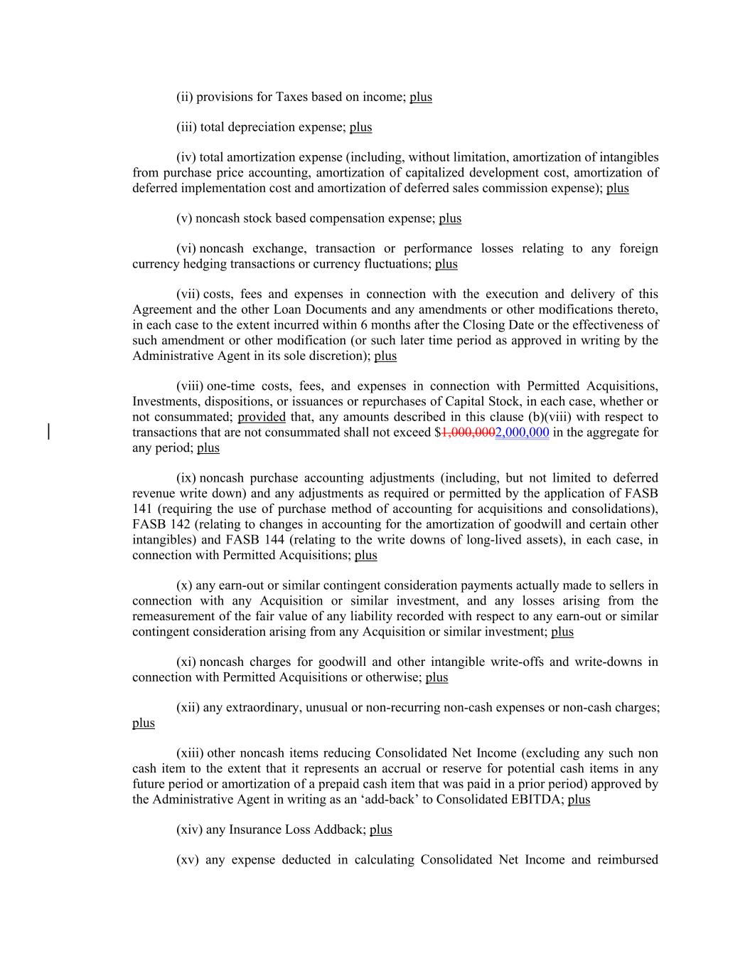 (ii) provisions for Taxes based on income; plus (iii) total depreciation expense; plus (iv) total amortization expense (including, without limitation, amortization of intangibles from purchase price accounting, amortization of capitalized development cost, amortization of deferred implementation cost and amortization of deferred sales commission expense); plus (v) noncash stock based compensation expense; plus (vi) noncash exchange, transaction or performance losses relating to any foreign currency hedging transactions or currency fluctuations; plus (vii) costs, fees and expenses in connection with the execution and delivery of this Agreement and the other Loan Documents and any amendments or other modifications thereto, in each case to the extent incurred within 6 months after the Closing Date or the effectiveness of such amendment or other modification (or such later time period as approved in writing by the Administrative Agent in its sole discretion); plus (viii) one-time costs, fees, and expenses in connection with Permitted Acquisitions, Investments, dispositions, or issuances or repurchases of Capital Stock, in each case, whether or not consummated; provided that, any amounts described in this clause (b)(viii) with respect to transactions that are not consummated shall not exceed $1,000,0002,000,000 in the aggregate for any period; plus (ix) noncash purchase accounting adjustments (including, but not limited to deferred revenue write down) and any adjustments as required or permitted by the application of FASB 141 (requiring the use of purchase method of accounting for acquisitions and consolidations), FASB 142 (relating to changes in accounting for the amortization of goodwill and certain other intangibles) and FASB 144 (relating to the write downs of long-lived assets), in each case, in connection with Permitted Acquisitions; plus (x) any earn-out or similar contingent consideration payments actually made to sellers in connection with any Acquisition or similar investment, and any losses arising from the remeasurement of the fair value of any liability recorded with respect to any earn-out or similar contingent consideration arising from any Acquisition or similar investment; plus (xi) noncash charges for goodwill and other intangible write-offs and write-downs in connection with Permitted Acquisitions or otherwise; plus (xii) any extraordinary, unusual or non-recurring non-cash expenses or non-cash charges; plus (xiii) other noncash items reducing Consolidated Net Income (excluding any such non cash item to the extent that it represents an accrual or reserve for potential cash items in any future period or amortization of a prepaid cash item that was paid in a prior period) approved by the Administrative Agent in writing as an ‘add-back’ to Consolidated EBITDA; plus (xiv) any Insurance Loss Addback; plus (xv) any expense deducted in calculating Consolidated Net Income and reimbursed