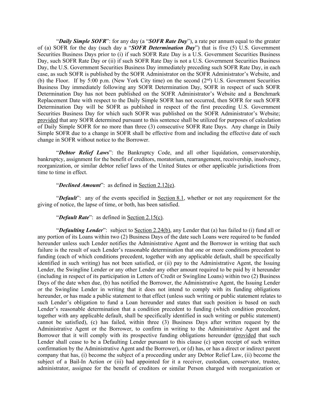 “Daily Simple SOFR”: for any day (a “SOFR Rate Day”), a rate per annum equal to the greater of (a) SOFR for the day (such day a “SOFR Determination Day”) that is five (5) U.S. Government Securities Business Days prior to (i) if such SOFR Rate Day is a U.S. Government Securities Business Day, such SOFR Rate Day or (ii) if such SOFR Rate Day is not a U.S. Government Securities Business Day, the U.S. Government Securities Business Day immediately preceding such SOFR Rate Day, in each case, as such SOFR is published by the SOFR Administrator on the SOFR Administrator’s Website, and (b) the Floor. If by 5:00 p.m. (New York City time) on the second (2nd) U.S. Government Securities Business Day immediately following any SOFR Determination Day, SOFR in respect of such SOFR Determination Day has not been published on the SOFR Administrator’s Website and a Benchmark Replacement Date with respect to the Daily Simple SOFR has not occurred, then SOFR for such SOFR Determination Day will be SOFR as published in respect of the first preceding U.S. Government Securities Business Day for which such SOFR was published on the SOFR Administrator’s Website; provided that any SOFR determined pursuant to this sentence shall be utilized for purposes of calculation of Daily Simple SOFR for no more than three (3) consecutive SOFR Rate Days. Any change in Daily Simple SOFR due to a change in SOFR shall be effective from and including the effective date of such change in SOFR without notice to the Borrower. “Debtor Relief Laws”: the Bankruptcy Code, and all other liquidation, conservatorship, bankruptcy, assignment for the benefit of creditors, moratorium, rearrangement, receivership, insolvency, reorganization, or similar debtor relief laws of the United States or other applicable jurisdictions from time to time in effect. “Declined Amount”: as defined in Section 2.12(e). “Default”: any of the events specified in Section 8.1, whether or not any requirement for the giving of notice, the lapse of time, or both, has been satisfied. “Default Rate”: as defined in Section 2.15(c). “Defaulting Lender”: subject to Section 2.24(b), any Lender that (a) has failed to (i) fund all or any portion of its Loans within two (2) Business Days of the date such Loans were required to be funded hereunder unless such Lender notifies the Administrative Agent and the Borrower in writing that such failure is the result of such Lender’s reasonable determination that one or more conditions precedent to funding (each of which conditions precedent, together with any applicable default, shall be specifically identified in such writing) has not been satisfied, or (ii) pay to the Administrative Agent, the Issuing Lender, the Swingline Lender or any other Lender any other amount required to be paid by it hereunder (including in respect of its participation in Letters of Credit or Swingline Loans) within two (2) Business Days of the date when due, (b) has notified the Borrower, the Administrative Agent, the Issuing Lender or the Swingline Lender in writing that it does not intend to comply with its funding obligations hereunder, or has made a public statement to that effect (unless such writing or public statement relates to such Lender’s obligation to fund a Loan hereunder and states that such position is based on such Lender’s reasonable determination that a condition precedent to funding (which condition precedent, together with any applicable default, shall be specifically identified in such writing or public statement) cannot be satisfied), (c) has failed, within three (3) Business Days after written request by the Administrative Agent or the Borrower, to confirm in writing to the Administrative Agent and the Borrower that it will comply with its prospective funding obligations hereunder (provided that such Lender shall cease to be a Defaulting Lender pursuant to this clause (c) upon receipt of such written confirmation by the Administrative Agent and the Borrower), or (d) has, or has a direct or indirect parent company that has, (i) become the subject of a proceeding under any Debtor Relief Law, (ii) become the subject of a Bail-In Action or (iii) had appointed for it a receiver, custodian, conservator, trustee, administrator, assignee for the benefit of creditors or similar Person charged with reorganization or