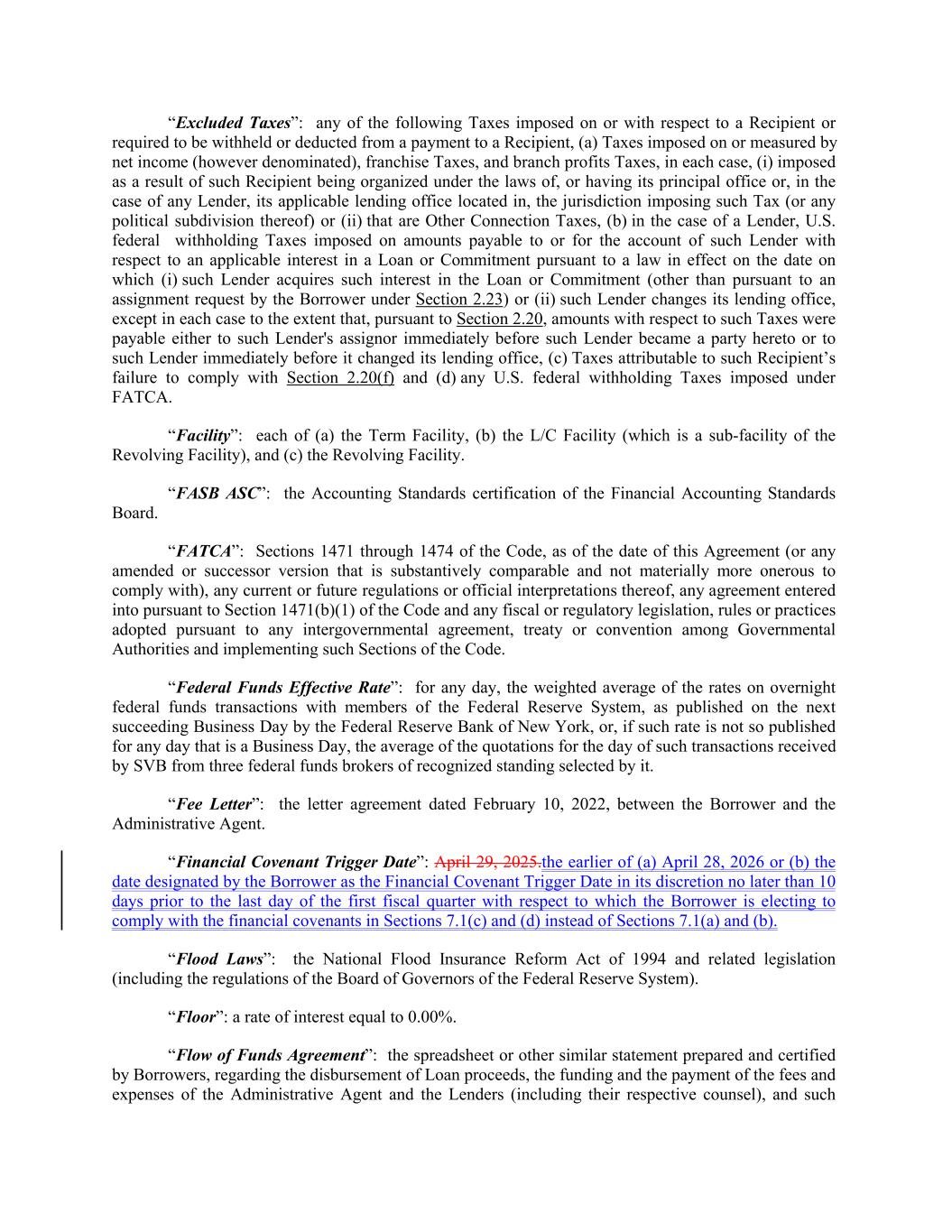“Excluded Taxes”: any of the following Taxes imposed on or with respect to a Recipient or required to be withheld or deducted from a payment to a Recipient, (a) Taxes imposed on or measured by net income (however denominated), franchise Taxes, and branch profits Taxes, in each case, (i) imposed as a result of such Recipient being organized under the laws of, or having its principal office or, in the case of any Lender, its applicable lending office located in, the jurisdiction imposing such Tax (or any political subdivision thereof) or (ii) that are Other Connection Taxes, (b) in the case of a Lender, U.S. federal withholding Taxes imposed on amounts payable to or for the account of such Lender with respect to an applicable interest in a Loan or Commitment pursuant to a law in effect on the date on which (i) such Lender acquires such interest in the Loan or Commitment (other than pursuant to an assignment request by the Borrower under Section 2.23) or (ii) such Lender changes its lending office, except in each case to the extent that, pursuant to Section 2.20, amounts with respect to such Taxes were payable either to such Lender's assignor immediately before such Lender became a party hereto or to such Lender immediately before it changed its lending office, (c) Taxes attributable to such Recipient’s failure to comply with Section 2.20(f) and (d) any U.S. federal withholding Taxes imposed under FATCA. “Facility”: each of (a) the Term Facility, (b) the L/C Facility (which is a sub-facility of the Revolving Facility), and (c) the Revolving Facility. “FASB ASC”: the Accounting Standards certification of the Financial Accounting Standards Board. “FATCA”: Sections 1471 through 1474 of the Code, as of the date of this Agreement (or any amended or successor version that is substantively comparable and not materially more onerous to comply with), any current or future regulations or official interpretations thereof, any agreement entered into pursuant to Section 1471(b)(1) of the Code and any fiscal or regulatory legislation, rules or practices adopted pursuant to any intergovernmental agreement, treaty or convention among Governmental Authorities and implementing such Sections of the Code. “Federal Funds Effective Rate”: for any day, the weighted average of the rates on overnight federal funds transactions with members of the Federal Reserve System, as published on the next succeeding Business Day by the Federal Reserve Bank of New York, or, if such rate is not so published for any day that is a Business Day, the average of the quotations for the day of such transactions received by SVB from three federal funds brokers of recognized standing selected by it. “Fee Letter”: the letter agreement dated February 10, 2022, between the Borrower and the Administrative Agent. “Financial Covenant Trigger Date”: April 29, 2025.the earlier of (a) April 28, 2026 or (b) the date designated by the Borrower as the Financial Covenant Trigger Date in its discretion no later than 10 days prior to the last day of the first fiscal quarter with respect to which the Borrower is electing to comply with the financial covenants in Sections 7.1(c) and (d) instead of Sections 7.1(a) and (b). “Flood Laws”: the National Flood Insurance Reform Act of 1994 and related legislation (including the regulations of the Board of Governors of the Federal Reserve System). “Floor”: a rate of interest equal to 0.00%. “Flow of Funds Agreement”: the spreadsheet or other similar statement prepared and certified by Borrowers, regarding the disbursement of Loan proceeds, the funding and the payment of the fees and expenses of the Administrative Agent and the Lenders (including their respective counsel), and such