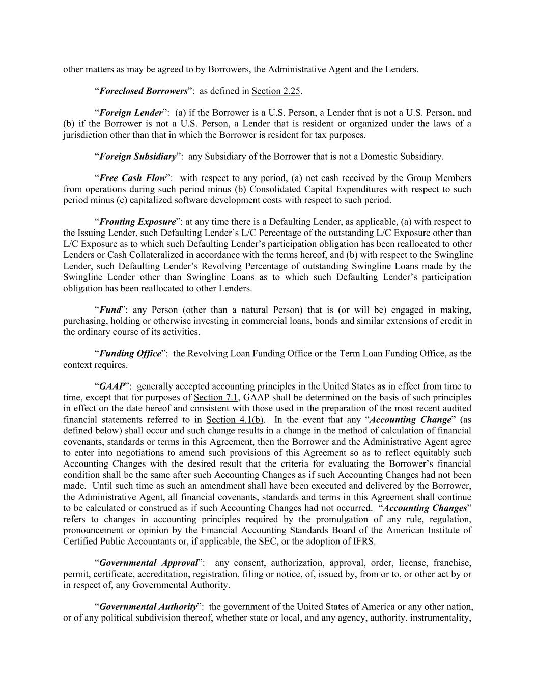 other matters as may be agreed to by Borrowers, the Administrative Agent and the Lenders. “Foreclosed Borrowers”: as defined in Section 2.25. “Foreign Lender”: (a) if the Borrower is a U.S. Person, a Lender that is not a U.S. Person, and (b) if the Borrower is not a U.S. Person, a Lender that is resident or organized under the laws of a jurisdiction other than that in which the Borrower is resident for tax purposes. “Foreign Subsidiary”: any Subsidiary of the Borrower that is not a Domestic Subsidiary. “Free Cash Flow”: with respect to any period, (a) net cash received by the Group Members from operations during such period minus (b) Consolidated Capital Expenditures with respect to such period minus (c) capitalized software development costs with respect to such period. “Fronting Exposure”: at any time there is a Defaulting Lender, as applicable, (a) with respect to the Issuing Lender, such Defaulting Lender’s L/C Percentage of the outstanding L/C Exposure other than L/C Exposure as to which such Defaulting Lender’s participation obligation has been reallocated to other Lenders or Cash Collateralized in accordance with the terms hereof, and (b) with respect to the Swingline Lender, such Defaulting Lender’s Revolving Percentage of outstanding Swingline Loans made by the Swingline Lender other than Swingline Loans as to which such Defaulting Lender’s participation obligation has been reallocated to other Lenders. “Fund”: any Person (other than a natural Person) that is (or will be) engaged in making, purchasing, holding or otherwise investing in commercial loans, bonds and similar extensions of credit in the ordinary course of its activities. “Funding Office”: the Revolving Loan Funding Office or the Term Loan Funding Office, as the context requires. “GAAP”: generally accepted accounting principles in the United States as in effect from time to time, except that for purposes of Section 7.1, GAAP shall be determined on the basis of such principles in effect on the date hereof and consistent with those used in the preparation of the most recent audited financial statements referred to in Section 4.1(b). In the event that any “Accounting Change” (as defined below) shall occur and such change results in a change in the method of calculation of financial covenants, standards or terms in this Agreement, then the Borrower and the Administrative Agent agree to enter into negotiations to amend such provisions of this Agreement so as to reflect equitably such Accounting Changes with the desired result that the criteria for evaluating the Borrower’s financial condition shall be the same after such Accounting Changes as if such Accounting Changes had not been made. Until such time as such an amendment shall have been executed and delivered by the Borrower, the Administrative Agent, all financial covenants, standards and terms in this Agreement shall continue to be calculated or construed as if such Accounting Changes had not occurred. “Accounting Changes” refers to changes in accounting principles required by the promulgation of any rule, regulation, pronouncement or opinion by the Financial Accounting Standards Board of the American Institute of Certified Public Accountants or, if applicable, the SEC, or the adoption of IFRS. “Governmental Approval”: any consent, authorization, approval, order, license, franchise, permit, certificate, accreditation, registration, filing or notice, of, issued by, from or to, or other act by or in respect of, any Governmental Authority. “Governmental Authority”: the government of the United States of America or any other nation, or of any political subdivision thereof, whether state or local, and any agency, authority, instrumentality,