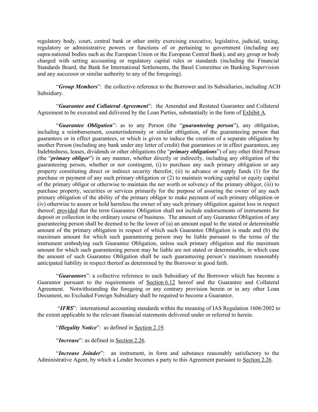 regulatory body, court, central bank or other entity exercising executive, legislative, judicial, taxing, regulatory or administrative powers or functions of or pertaining to government (including any supra-national bodies such as the European Union or the European Central Bank), and any group or body charged with setting accounting or regulatory capital rules or standards (including the Financial Standards Board, the Bank for International Settlements, the Basel Committee on Banking Supervision and any successor or similar authority to any of the foregoing). “Group Members”: the collective reference to the Borrower and its Subsidiaries, including ACH Subsidiary. “Guarantee and Collateral Agreement”: the Amended and Restated Guarantee and Collateral Agreement to be executed and delivered by the Loan Parties, substantially in the form of Exhibit A. “Guarantee Obligation”: as to any Person (the “guaranteeing person”), any obligation, including a reimbursement, counterindemnity or similar obligation, of the guaranteeing person that guarantees or in effect guarantees, or which is given to induce the creation of a separate obligation by another Person (including any bank under any letter of credit) that guarantees or in effect guarantees, any Indebtedness, leases, dividends or other obligations (the “primary obligations”) of any other third Person (the “primary obligor”) in any manner, whether directly or indirectly, including any obligation of the guaranteeing person, whether or not contingent, (i) to purchase any such primary obligation or any property constituting direct or indirect security therefor, (ii) to advance or supply funds (1) for the purchase or payment of any such primary obligation or (2) to maintain working capital or equity capital of the primary obligor or otherwise to maintain the net worth or solvency of the primary obligor, (iii) to purchase property, securities or services primarily for the purpose of assuring the owner of any such primary obligation of the ability of the primary obligor to make payment of such primary obligation or (iv) otherwise to assure or hold harmless the owner of any such primary obligation against loss in respect thereof; provided that the term Guarantee Obligation shall not include endorsements of instruments for deposit or collection in the ordinary course of business. The amount of any Guarantee Obligation of any guaranteeing person shall be deemed to be the lower of (a) an amount equal to the stated or determinable amount of the primary obligation in respect of which such Guarantee Obligation is made and (b) the maximum amount for which such guaranteeing person may be liable pursuant to the terms of the instrument embodying such Guarantee Obligation, unless such primary obligation and the maximum amount for which such guaranteeing person may be liable are not stated or determinable, in which case the amount of such Guarantee Obligation shall be such guaranteeing person’s maximum reasonably anticipated liability in respect thereof as determined by the Borrower in good faith. “Guarantors”: a collective reference to each Subsidiary of the Borrower which has become a Guarantor pursuant to the requirements of Section 6.12 hereof and the Guarantee and Collateral Agreement. Notwithstanding the foregoing or any contrary provision herein or in any other Loan Document, no Excluded Foreign Subsidiary shall be required to become a Guarantor. “IFRS”: international accounting standards within the meaning of IAS Regulation 1606/2002 to the extent applicable to the relevant financial statements delivered under or referred to herein. “Illegality Notice”: as defined in Section 2.19. “Increase”: as defined in Section 2.26. “Increase Joinder”: an instrument, in form and substance reasonably satisfactory to the Administrative Agent, by which a Lender becomes a party to this Agreement pursuant to Section 2.26.