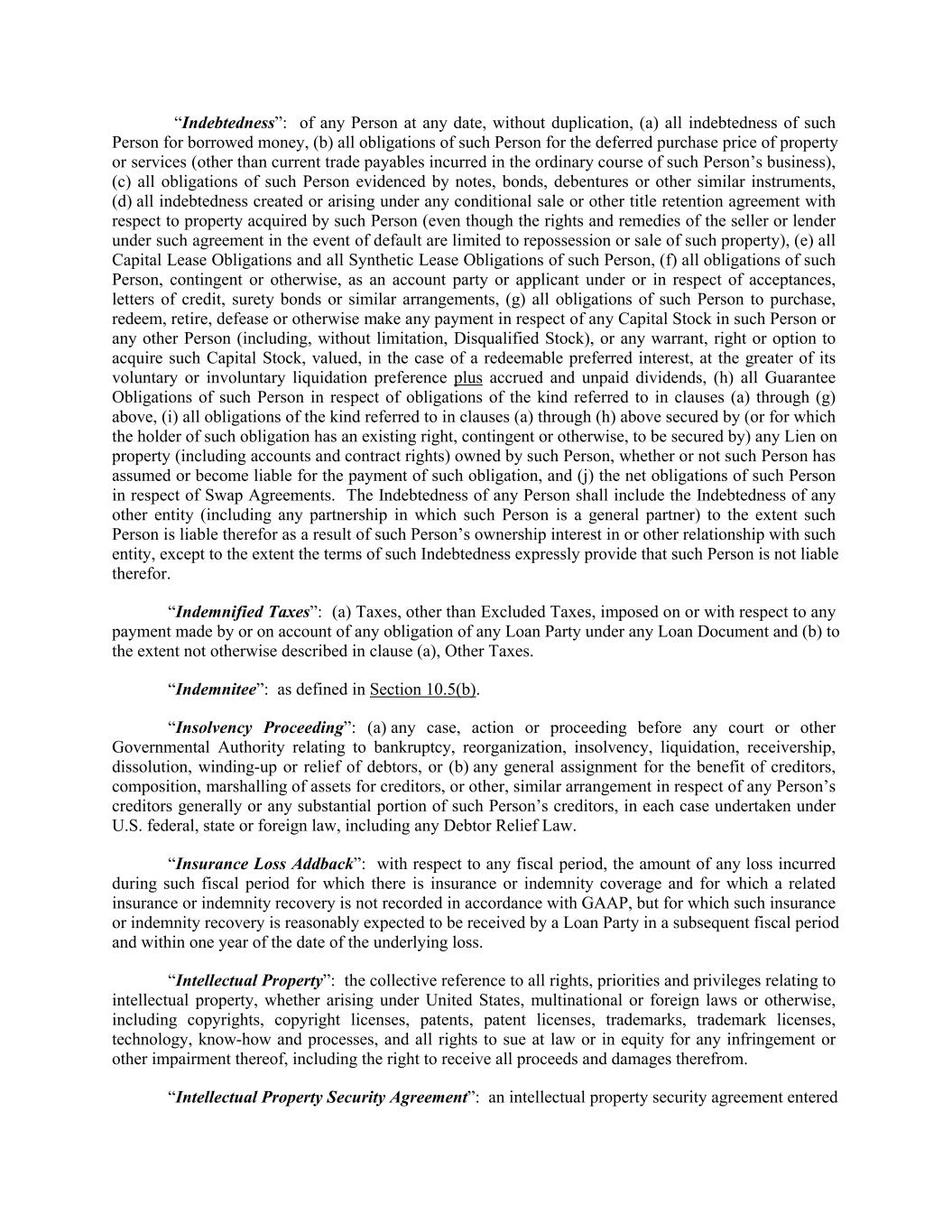 “Indebtedness”: of any Person at any date, without duplication, (a) all indebtedness of such Person for borrowed money, (b) all obligations of such Person for the deferred purchase price of property or services (other than current trade payables incurred in the ordinary course of such Person’s business), (c) all obligations of such Person evidenced by notes, bonds, debentures or other similar instruments, (d) all indebtedness created or arising under any conditional sale or other title retention agreement with respect to property acquired by such Person (even though the rights and remedies of the seller or lender under such agreement in the event of default are limited to repossession or sale of such property), (e) all Capital Lease Obligations and all Synthetic Lease Obligations of such Person, (f) all obligations of such Person, contingent or otherwise, as an account party or applicant under or in respect of acceptances, letters of credit, surety bonds or similar arrangements, (g) all obligations of such Person to purchase, redeem, retire, defease or otherwise make any payment in respect of any Capital Stock in such Person or any other Person (including, without limitation, Disqualified Stock), or any warrant, right or option to acquire such Capital Stock, valued, in the case of a redeemable preferred interest, at the greater of its voluntary or involuntary liquidation preference plus accrued and unpaid dividends, (h) all Guarantee Obligations of such Person in respect of obligations of the kind referred to in clauses (a) through (g) above, (i) all obligations of the kind referred to in clauses (a) through (h) above secured by (or for which the holder of such obligation has an existing right, contingent or otherwise, to be secured by) any Lien on property (including accounts and contract rights) owned by such Person, whether or not such Person has assumed or become liable for the payment of such obligation, and (j) the net obligations of such Person in respect of Swap Agreements. The Indebtedness of any Person shall include the Indebtedness of any other entity (including any partnership in which such Person is a general partner) to the extent such Person is liable therefor as a result of such Person’s ownership interest in or other relationship with such entity, except to the extent the terms of such Indebtedness expressly provide that such Person is not liable therefor. “Indemnified Taxes”: (a) Taxes, other than Excluded Taxes, imposed on or with respect to any payment made by or on account of any obligation of any Loan Party under any Loan Document and (b) to the extent not otherwise described in clause (a), Other Taxes. “Indemnitee”: as defined in Section 10.5(b). “Insolvency Proceeding”: (a) any case, action or proceeding before any court or other Governmental Authority relating to bankruptcy, reorganization, insolvency, liquidation, receivership, dissolution, winding-up or relief of debtors, or (b) any general assignment for the benefit of creditors, composition, marshalling of assets for creditors, or other, similar arrangement in respect of any Person’s creditors generally or any substantial portion of such Person’s creditors, in each case undertaken under U.S. federal, state or foreign law, including any Debtor Relief Law. “Insurance Loss Addback”: with respect to any fiscal period, the amount of any loss incurred during such fiscal period for which there is insurance or indemnity coverage and for which a related insurance or indemnity recovery is not recorded in accordance with GAAP, but for which such insurance or indemnity recovery is reasonably expected to be received by a Loan Party in a subsequent fiscal period and within one year of the date of the underlying loss. “Intellectual Property”: the collective reference to all rights, priorities and privileges relating to intellectual property, whether arising under United States, multinational or foreign laws or otherwise, including copyrights, copyright licenses, patents, patent licenses, trademarks, trademark licenses, technology, know-how and processes, and all rights to sue at law or in equity for any infringement or other impairment thereof, including the right to receive all proceeds and damages therefrom. “Intellectual Property Security Agreement”: an intellectual property security agreement entered