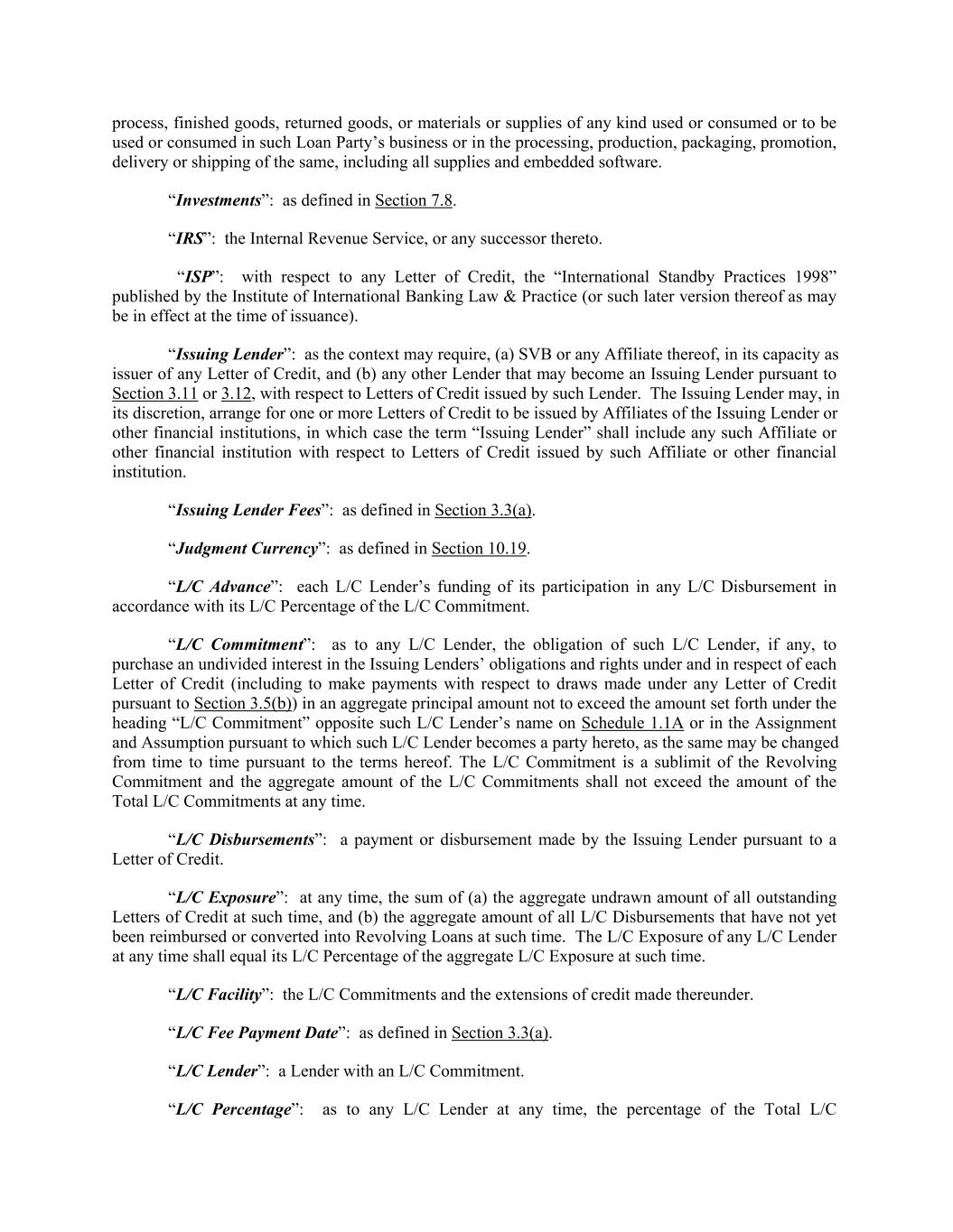 process, finished goods, returned goods, or materials or supplies of any kind used or consumed or to be used or consumed in such Loan Party’s business or in the processing, production, packaging, promotion, delivery or shipping of the same, including all supplies and embedded software. “Investments”: as defined in Section 7.8. “IRS”: the Internal Revenue Service, or any successor thereto. “ISP”: with respect to any Letter of Credit, the “International Standby Practices 1998” published by the Institute of International Banking Law & Practice (or such later version thereof as may be in effect at the time of issuance). “Issuing Lender”: as the context may require, (a) SVB or any Affiliate thereof, in its capacity as issuer of any Letter of Credit, and (b) any other Lender that may become an Issuing Lender pursuant to Section 3.11 or 3.12, with respect to Letters of Credit issued by such Lender. The Issuing Lender may, in its discretion, arrange for one or more Letters of Credit to be issued by Affiliates of the Issuing Lender or other financial institutions, in which case the term “Issuing Lender” shall include any such Affiliate or other financial institution with respect to Letters of Credit issued by such Affiliate or other financial institution. “Issuing Lender Fees”: as defined in Section 3.3(a). “Judgment Currency”: as defined in Section 10.19. “L/C Advance”: each L/C Lender’s funding of its participation in any L/C Disbursement in accordance with its L/C Percentage of the L/C Commitment. “L/C Commitment”: as to any L/C Lender, the obligation of such L/C Lender, if any, to purchase an undivided interest in the Issuing Lenders’ obligations and rights under and in respect of each Letter of Credit (including to make payments with respect to draws made under any Letter of Credit pursuant to Section 3.5(b)) in an aggregate principal amount not to exceed the amount set forth under the heading “L/C Commitment” opposite such L/C Lender’s name on Schedule 1.1A or in the Assignment and Assumption pursuant to which such L/C Lender becomes a party hereto, as the same may be changed from time to time pursuant to the terms hereof. The L/C Commitment is a sublimit of the Revolving Commitment and the aggregate amount of the L/C Commitments shall not exceed the amount of the Total L/C Commitments at any time. “L/C Disbursements”: a payment or disbursement made by the Issuing Lender pursuant to a Letter of Credit. “L/C Exposure”: at any time, the sum of (a) the aggregate undrawn amount of all outstanding Letters of Credit at such time, and (b) the aggregate amount of all L/C Disbursements that have not yet been reimbursed or converted into Revolving Loans at such time. The L/C Exposure of any L/C Lender at any time shall equal its L/C Percentage of the aggregate L/C Exposure at such time. “L/C Facility”: the L/C Commitments and the extensions of credit made thereunder. “L/C Fee Payment Date”: as defined in Section 3.3(a). “L/C Lender”: a Lender with an L/C Commitment. “L/C Percentage”: as to any L/C Lender at any time, the percentage of the Total L/C