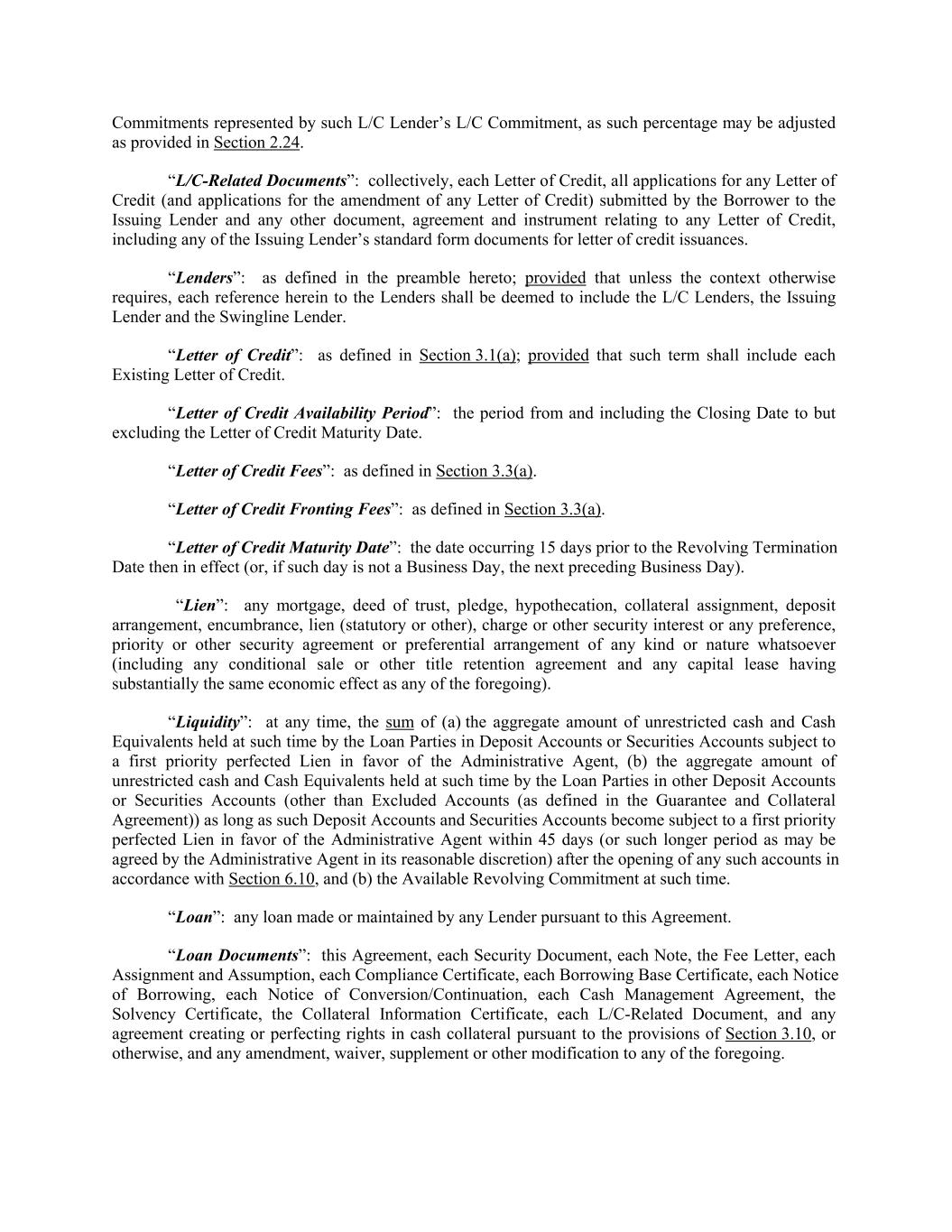 Commitments represented by such L/C Lender’s L/C Commitment, as such percentage may be adjusted as provided in Section 2.24. “L/C-Related Documents”: collectively, each Letter of Credit, all applications for any Letter of Credit (and applications for the amendment of any Letter of Credit) submitted by the Borrower to the Issuing Lender and any other document, agreement and instrument relating to any Letter of Credit, including any of the Issuing Lender’s standard form documents for letter of credit issuances. “Lenders”: as defined in the preamble hereto; provided that unless the context otherwise requires, each reference herein to the Lenders shall be deemed to include the L/C Lenders, the Issuing Lender and the Swingline Lender. “Letter of Credit”: as defined in Section 3.1(a); provided that such term shall include each Existing Letter of Credit. “Letter of Credit Availability Period”: the period from and including the Closing Date to but excluding the Letter of Credit Maturity Date. “Letter of Credit Fees”: as defined in Section 3.3(a). “Letter of Credit Fronting Fees”: as defined in Section 3.3(a). “Letter of Credit Maturity Date”: the date occurring 15 days prior to the Revolving Termination Date then in effect (or, if such day is not a Business Day, the next preceding Business Day). “Lien”: any mortgage, deed of trust, pledge, hypothecation, collateral assignment, deposit arrangement, encumbrance, lien (statutory or other), charge or other security interest or any preference, priority or other security agreement or preferential arrangement of any kind or nature whatsoever (including any conditional sale or other title retention agreement and any capital lease having substantially the same economic effect as any of the foregoing). “Liquidity”: at any time, the sum of (a) the aggregate amount of unrestricted cash and Cash Equivalents held at such time by the Loan Parties in Deposit Accounts or Securities Accounts subject to a first priority perfected Lien in favor of the Administrative Agent, (b) the aggregate amount of unrestricted cash and Cash Equivalents held at such time by the Loan Parties in other Deposit Accounts or Securities Accounts (other than Excluded Accounts (as defined in the Guarantee and Collateral Agreement)) as long as such Deposit Accounts and Securities Accounts become subject to a first priority perfected Lien in favor of the Administrative Agent within 45 days (or such longer period as may be agreed by the Administrative Agent in its reasonable discretion) after the opening of any such accounts in accordance with Section 6.10, and (b) the Available Revolving Commitment at such time. “Loan”: any loan made or maintained by any Lender pursuant to this Agreement. “Loan Documents”: this Agreement, each Security Document, each Note, the Fee Letter, each Assignment and Assumption, each Compliance Certificate, each Borrowing Base Certificate, each Notice of Borrowing, each Notice of Conversion/Continuation, each Cash Management Agreement, the Solvency Certificate, the Collateral Information Certificate, each L/C-Related Document, and any agreement creating or perfecting rights in cash collateral pursuant to the provisions of Section 3.10, or otherwise, and any amendment, waiver, supplement or other modification to any of the foregoing.