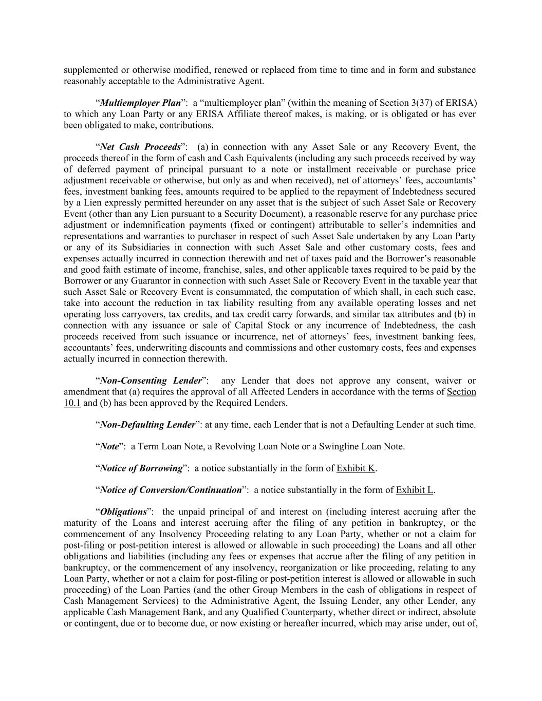 supplemented or otherwise modified, renewed or replaced from time to time and in form and substance reasonably acceptable to the Administrative Agent. “Multiemployer Plan”: a “multiemployer plan” (within the meaning of Section 3(37) of ERISA) to which any Loan Party or any ERISA Affiliate thereof makes, is making, or is obligated or has ever been obligated to make, contributions. “Net Cash Proceeds”: (a) in connection with any Asset Sale or any Recovery Event, the proceeds thereof in the form of cash and Cash Equivalents (including any such proceeds received by way of deferred payment of principal pursuant to a note or installment receivable or purchase price adjustment receivable or otherwise, but only as and when received), net of attorneys’ fees, accountants’ fees, investment banking fees, amounts required to be applied to the repayment of Indebtedness secured by a Lien expressly permitted hereunder on any asset that is the subject of such Asset Sale or Recovery Event (other than any Lien pursuant to a Security Document), a reasonable reserve for any purchase price adjustment or indemnification payments (fixed or contingent) attributable to seller’s indemnities and representations and warranties to purchaser in respect of such Asset Sale undertaken by any Loan Party or any of its Subsidiaries in connection with such Asset Sale and other customary costs, fees and expenses actually incurred in connection therewith and net of taxes paid and the Borrower’s reasonable and good faith estimate of income, franchise, sales, and other applicable taxes required to be paid by the Borrower or any Guarantor in connection with such Asset Sale or Recovery Event in the taxable year that such Asset Sale or Recovery Event is consummated, the computation of which shall, in each such case, take into account the reduction in tax liability resulting from any available operating losses and net operating loss carryovers, tax credits, and tax credit carry forwards, and similar tax attributes and (b) in connection with any issuance or sale of Capital Stock or any incurrence of Indebtedness, the cash proceeds received from such issuance or incurrence, net of attorneys’ fees, investment banking fees, accountants’ fees, underwriting discounts and commissions and other customary costs, fees and expenses actually incurred in connection therewith. “Non-Consenting Lender”: any Lender that does not approve any consent, waiver or amendment that (a) requires the approval of all Affected Lenders in accordance with the terms of Section 10.1 and (b) has been approved by the Required Lenders. “Non-Defaulting Lender”: at any time, each Lender that is not a Defaulting Lender at such time. “Note”: a Term Loan Note, a Revolving Loan Note or a Swingline Loan Note. “Notice of Borrowing”: a notice substantially in the form of Exhibit K. “Notice of Conversion/Continuation”: a notice substantially in the form of Exhibit L. “Obligations”: the unpaid principal of and interest on (including interest accruing after the maturity of the Loans and interest accruing after the filing of any petition in bankruptcy, or the commencement of any Insolvency Proceeding relating to any Loan Party, whether or not a claim for post-filing or post-petition interest is allowed or allowable in such proceeding) the Loans and all other obligations and liabilities (including any fees or expenses that accrue after the filing of any petition in bankruptcy, or the commencement of any insolvency, reorganization or like proceeding, relating to any Loan Party, whether or not a claim for post-filing or post-petition interest is allowed or allowable in such proceeding) of the Loan Parties (and the other Group Members in the cash of obligations in respect of Cash Management Services) to the Administrative Agent, the Issuing Lender, any other Lender, any applicable Cash Management Bank, and any Qualified Counterparty, whether direct or indirect, absolute or contingent, due or to become due, or now existing or hereafter incurred, which may arise under, out of,