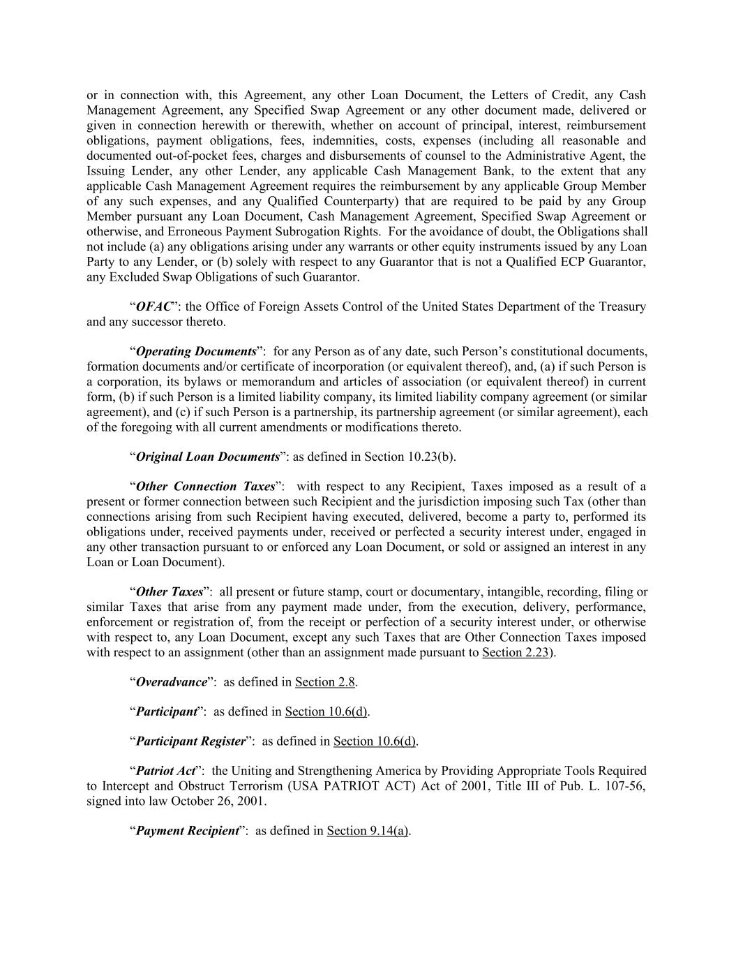 or in connection with, this Agreement, any other Loan Document, the Letters of Credit, any Cash Management Agreement, any Specified Swap Agreement or any other document made, delivered or given in connection herewith or therewith, whether on account of principal, interest, reimbursement obligations, payment obligations, fees, indemnities, costs, expenses (including all reasonable and documented out-of-pocket fees, charges and disbursements of counsel to the Administrative Agent, the Issuing Lender, any other Lender, any applicable Cash Management Bank, to the extent that any applicable Cash Management Agreement requires the reimbursement by any applicable Group Member of any such expenses, and any Qualified Counterparty) that are required to be paid by any Group Member pursuant any Loan Document, Cash Management Agreement, Specified Swap Agreement or otherwise, and Erroneous Payment Subrogation Rights. For the avoidance of doubt, the Obligations shall not include (a) any obligations arising under any warrants or other equity instruments issued by any Loan Party to any Lender, or (b) solely with respect to any Guarantor that is not a Qualified ECP Guarantor, any Excluded Swap Obligations of such Guarantor. “OFAC”: the Office of Foreign Assets Control of the United States Department of the Treasury and any successor thereto. “Operating Documents”: for any Person as of any date, such Person’s constitutional documents, formation documents and/or certificate of incorporation (or equivalent thereof), and, (a) if such Person is a corporation, its bylaws or memorandum and articles of association (or equivalent thereof) in current form, (b) if such Person is a limited liability company, its limited liability company agreement (or similar agreement), and (c) if such Person is a partnership, its partnership agreement (or similar agreement), each of the foregoing with all current amendments or modifications thereto. “Original Loan Documents”: as defined in Section 10.23(b). “Other Connection Taxes”: with respect to any Recipient, Taxes imposed as a result of a present or former connection between such Recipient and the jurisdiction imposing such Tax (other than connections arising from such Recipient having executed, delivered, become a party to, performed its obligations under, received payments under, received or perfected a security interest under, engaged in any other transaction pursuant to or enforced any Loan Document, or sold or assigned an interest in any Loan or Loan Document). “Other Taxes”: all present or future stamp, court or documentary, intangible, recording, filing or similar Taxes that arise from any payment made under, from the execution, delivery, performance, enforcement or registration of, from the receipt or perfection of a security interest under, or otherwise with respect to, any Loan Document, except any such Taxes that are Other Connection Taxes imposed with respect to an assignment (other than an assignment made pursuant to Section 2.23). “Overadvance”: as defined in Section 2.8. “Participant”: as defined in Section 10.6(d). “Participant Register”: as defined in Section 10.6(d). “Patriot Act”: the Uniting and Strengthening America by Providing Appropriate Tools Required to Intercept and Obstruct Terrorism (USA PATRIOT ACT) Act of 2001, Title III of Pub. L. 107-56, signed into law October 26, 2001. “Payment Recipient”: as defined in Section 9.14(a).