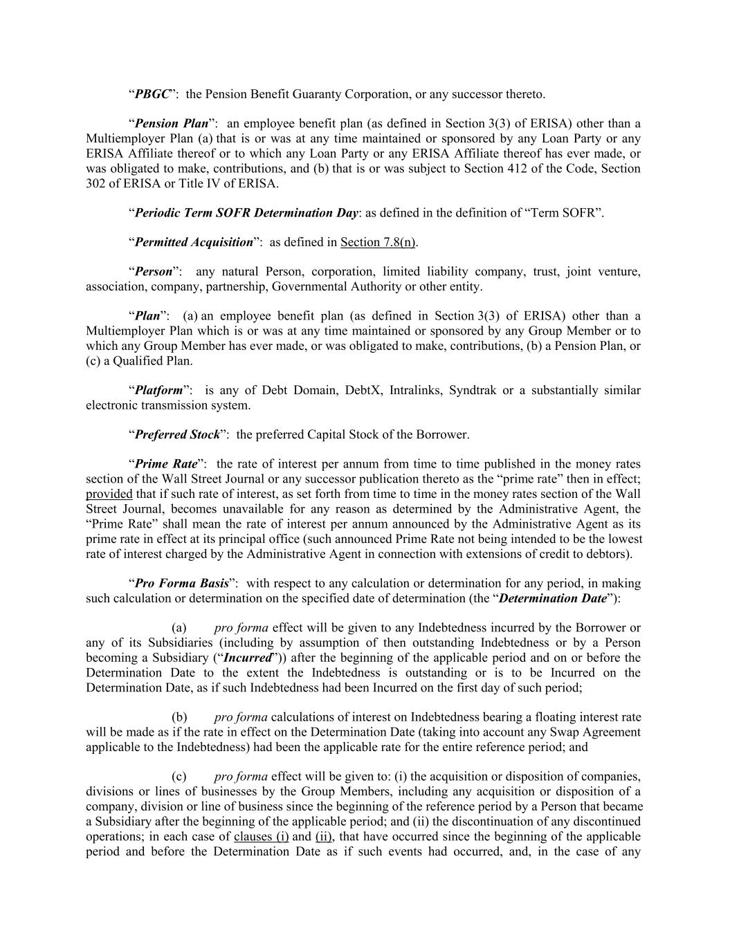 “PBGC”: the Pension Benefit Guaranty Corporation, or any successor thereto. “Pension Plan”: an employee benefit plan (as defined in Section 3(3) of ERISA) other than a Multiemployer Plan (a) that is or was at any time maintained or sponsored by any Loan Party or any ERISA Affiliate thereof or to which any Loan Party or any ERISA Affiliate thereof has ever made, or was obligated to make, contributions, and (b) that is or was subject to Section 412 of the Code, Section 302 of ERISA or Title IV of ERISA. “Periodic Term SOFR Determination Day: as defined in the definition of “Term SOFR”. “Permitted Acquisition”: as defined in Section 7.8(n). “Person”: any natural Person, corporation, limited liability company, trust, joint venture, association, company, partnership, Governmental Authority or other entity. “Plan”: (a) an employee benefit plan (as defined in Section 3(3) of ERISA) other than a Multiemployer Plan which is or was at any time maintained or sponsored by any Group Member or to which any Group Member has ever made, or was obligated to make, contributions, (b) a Pension Plan, or (c) a Qualified Plan. “Platform”: is any of Debt Domain, DebtX, Intralinks, Syndtrak or a substantially similar electronic transmission system. “Preferred Stock”: the preferred Capital Stock of the Borrower. “Prime Rate”: the rate of interest per annum from time to time published in the money rates section of the Wall Street Journal or any successor publication thereto as the “prime rate” then in effect; provided that if such rate of interest, as set forth from time to time in the money rates section of the Wall Street Journal, becomes unavailable for any reason as determined by the Administrative Agent, the “Prime Rate” shall mean the rate of interest per annum announced by the Administrative Agent as its prime rate in effect at its principal office (such announced Prime Rate not being intended to be the lowest rate of interest charged by the Administrative Agent in connection with extensions of credit to debtors). “Pro Forma Basis”: with respect to any calculation or determination for any period, in making such calculation or determination on the specified date of determination (the “Determination Date”): (a) pro forma effect will be given to any Indebtedness incurred by the Borrower or any of its Subsidiaries (including by assumption of then outstanding Indebtedness or by a Person becoming a Subsidiary (“Incurred”)) after the beginning of the applicable period and on or before the Determination Date to the extent the Indebtedness is outstanding or is to be Incurred on the Determination Date, as if such Indebtedness had been Incurred on the first day of such period; (b) pro forma calculations of interest on Indebtedness bearing a floating interest rate will be made as if the rate in effect on the Determination Date (taking into account any Swap Agreement applicable to the Indebtedness) had been the applicable rate for the entire reference period; and (c) pro forma effect will be given to: (i) the acquisition or disposition of companies, divisions or lines of businesses by the Group Members, including any acquisition or disposition of a company, division or line of business since the beginning of the reference period by a Person that became a Subsidiary after the beginning of the applicable period; and (ii) the discontinuation of any discontinued operations; in each case of clauses (i) and (ii), that have occurred since the beginning of the applicable period and before the Determination Date as if such events had occurred, and, in the case of any