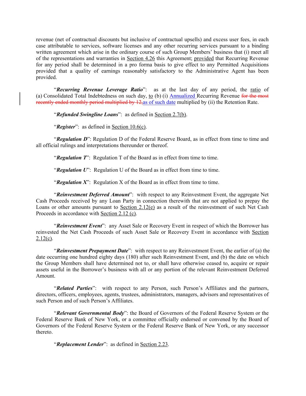 revenue (net of contractual discounts but inclusive of contractual upsells) and excess user fees, in each case attributable to services, software licenses and any other recurring services pursuant to a binding written agreement which arise in the ordinary course of such Group Members’ business that (i) meet all of the representations and warranties in Section 4.26 this Agreement; provided that Recurring Revenue for any period shall be determined in a pro forma basis to give effect to any Permitted Acquisitions provided that a quality of earnings reasonably satisfactory to the Administrative Agent has been provided. “Recurring Revenue Leverage Ratio”: as at the last day of any period, the ratio of (a) Consolidated Total Indebtedness on such day, to (b) (i) Annualized Recurring Revenue for the most recently ended monthly period multiplied by 12,as of such date multiplied by (ii) the Retention Rate. “Refunded Swingline Loans”: as defined in Section 2.7(b). “Register”: as defined in Section 10.6(c). “Regulation D”: Regulation D of the Federal Reserve Board, as in effect from time to time and all official rulings and interpretations thereunder or thereof. “Regulation T”: Regulation T of the Board as in effect from time to time. “Regulation U”: Regulation U of the Board as in effect from time to time. “Regulation X”: Regulation X of the Board as in effect from time to time. “Reinvestment Deferred Amount”: with respect to any Reinvestment Event, the aggregate Net Cash Proceeds received by any Loan Party in connection therewith that are not applied to prepay the Loans or other amounts pursuant to Section 2.12(e) as a result of the reinvestment of such Net Cash Proceeds in accordance with Section 2.12 (c). “Reinvestment Event”: any Asset Sale or Recovery Event in respect of which the Borrower has reinvested the Net Cash Proceeds of such Asset Sale or Recovery Event in accordance with Section 2.12(c). “Reinvestment Prepayment Date”: with respect to any Reinvestment Event, the earlier of (a) the date occurring one hundred eighty days (180) after such Reinvestment Event, and (b) the date on which the Group Members shall have determined not to, or shall have otherwise ceased to, acquire or repair assets useful in the Borrower’s business with all or any portion of the relevant Reinvestment Deferred Amount. “Related Parties”: with respect to any Person, such Person’s Affiliates and the partners, directors, officers, employees, agents, trustees, administrators, managers, advisors and representatives of such Person and of such Person’s Affiliates. “Relevant Governmental Body”: the Board of Governors of the Federal Reserve System or the Federal Reserve Bank of New York, or a committee officially endorsed or convened by the Board of Governors of the Federal Reserve System or the Federal Reserve Bank of New York, or any successor thereto. “Replacement Lender”: as defined in Section 2.23.