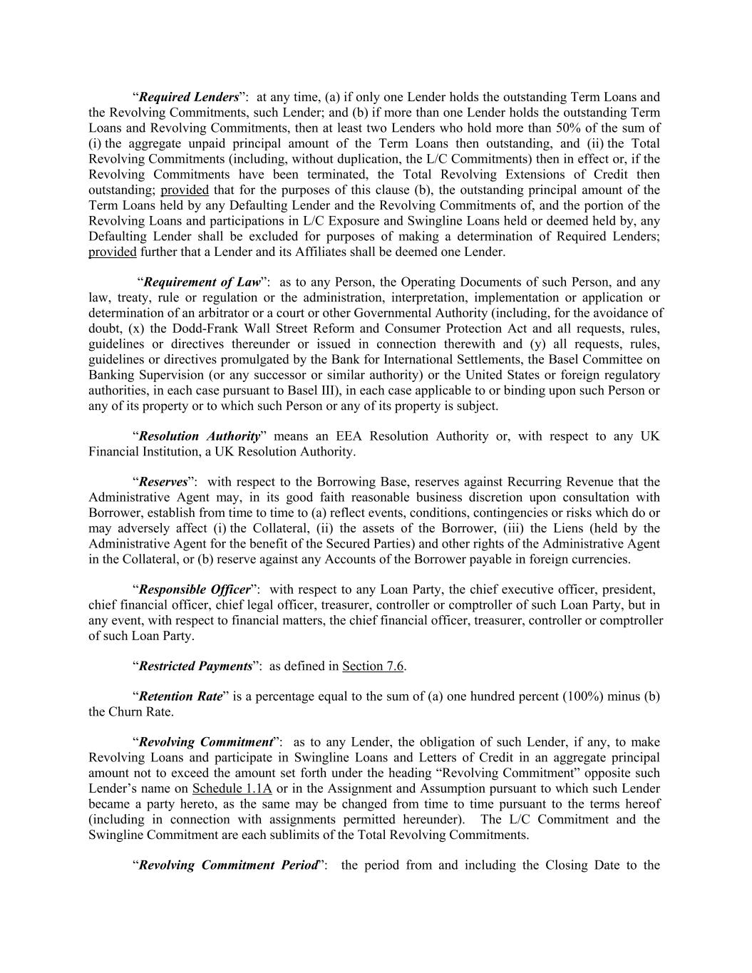 “Required Lenders”: at any time, (a) if only one Lender holds the outstanding Term Loans and the Revolving Commitments, such Lender; and (b) if more than one Lender holds the outstanding Term Loans and Revolving Commitments, then at least two Lenders who hold more than 50% of the sum of (i) the aggregate unpaid principal amount of the Term Loans then outstanding, and (ii) the Total Revolving Commitments (including, without duplication, the L/C Commitments) then in effect or, if the Revolving Commitments have been terminated, the Total Revolving Extensions of Credit then outstanding; provided that for the purposes of this clause (b), the outstanding principal amount of the Term Loans held by any Defaulting Lender and the Revolving Commitments of, and the portion of the Revolving Loans and participations in L/C Exposure and Swingline Loans held or deemed held by, any Defaulting Lender shall be excluded for purposes of making a determination of Required Lenders; provided further that a Lender and its Affiliates shall be deemed one Lender. “Requirement of Law”: as to any Person, the Operating Documents of such Person, and any law, treaty, rule or regulation or the administration, interpretation, implementation or application or determination of an arbitrator or a court or other Governmental Authority (including, for the avoidance of doubt, (x) the Dodd-Frank Wall Street Reform and Consumer Protection Act and all requests, rules, guidelines or directives thereunder or issued in connection therewith and (y) all requests, rules, guidelines or directives promulgated by the Bank for International Settlements, the Basel Committee on Banking Supervision (or any successor or similar authority) or the United States or foreign regulatory authorities, in each case pursuant to Basel III), in each case applicable to or binding upon such Person or any of its property or to which such Person or any of its property is subject. “Resolution Authority” means an EEA Resolution Authority or, with respect to any UK Financial Institution, a UK Resolution Authority. “Reserves”: with respect to the Borrowing Base, reserves against Recurring Revenue that the Administrative Agent may, in its good faith reasonable business discretion upon consultation with Borrower, establish from time to time to (a) reflect events, conditions, contingencies or risks which do or may adversely affect (i) the Collateral, (ii) the assets of the Borrower, (iii) the Liens (held by the Administrative Agent for the benefit of the Secured Parties) and other rights of the Administrative Agent in the Collateral, or (b) reserve against any Accounts of the Borrower payable in foreign currencies. “Responsible Officer”: with respect to any Loan Party, the chief executive officer, president, chief financial officer, chief legal officer, treasurer, controller or comptroller of such Loan Party, but in any event, with respect to financial matters, the chief financial officer, treasurer, controller or comptroller of such Loan Party. “Restricted Payments”: as defined in Section 7.6. “Retention Rate” is a percentage equal to the sum of (a) one hundred percent (100%) minus (b) the Churn Rate. “Revolving Commitment”: as to any Lender, the obligation of such Lender, if any, to make Revolving Loans and participate in Swingline Loans and Letters of Credit in an aggregate principal amount not to exceed the amount set forth under the heading “Revolving Commitment” opposite such Lender’s name on Schedule 1.1A or in the Assignment and Assumption pursuant to which such Lender became a party hereto, as the same may be changed from time to time pursuant to the terms hereof (including in connection with assignments permitted hereunder). The L/C Commitment and the Swingline Commitment are each sublimits of the Total Revolving Commitments. “Revolving Commitment Period”: the period from and including the Closing Date to the