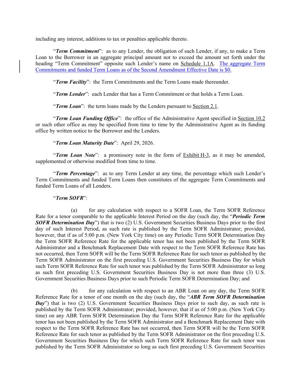 including any interest, additions to tax or penalties applicable thereto. “Term Commitment”: as to any Lender, the obligation of such Lender, if any, to make a Term Loan to the Borrower in an aggregate principal amount not to exceed the amount set forth under the heading “Term Commitment” opposite such Lender’s name on Schedule 1.1A. The aggregate Term Commitments and funded Term Loans as of the Second Amendment Effective Date is $0. “Term Facility”: the Term Commitments and the Term Loans made thereunder. “Term Lender”: each Lender that has a Term Commitment or that holds a Term Loan. “Term Loan”: the term loans made by the Lenders pursuant to Section 2.1. “Term Loan Funding Office”: the office of the Administrative Agent specified in Section 10.2 or such other office as may be specified from time to time by the Administrative Agent as its funding office by written notice to the Borrower and the Lenders. “Term Loan Maturity Date”: April 29, 2026. “Term Loan Note”: a promissory note in the form of Exhibit H-3, as it may be amended, supplemented or otherwise modified from time to time. “Term Percentage”: as to any Term Lender at any time, the percentage which such Lender’s Term Commitments and funded Term Loans then constitutes of the aggregate Term Commitments and funded Term Loans of all Lenders. “Term SOFR”: (a) for any calculation with respect to a SOFR Loan, the Term SOFR Reference Rate for a tenor comparable to the applicable Interest Period on the day (such day, the “Periodic Term SOFR Determination Day”) that is two (2) U.S. Government Securities Business Days prior to the first day of such Interest Period, as such rate is published by the Term SOFR Administrator; provided, however, that if as of 5:00 p.m. (New York City time) on any Periodic Term SOFR Determination Day the Term SOFR Reference Rate for the applicable tenor has not been published by the Term SOFR Administrator and a Benchmark Replacement Date with respect to the Term SOFR Reference Rate has not occurred, then Term SOFR will be the Term SOFR Reference Rate for such tenor as published by the Term SOFR Administrator on the first preceding U.S. Government Securities Business Day for which such Term SOFR Reference Rate for such tenor was published by the Term SOFR Administrator so long as such first preceding U.S. Government Securities Business Day is not more than three (3) U.S. Government Securities Business Days prior to such Periodic Term SOFR Determination Day; and (b) for any calculation with respect to an ABR Loan on any day, the Term SOFR Reference Rate for a tenor of one month on the day (such day, the “ABR Term SOFR Determination Day”) that is two (2) U.S. Government Securities Business Days prior to such day, as such rate is published by the Term SOFR Administrator; provided, however, that if as of 5:00 p.m. (New York City time) on any ABR Term SOFR Determination Day the Term SOFR Reference Rate for the applicable tenor has not been published by the Term SOFR Administrator and a Benchmark Replacement Date with respect to the Term SOFR Reference Rate has not occurred, then Term SOFR will be the Term SOFR Reference Rate for such tenor as published by the Term SOFR Administrator on the first preceding U.S. Government Securities Business Day for which such Term SOFR Reference Rate for such tenor was published by the Term SOFR Administrator so long as such first preceding U.S. Government Securities