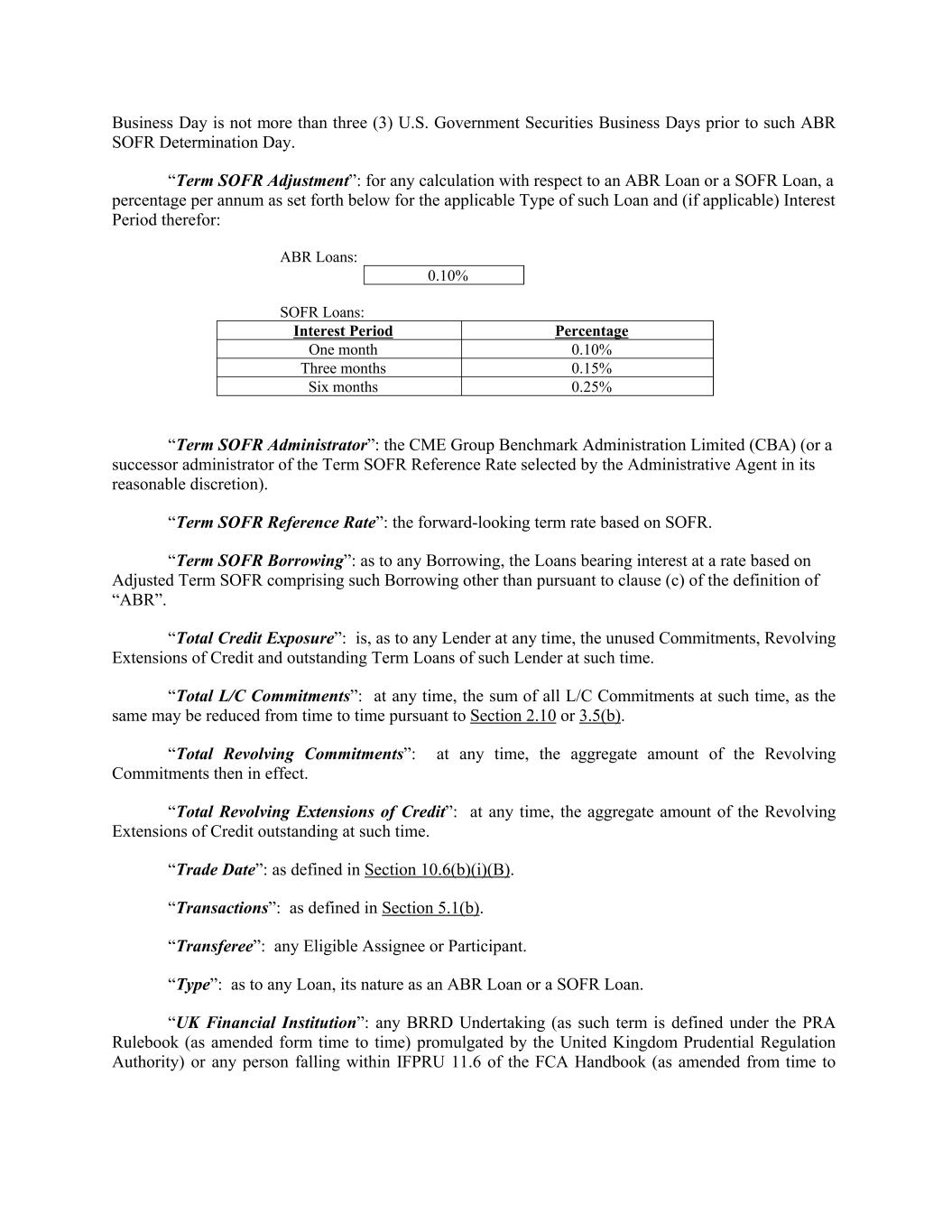 0.10% One month 0.10% SOFR Loans: Three months Business Day is not more than three (3) U.S. Government Securities Business Days prior to such ABR SOFR Determination Day. “Term SOFR Adjustment”: for any calculation with respect to an ABR Loan or a SOFR Loan, a percentage per annum as set forth below for the applicable Type of such Loan and (if applicable) Interest Period therefor: ABR Loans: 0.15% Interest Period Six months Percentage 0.25% “Term SOFR Administrator”: the CME Group Benchmark Administration Limited (CBA) (or a successor administrator of the Term SOFR Reference Rate selected by the Administrative Agent in its reasonable discretion). “Term SOFR Reference Rate”: the forward-looking term rate based on SOFR. “Term SOFR Borrowing”: as to any Borrowing, the Loans bearing interest at a rate based on Adjusted Term SOFR comprising such Borrowing other than pursuant to clause (c) of the definition of “ABR”. “Total Credit Exposure”: is, as to any Lender at any time, the unused Commitments, Revolving Extensions of Credit and outstanding Term Loans of such Lender at such time. “Total L/C Commitments”: at any time, the sum of all L/C Commitments at such time, as the same may be reduced from time to time pursuant to Section 2.10 or 3.5(b). “Total Revolving Commitments”: at any time, the aggregate amount of the Revolving Commitments then in effect. “Total Revolving Extensions of Credit”: at any time, the aggregate amount of the Revolving Extensions of Credit outstanding at such time. “Trade Date”: as defined in Section 10.6(b)(i)(B). “Transactions”: as defined in Section 5.1(b). “Transferee”: any Eligible Assignee or Participant. “Type”: as to any Loan, its nature as an ABR Loan or a SOFR Loan. “UK Financial Institution”: any BRRD Undertaking (as such term is defined under the PRA Rulebook (as amended form time to time) promulgated by the United Kingdom Prudential Regulation Authority) or any person falling within IFPRU 11.6 of the FCA Handbook (as amended from time to
