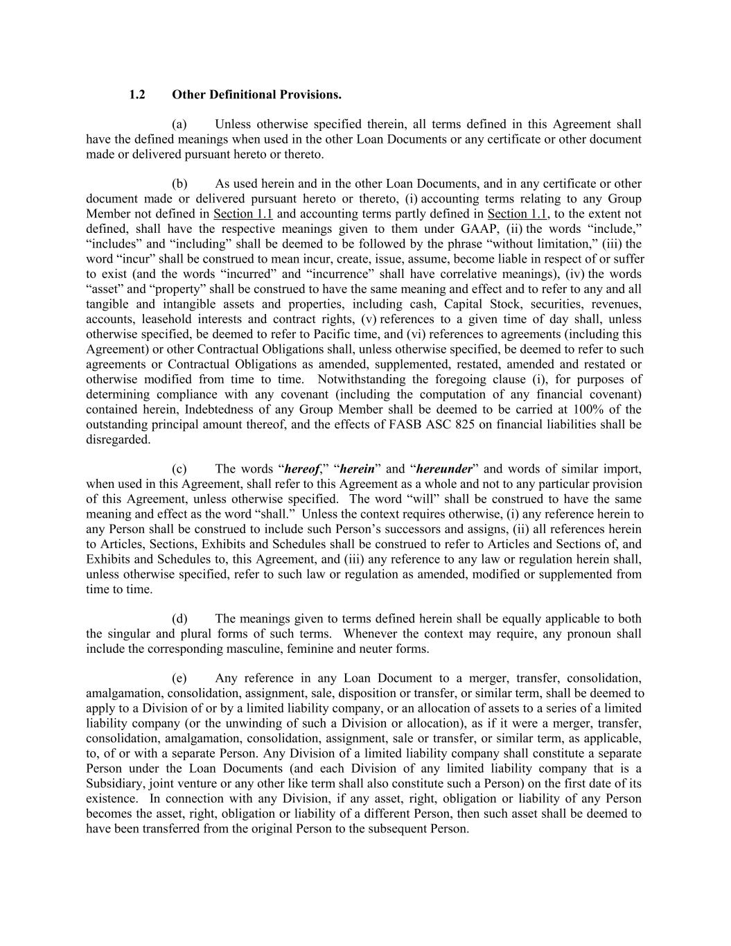 1.2 Other Definitional Provisions. (a) Unless otherwise specified therein, all terms defined in this Agreement shall have the defined meanings when used in the other Loan Documents or any certificate or other document made or delivered pursuant hereto or thereto. (b) As used herein and in the other Loan Documents, and in any certificate or other document made or delivered pursuant hereto or thereto, (i) accounting terms relating to any Group Member not defined in Section 1.1 and accounting terms partly defined in Section 1.1, to the extent not defined, shall have the respective meanings given to them under GAAP, (ii) the words “include,” “includes” and “including” shall be deemed to be followed by the phrase “without limitation,” (iii) the word “incur” shall be construed to mean incur, create, issue, assume, become liable in respect of or suffer to exist (and the words “incurred” and “incurrence” shall have correlative meanings), (iv) the words “asset” and “property” shall be construed to have the same meaning and effect and to refer to any and all tangible and intangible assets and properties, including cash, Capital Stock, securities, revenues, accounts, leasehold interests and contract rights, (v) references to a given time of day shall, unless otherwise specified, be deemed to refer to Pacific time, and (vi) references to agreements (including this Agreement) or other Contractual Obligations shall, unless otherwise specified, be deemed to refer to such agreements or Contractual Obligations as amended, supplemented, restated, amended and restated or otherwise modified from time to time. Notwithstanding the foregoing clause (i), for purposes of determining compliance with any covenant (including the computation of any financial covenant) contained herein, Indebtedness of any Group Member shall be deemed to be carried at 100% of the outstanding principal amount thereof, and the effects of FASB ASC 825 on financial liabilities shall be disregarded. (c) The words “hereof,” “herein” and “hereunder” and words of similar import, when used in this Agreement, shall refer to this Agreement as a whole and not to any particular provision of this Agreement, unless otherwise specified. The word “will” shall be construed to have the same meaning and effect as the word “shall.” Unless the context requires otherwise, (i) any reference herein to any Person shall be construed to include such Person’s successors and assigns, (ii) all references herein to Articles, Sections, Exhibits and Schedules shall be construed to refer to Articles and Sections of, and Exhibits and Schedules to, this Agreement, and (iii) any reference to any law or regulation herein shall, unless otherwise specified, refer to such law or regulation as amended, modified or supplemented from time to time. (d) The meanings given to terms defined herein shall be equally applicable to both the singular and plural forms of such terms. Whenever the context may require, any pronoun shall include the corresponding masculine, feminine and neuter forms. (e) Any reference in any Loan Document to a merger, transfer, consolidation, amalgamation, consolidation, assignment, sale, disposition or transfer, or similar term, shall be deemed to apply to a Division of or by a limited liability company, or an allocation of assets to a series of a limited liability company (or the unwinding of such a Division or allocation), as if it were a merger, transfer, consolidation, amalgamation, consolidation, assignment, sale or transfer, or similar term, as applicable, to, of or with a separate Person. Any Division of a limited liability company shall constitute a separate Person under the Loan Documents (and each Division of any limited liability company that is a Subsidiary, joint venture or any other like term shall also constitute such a Person) on the first date of its existence. In connection with any Division, if any asset, right, obligation or liability of any Person becomes the asset, right, obligation or liability of a different Person, then such asset shall be deemed to have been transferred from the original Person to the subsequent Person.
