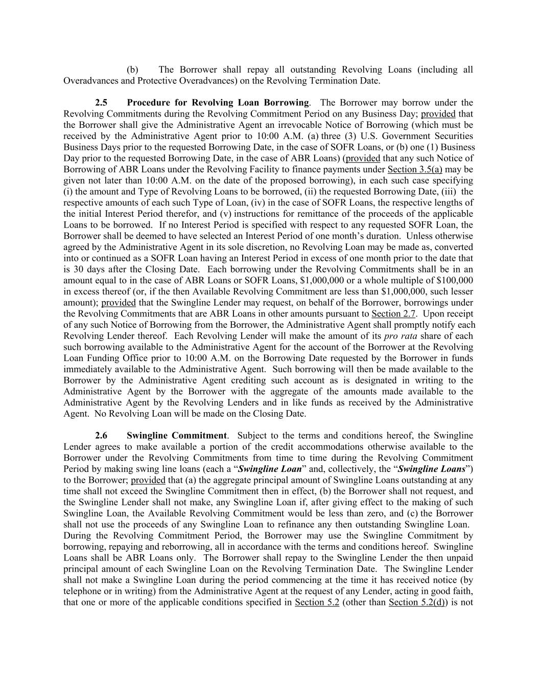 (b) The Borrower shall repay all outstanding Revolving Loans (including all Overadvances and Protective Overadvances) on the Revolving Termination Date. 2.5 Procedure for Revolving Loan Borrowing. The Borrower may borrow under the Revolving Commitments during the Revolving Commitment Period on any Business Day; provided that the Borrower shall give the Administrative Agent an irrevocable Notice of Borrowing (which must be received by the Administrative Agent prior to 10:00 A.M. (a) three (3) U.S. Government Securities Business Days prior to the requested Borrowing Date, in the case of SOFR Loans, or (b) one (1) Business Day prior to the requested Borrowing Date, in the case of ABR Loans) (provided that any such Notice of Borrowing of ABR Loans under the Revolving Facility to finance payments under Section 3.5(a) may be given not later than 10:00 A.M. on the date of the proposed borrowing), in each such case specifying (i) the amount and Type of Revolving Loans to be borrowed, (ii) the requested Borrowing Date, (iii) the respective amounts of each such Type of Loan, (iv) in the case of SOFR Loans, the respective lengths of the initial Interest Period therefor, and (v) instructions for remittance of the proceeds of the applicable Loans to be borrowed. If no Interest Period is specified with respect to any requested SOFR Loan, the Borrower shall be deemed to have selected an Interest Period of one month’s duration. Unless otherwise agreed by the Administrative Agent in its sole discretion, no Revolving Loan may be made as, converted into or continued as a SOFR Loan having an Interest Period in excess of one month prior to the date that is 30 days after the Closing Date. Each borrowing under the Revolving Commitments shall be in an amount equal to in the case of ABR Loans or SOFR Loans, $1,000,000 or a whole multiple of $100,000 in excess thereof (or, if the then Available Revolving Commitment are less than $1,000,000, such lesser amount); provided that the Swingline Lender may request, on behalf of the Borrower, borrowings under the Revolving Commitments that are ABR Loans in other amounts pursuant to Section 2.7. Upon receipt of any such Notice of Borrowing from the Borrower, the Administrative Agent shall promptly notify each Revolving Lender thereof. Each Revolving Lender will make the amount of its pro rata share of each such borrowing available to the Administrative Agent for the account of the Borrower at the Revolving Loan Funding Office prior to 10:00 A.M. on the Borrowing Date requested by the Borrower in funds immediately available to the Administrative Agent. Such borrowing will then be made available to the Borrower by the Administrative Agent crediting such account as is designated in writing to the Administrative Agent by the Borrower with the aggregate of the amounts made available to the Administrative Agent by the Revolving Lenders and in like funds as received by the Administrative Agent. No Revolving Loan will be made on the Closing Date. 2.6 Swingline Commitment. Subject to the terms and conditions hereof, the Swingline Lender agrees to make available a portion of the credit accommodations otherwise available to the Borrower under the Revolving Commitments from time to time during the Revolving Commitment Period by making swing line loans (each a “Swingline Loan” and, collectively, the “Swingline Loans”) to the Borrower; provided that (a) the aggregate principal amount of Swingline Loans outstanding at any time shall not exceed the Swingline Commitment then in effect, (b) the Borrower shall not request, and the Swingline Lender shall not make, any Swingline Loan if, after giving effect to the making of such Swingline Loan, the Available Revolving Commitment would be less than zero, and (c) the Borrower shall not use the proceeds of any Swingline Loan to refinance any then outstanding Swingline Loan. During the Revolving Commitment Period, the Borrower may use the Swingline Commitment by borrowing, repaying and reborrowing, all in accordance with the terms and conditions hereof. Swingline Loans shall be ABR Loans only. The Borrower shall repay to the Swingline Lender the then unpaid principal amount of each Swingline Loan on the Revolving Termination Date. The Swingline Lender shall not make a Swingline Loan during the period commencing at the time it has received notice (by telephone or in writing) from the Administrative Agent at the request of any Lender, acting in good faith, that one or more of the applicable conditions specified in Section 5.2 (other than Section 5.2(d)) is not