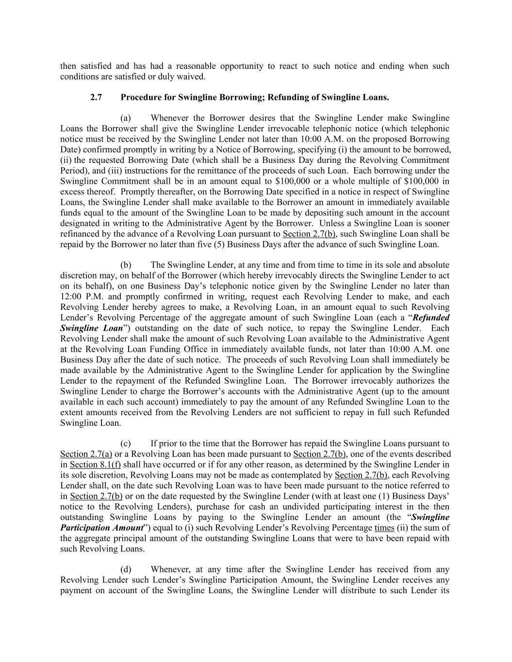 then satisfied and has had a reasonable opportunity to react to such notice and ending when such conditions are satisfied or duly waived. 2.7 Procedure for Swingline Borrowing; Refunding of Swingline Loans. (a) Whenever the Borrower desires that the Swingline Lender make Swingline Loans the Borrower shall give the Swingline Lender irrevocable telephonic notice (which telephonic notice must be received by the Swingline Lender not later than 10:00 A.M. on the proposed Borrowing Date) confirmed promptly in writing by a Notice of Borrowing, specifying (i) the amount to be borrowed, (ii) the requested Borrowing Date (which shall be a Business Day during the Revolving Commitment Period), and (iii) instructions for the remittance of the proceeds of such Loan. Each borrowing under the Swingline Commitment shall be in an amount equal to $100,000 or a whole multiple of $100,000 in excess thereof. Promptly thereafter, on the Borrowing Date specified in a notice in respect of Swingline Loans, the Swingline Lender shall make available to the Borrower an amount in immediately available funds equal to the amount of the Swingline Loan to be made by depositing such amount in the account designated in writing to the Administrative Agent by the Borrower. Unless a Swingline Loan is sooner refinanced by the advance of a Revolving Loan pursuant to Section 2.7(b), such Swingline Loan shall be repaid by the Borrower no later than five (5) Business Days after the advance of such Swingline Loan. (b) The Swingline Lender, at any time and from time to time in its sole and absolute discretion may, on behalf of the Borrower (which hereby irrevocably directs the Swingline Lender to act on its behalf), on one Business Day’s telephonic notice given by the Swingline Lender no later than 12:00 P.M. and promptly confirmed in writing, request each Revolving Lender to make, and each Revolving Lender hereby agrees to make, a Revolving Loan, in an amount equal to such Revolving Lender’s Revolving Percentage of the aggregate amount of such Swingline Loan (each a “Refunded Swingline Loan”) outstanding on the date of such notice, to repay the Swingline Lender. Each Revolving Lender shall make the amount of such Revolving Loan available to the Administrative Agent at the Revolving Loan Funding Office in immediately available funds, not later than 10:00 A.M. one Business Day after the date of such notice. The proceeds of such Revolving Loan shall immediately be made available by the Administrative Agent to the Swingline Lender for application by the Swingline Lender to the repayment of the Refunded Swingline Loan. The Borrower irrevocably authorizes the Swingline Lender to charge the Borrower’s accounts with the Administrative Agent (up to the amount available in each such account) immediately to pay the amount of any Refunded Swingline Loan to the extent amounts received from the Revolving Lenders are not sufficient to repay in full such Refunded Swingline Loan. (c) If prior to the time that the Borrower has repaid the Swingline Loans pursuant to Section 2.7(a) or a Revolving Loan has been made pursuant to Section 2.7(b), one of the events described in Section 8.1(f) shall have occurred or if for any other reason, as determined by the Swingline Lender in its sole discretion, Revolving Loans may not be made as contemplated by Section 2.7(b), each Revolving Lender shall, on the date such Revolving Loan was to have been made pursuant to the notice referred to in Section 2.7(b) or on the date requested by the Swingline Lender (with at least one (1) Business Days’ notice to the Revolving Lenders), purchase for cash an undivided participating interest in the then outstanding Swingline Loans by paying to the Swingline Lender an amount (the “Swingline Participation Amount”) equal to (i) such Revolving Lender’s Revolving Percentage times (ii) the sum of the aggregate principal amount of the outstanding Swingline Loans that were to have been repaid with such Revolving Loans. (d) Whenever, at any time after the Swingline Lender has received from any Revolving Lender such Lender’s Swingline Participation Amount, the Swingline Lender receives any payment on account of the Swingline Loans, the Swingline Lender will distribute to such Lender its