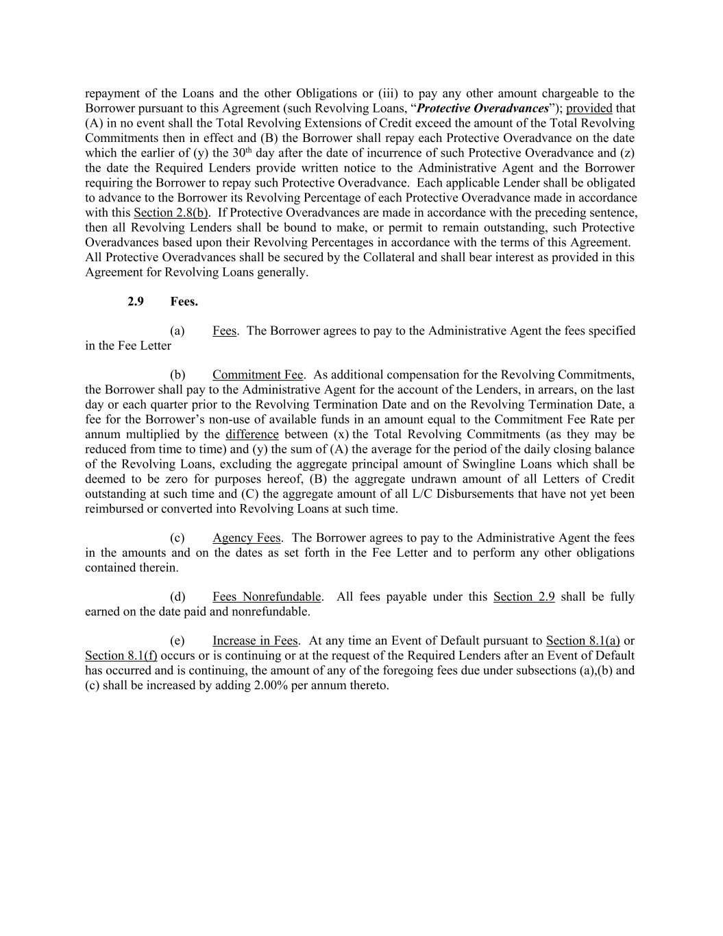repayment of the Loans and the other Obligations or (iii) to pay any other amount chargeable to the Borrower pursuant to this Agreement (such Revolving Loans, “Protective Overadvances”); provided that (A) in no event shall the Total Revolving Extensions of Credit exceed the amount of the Total Revolving Commitments then in effect and (B) the Borrower shall repay each Protective Overadvance on the date which the earlier of (y) the 30th day after the date of incurrence of such Protective Overadvance and (z) the date the Required Lenders provide written notice to the Administrative Agent and the Borrower requiring the Borrower to repay such Protective Overadvance. Each applicable Lender shall be obligated to advance to the Borrower its Revolving Percentage of each Protective Overadvance made in accordance with this Section 2.8(b). If Protective Overadvances are made in accordance with the preceding sentence, then all Revolving Lenders shall be bound to make, or permit to remain outstanding, such Protective Overadvances based upon their Revolving Percentages in accordance with the terms of this Agreement. All Protective Overadvances shall be secured by the Collateral and shall bear interest as provided in this Agreement for Revolving Loans generally. 2.9 Fees. (a) Fees. The Borrower agrees to pay to the Administrative Agent the fees specified in the Fee Letter (b) Commitment Fee. As additional compensation for the Revolving Commitments, the Borrower shall pay to the Administrative Agent for the account of the Lenders, in arrears, on the last day or each quarter prior to the Revolving Termination Date and on the Revolving Termination Date, a fee for the Borrower’s non-use of available funds in an amount equal to the Commitment Fee Rate per annum multiplied by the difference between (x) the Total Revolving Commitments (as they may be reduced from time to time) and (y) the sum of (A) the average for the period of the daily closing balance of the Revolving Loans, excluding the aggregate principal amount of Swingline Loans which shall be deemed to be zero for purposes hereof, (B) the aggregate undrawn amount of all Letters of Credit outstanding at such time and (C) the aggregate amount of all L/C Disbursements that have not yet been reimbursed or converted into Revolving Loans at such time. (c) Agency Fees. The Borrower agrees to pay to the Administrative Agent the fees in the amounts and on the dates as set forth in the Fee Letter and to perform any other obligations contained therein. (d) Fees Nonrefundable. All fees payable under this Section 2.9 shall be fully earned on the date paid and nonrefundable. (e) Increase in Fees. At any time an Event of Default pursuant to Section 8.1(a) or Section 8.1(f) occurs or is continuing or at the request of the Required Lenders after an Event of Default has occurred and is continuing, the amount of any of the foregoing fees due under subsections (a),(b) and (c) shall be increased by adding 2.00% per annum thereto.