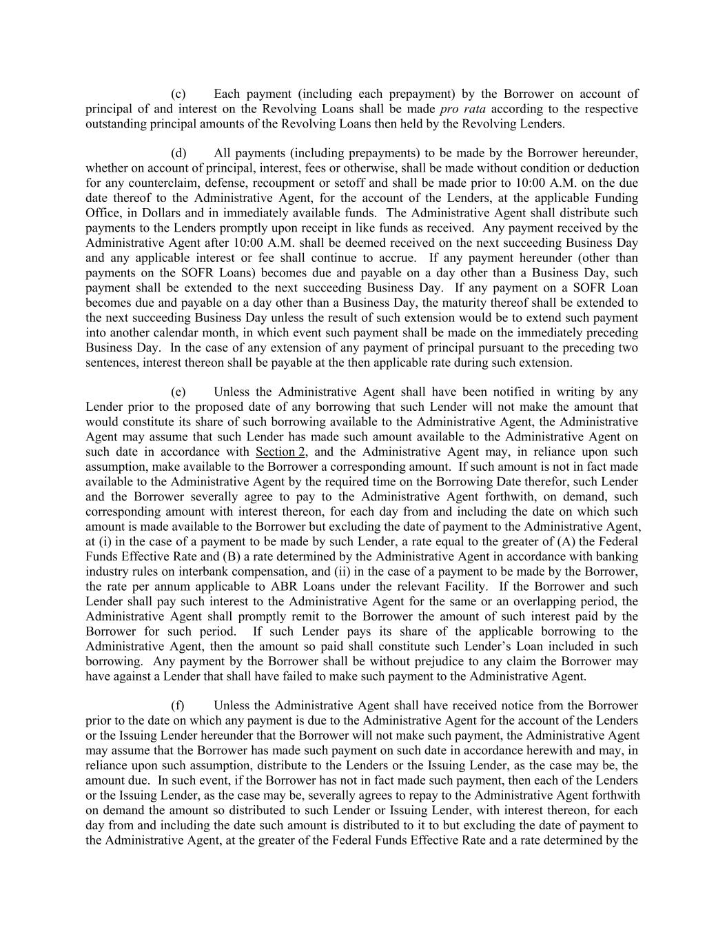(c) Each payment (including each prepayment) by the Borrower on account of principal of and interest on the Revolving Loans shall be made pro rata according to the respective outstanding principal amounts of the Revolving Loans then held by the Revolving Lenders. (d) All payments (including prepayments) to be made by the Borrower hereunder, whether on account of principal, interest, fees or otherwise, shall be made without condition or deduction for any counterclaim, defense, recoupment or setoff and shall be made prior to 10:00 A.M. on the due date thereof to the Administrative Agent, for the account of the Lenders, at the applicable Funding Office, in Dollars and in immediately available funds. The Administrative Agent shall distribute such payments to the Lenders promptly upon receipt in like funds as received. Any payment received by the Administrative Agent after 10:00 A.M. shall be deemed received on the next succeeding Business Day and any applicable interest or fee shall continue to accrue. If any payment hereunder (other than payments on the SOFR Loans) becomes due and payable on a day other than a Business Day, such payment shall be extended to the next succeeding Business Day. If any payment on a SOFR Loan becomes due and payable on a day other than a Business Day, the maturity thereof shall be extended to the next succeeding Business Day unless the result of such extension would be to extend such payment into another calendar month, in which event such payment shall be made on the immediately preceding Business Day. In the case of any extension of any payment of principal pursuant to the preceding two sentences, interest thereon shall be payable at the then applicable rate during such extension. (e) Unless the Administrative Agent shall have been notified in writing by any Lender prior to the proposed date of any borrowing that such Lender will not make the amount that would constitute its share of such borrowing available to the Administrative Agent, the Administrative Agent may assume that such Lender has made such amount available to the Administrative Agent on such date in accordance with Section 2, and the Administrative Agent may, in reliance upon such assumption, make available to the Borrower a corresponding amount. If such amount is not in fact made available to the Administrative Agent by the required time on the Borrowing Date therefor, such Lender and the Borrower severally agree to pay to the Administrative Agent forthwith, on demand, such corresponding amount with interest thereon, for each day from and including the date on which such amount is made available to the Borrower but excluding the date of payment to the Administrative Agent, at (i) in the case of a payment to be made by such Lender, a rate equal to the greater of (A) the Federal Funds Effective Rate and (B) a rate determined by the Administrative Agent in accordance with banking industry rules on interbank compensation, and (ii) in the case of a payment to be made by the Borrower, the rate per annum applicable to ABR Loans under the relevant Facility. If the Borrower and such Lender shall pay such interest to the Administrative Agent for the same or an overlapping period, the Administrative Agent shall promptly remit to the Borrower the amount of such interest paid by the Borrower for such period. If such Lender pays its share of the applicable borrowing to the Administrative Agent, then the amount so paid shall constitute such Lender’s Loan included in such borrowing. Any payment by the Borrower shall be without prejudice to any claim the Borrower may have against a Lender that shall have failed to make such payment to the Administrative Agent. (f) Unless the Administrative Agent shall have received notice from the Borrower prior to the date on which any payment is due to the Administrative Agent for the account of the Lenders or the Issuing Lender hereunder that the Borrower will not make such payment, the Administrative Agent may assume that the Borrower has made such payment on such date in accordance herewith and may, in reliance upon such assumption, distribute to the Lenders or the Issuing Lender, as the case may be, the amount due. In such event, if the Borrower has not in fact made such payment, then each of the Lenders or the Issuing Lender, as the case may be, severally agrees to repay to the Administrative Agent forthwith on demand the amount so distributed to such Lender or Issuing Lender, with interest thereon, for each day from and including the date such amount is distributed to it to but excluding the date of payment to the Administrative Agent, at the greater of the Federal Funds Effective Rate and a rate determined by the