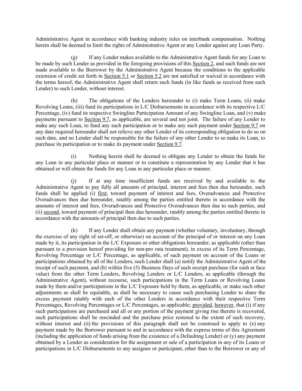 Administrative Agent in accordance with banking industry rules on interbank compensation. Nothing herein shall be deemed to limit the rights of Administrative Agent or any Lender against any Loan Party. (g) If any Lender makes available to the Administrative Agent funds for any Loan to be made by such Lender as provided in the foregoing provisions of this Section 2, and such funds are not made available to the Borrower by the Administrative Agent because the conditions to the applicable extension of credit set forth in Section 5.1 or Section 5.2 are not satisfied or waived in accordance with the terms hereof, the Administrative Agent shall return such funds (in like funds as received from such Lender) to such Lender, without interest. (h) The obligations of the Lenders hereunder to (i) make Term Loans, (ii) make Revolving Loans, (iii) fund its participations in L/C Disbursements in accordance with its respective L/C Percentage, (iv) fund its respective Swingline Participation Amount of any Swingline Loan, and (v) make payments pursuant to Section 9.7, as applicable, are several and not joint. The failure of any Lender to make any such Loan, to fund any such participation or to make any such payment under Section 9.7 on any date required hereunder shall not relieve any other Lender of its corresponding obligation to do so on such date, and no Lender shall be responsible for the failure of any other Lender to so make its Loan, to purchase its participation or to make its payment under Section 9.7. (i) Nothing herein shall be deemed to obligate any Lender to obtain the funds for any Loan in any particular place or manner or to constitute a representation by any Lender that it has obtained or will obtain the funds for any Loan in any particular place or manner. (j) If at any time insufficient funds are received by and available to the Administrative Agent to pay fully all amounts of principal, interest and fees then due hereunder, such funds shall be applied (i) first, toward payment of interest and fees, Overadvances and Protective Overadvances then due hereunder, ratably among the parties entitled thereto in accordance with the amounts of interest and fees, Overadvances and Protective Overadvances then due to such parties, and (ii) second, toward payment of principal then due hereunder, ratably among the parties entitled thereto in accordance with the amounts of principal then due to such parties. (k) If any Lender shall obtain any payment (whether voluntary, involuntary, through the exercise of any right of set-off, or otherwise) on account of the principal of or interest on any Loan made by it, its participation in the L/C Exposure or other obligations hereunder, as applicable (other than pursuant to a provision hereof providing for non-pro rata treatment), in excess of its Term Percentage, Revolving Percentage or L/C Percentage, as applicable, of such payment on account of the Loans or participations obtained by all of the Lenders, such Lender shall (a) notify the Administrative Agent of the receipt of such payment, and (b) within five (5) Business Days of such receipt purchase (for cash at face value) from the other Term Lenders, Revolving Lenders or L/C Lenders, as applicable (through the Administrative Agent), without recourse, such participations in the Term Loans or Revolving Loans made by them and/or participations in the L/C Exposure held by them, as applicable, or make such other adjustments as shall be equitable, as shall be necessary to cause such purchasing Lender to share the excess payment ratably with each of the other Lenders in accordance with their respective Term Percentages, Revolving Percentages or L/C Percentages, as applicable; provided, however, that (i) if any such participations are purchased and all or any portion of the payment giving rise thereto is recovered, such participations shall be rescinded and the purchase price restored to the extent of such recovery, without interest and (ii) the provisions of this paragraph shall not be construed to apply to (x) any payment made by the Borrower pursuant to and in accordance with the express terms of this Agreement (including the application of funds arising from the existence of a Defaulting Lender) or (y) any payment obtained by a Lender as consideration for the assignment or sale of a participation in any of its Loans or participations in L/C Disbursements to any assignee or participant, other than to the Borrower or any of