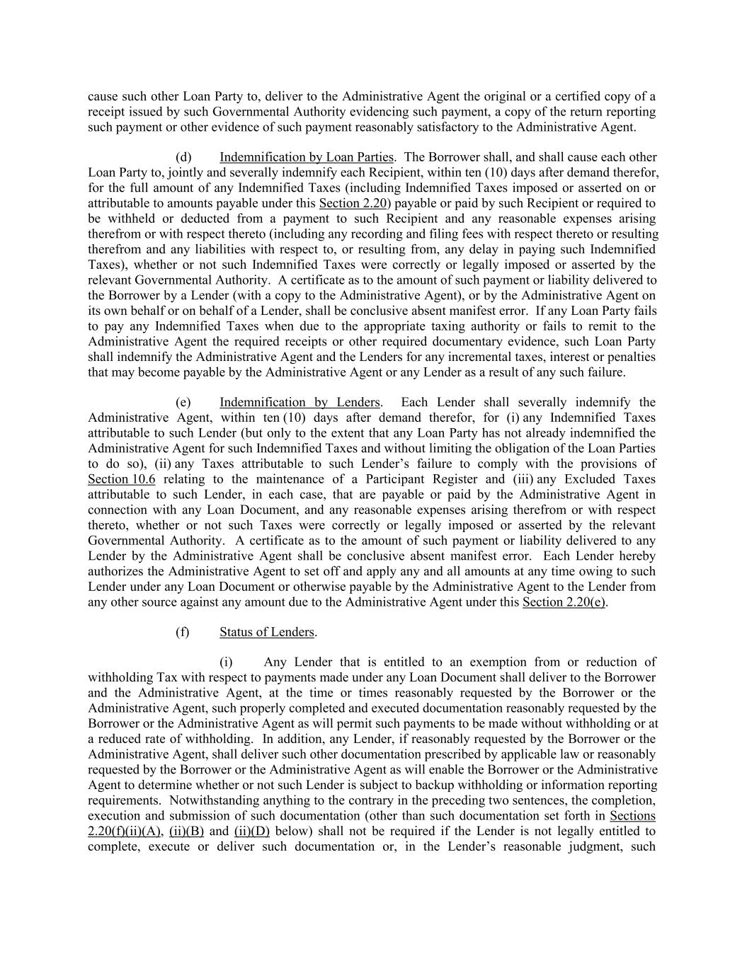 cause such other Loan Party to, deliver to the Administrative Agent the original or a certified copy of a receipt issued by such Governmental Authority evidencing such payment, a copy of the return reporting such payment or other evidence of such payment reasonably satisfactory to the Administrative Agent. (d) Indemnification by Loan Parties. The Borrower shall, and shall cause each other Loan Party to, jointly and severally indemnify each Recipient, within ten (10) days after demand therefor, for the full amount of any Indemnified Taxes (including Indemnified Taxes imposed or asserted on or attributable to amounts payable under this Section 2.20) payable or paid by such Recipient or required to be withheld or deducted from a payment to such Recipient and any reasonable expenses arising therefrom or with respect thereto (including any recording and filing fees with respect thereto or resulting therefrom and any liabilities with respect to, or resulting from, any delay in paying such Indemnified Taxes), whether or not such Indemnified Taxes were correctly or legally imposed or asserted by the relevant Governmental Authority. A certificate as to the amount of such payment or liability delivered to the Borrower by a Lender (with a copy to the Administrative Agent), or by the Administrative Agent on its own behalf or on behalf of a Lender, shall be conclusive absent manifest error. If any Loan Party fails to pay any Indemnified Taxes when due to the appropriate taxing authority or fails to remit to the Administrative Agent the required receipts or other required documentary evidence, such Loan Party shall indemnify the Administrative Agent and the Lenders for any incremental taxes, interest or penalties that may become payable by the Administrative Agent or any Lender as a result of any such failure. (e) Indemnification by Lenders. Each Lender shall severally indemnify the Administrative Agent, within ten (10) days after demand therefor, for (i) any Indemnified Taxes attributable to such Lender (but only to the extent that any Loan Party has not already indemnified the Administrative Agent for such Indemnified Taxes and without limiting the obligation of the Loan Parties to do so), (ii) any Taxes attributable to such Lender’s failure to comply with the provisions of Section 10.6 relating to the maintenance of a Participant Register and (iii) any Excluded Taxes attributable to such Lender, in each case, that are payable or paid by the Administrative Agent in connection with any Loan Document, and any reasonable expenses arising therefrom or with respect thereto, whether or not such Taxes were correctly or legally imposed or asserted by the relevant Governmental Authority. A certificate as to the amount of such payment or liability delivered to any Lender by the Administrative Agent shall be conclusive absent manifest error. Each Lender hereby authorizes the Administrative Agent to set off and apply any and all amounts at any time owing to such Lender under any Loan Document or otherwise payable by the Administrative Agent to the Lender from any other source against any amount due to the Administrative Agent under this Section 2.20(e). (f) Status of Lenders. (i) Any Lender that is entitled to an exemption from or reduction of withholding Tax with respect to payments made under any Loan Document shall deliver to the Borrower and the Administrative Agent, at the time or times reasonably requested by the Borrower or the Administrative Agent, such properly completed and executed documentation reasonably requested by the Borrower or the Administrative Agent as will permit such payments to be made without withholding or at a reduced rate of withholding. In addition, any Lender, if reasonably requested by the Borrower or the Administrative Agent, shall deliver such other documentation prescribed by applicable law or reasonably requested by the Borrower or the Administrative Agent as will enable the Borrower or the Administrative Agent to determine whether or not such Lender is subject to backup withholding or information reporting requirements. Notwithstanding anything to the contrary in the preceding two sentences, the completion, execution and submission of such documentation (other than such documentation set forth in Sections 2.20(f)(ii)(A), (ii)(B) and (ii)(D) below) shall not be required if the Lender is not legally entitled to complete, execute or deliver such documentation or, in the Lender’s reasonable judgment, such