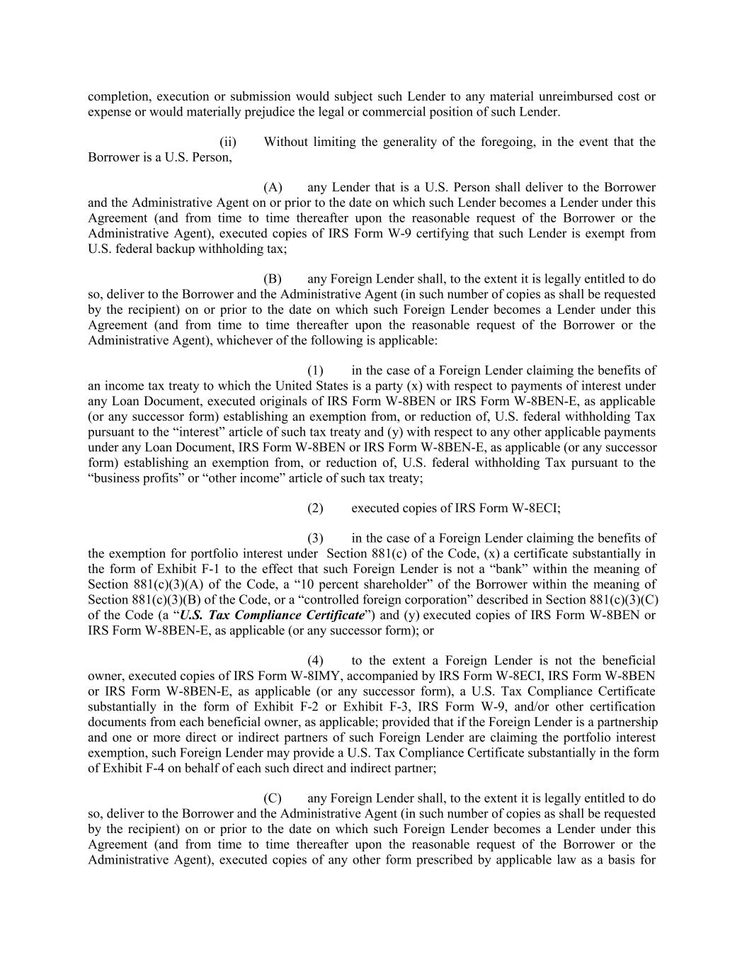 completion, execution or submission would subject such Lender to any material unreimbursed cost or expense or would materially prejudice the legal or commercial position of such Lender. (ii) Without limiting the generality of the foregoing, in the event that the Borrower is a U.S. Person, (A) any Lender that is a U.S. Person shall deliver to the Borrower and the Administrative Agent on or prior to the date on which such Lender becomes a Lender under this Agreement (and from time to time thereafter upon the reasonable request of the Borrower or the Administrative Agent), executed copies of IRS Form W-9 certifying that such Lender is exempt from U.S. federal backup withholding tax; (B) any Foreign Lender shall, to the extent it is legally entitled to do so, deliver to the Borrower and the Administrative Agent (in such number of copies as shall be requested by the recipient) on or prior to the date on which such Foreign Lender becomes a Lender under this Agreement (and from time to time thereafter upon the reasonable request of the Borrower or the Administrative Agent), whichever of the following is applicable: (1) in the case of a Foreign Lender claiming the benefits of an income tax treaty to which the United States is a party (x) with respect to payments of interest under any Loan Document, executed originals of IRS Form W-8BEN or IRS Form W-8BEN-E, as applicable (or any successor form) establishing an exemption from, or reduction of, U.S. federal withholding Tax pursuant to the “interest” article of such tax treaty and (y) with respect to any other applicable payments under any Loan Document, IRS Form W-8BEN or IRS Form W-8BEN-E, as applicable (or any successor form) establishing an exemption from, or reduction of, U.S. federal withholding Tax pursuant to the “business profits” or “other income” article of such tax treaty; (2) executed copies of IRS Form W-8ECI; (3) in the case of a Foreign Lender claiming the benefits of the exemption for portfolio interest under Section 881(c) of the Code, (x) a certificate substantially in the form of Exhibit F-1 to the effect that such Foreign Lender is not a “bank” within the meaning of Section 881(c)(3)(A) of the Code, a “10 percent shareholder” of the Borrower within the meaning of Section 881(c)(3)(B) of the Code, or a “controlled foreign corporation” described in Section 881(c)(3)(C) of the Code (a “U.S. Tax Compliance Certificate”) and (y) executed copies of IRS Form W-8BEN or IRS Form W-8BEN-E, as applicable (or any successor form); or (4) to the extent a Foreign Lender is not the beneficial owner, executed copies of IRS Form W-8IMY, accompanied by IRS Form W-8ECI, IRS Form W-8BEN or IRS Form W-8BEN-E, as applicable (or any successor form), a U.S. Tax Compliance Certificate substantially in the form of Exhibit F-2 or Exhibit F-3, IRS Form W-9, and/or other certification documents from each beneficial owner, as applicable; provided that if the Foreign Lender is a partnership and one or more direct or indirect partners of such Foreign Lender are claiming the portfolio interest exemption, such Foreign Lender may provide a U.S. Tax Compliance Certificate substantially in the form of Exhibit F-4 on behalf of each such direct and indirect partner; (C) any Foreign Lender shall, to the extent it is legally entitled to do so, deliver to the Borrower and the Administrative Agent (in such number of copies as shall be requested by the recipient) on or prior to the date on which such Foreign Lender becomes a Lender under this Agreement (and from time to time thereafter upon the reasonable request of the Borrower or the Administrative Agent), executed copies of any other form prescribed by applicable law as a basis for