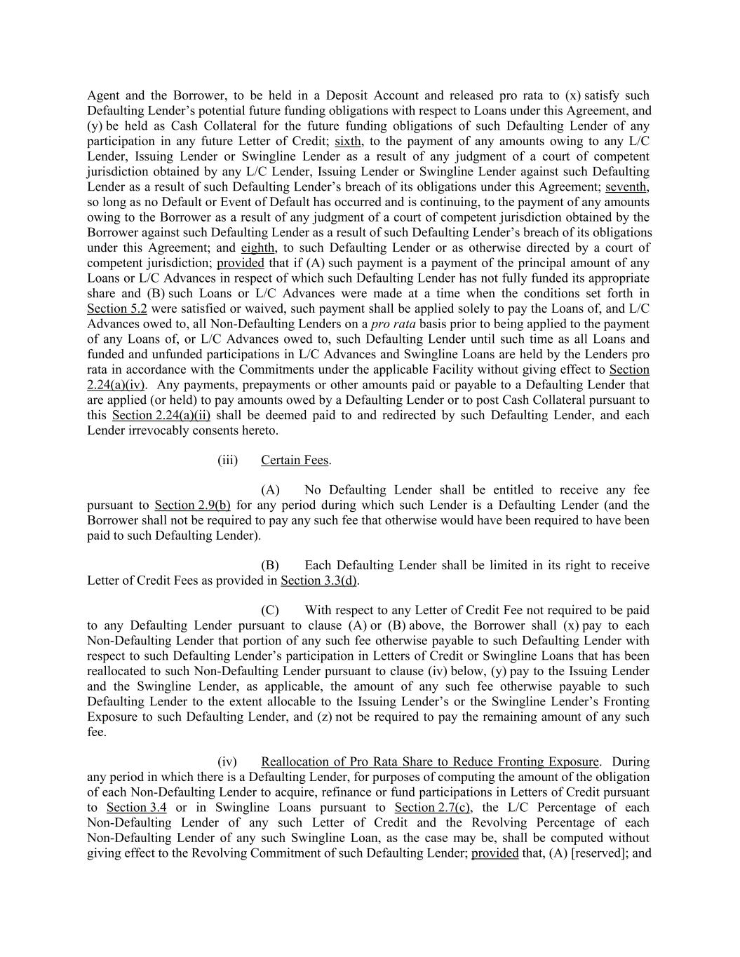 Agent and the Borrower, to be held in a Deposit Account and released pro rata to (x) satisfy such Defaulting Lender’s potential future funding obligations with respect to Loans under this Agreement, and (y) be held as Cash Collateral for the future funding obligations of such Defaulting Lender of any participation in any future Letter of Credit; sixth, to the payment of any amounts owing to any L/C Lender, Issuing Lender or Swingline Lender as a result of any judgment of a court of competent jurisdiction obtained by any L/C Lender, Issuing Lender or Swingline Lender against such Defaulting Lender as a result of such Defaulting Lender’s breach of its obligations under this Agreement; seventh, so long as no Default or Event of Default has occurred and is continuing, to the payment of any amounts owing to the Borrower as a result of any judgment of a court of competent jurisdiction obtained by the Borrower against such Defaulting Lender as a result of such Defaulting Lender’s breach of its obligations under this Agreement; and eighth, to such Defaulting Lender or as otherwise directed by a court of competent jurisdiction; provided that if (A) such payment is a payment of the principal amount of any Loans or L/C Advances in respect of which such Defaulting Lender has not fully funded its appropriate share and (B) such Loans or L/C Advances were made at a time when the conditions set forth in Section 5.2 were satisfied or waived, such payment shall be applied solely to pay the Loans of, and L/C Advances owed to, all Non-Defaulting Lenders on a pro rata basis prior to being applied to the payment of any Loans of, or L/C Advances owed to, such Defaulting Lender until such time as all Loans and funded and unfunded participations in L/C Advances and Swingline Loans are held by the Lenders pro rata in accordance with the Commitments under the applicable Facility without giving effect to Section 2.24(a)(iv). Any payments, prepayments or other amounts paid or payable to a Defaulting Lender that are applied (or held) to pay amounts owed by a Defaulting Lender or to post Cash Collateral pursuant to this Section 2.24(a)(ii) shall be deemed paid to and redirected by such Defaulting Lender, and each Lender irrevocably consents hereto. (iii) Certain Fees. (A) No Defaulting Lender shall be entitled to receive any fee pursuant to Section 2.9(b) for any period during which such Lender is a Defaulting Lender (and the Borrower shall not be required to pay any such fee that otherwise would have been required to have been paid to such Defaulting Lender). (B) Each Defaulting Lender shall be limited in its right to receive Letter of Credit Fees as provided in Section 3.3(d). (C) With respect to any Letter of Credit Fee not required to be paid to any Defaulting Lender pursuant to clause (A) or (B) above, the Borrower shall (x) pay to each Non-Defaulting Lender that portion of any such fee otherwise payable to such Defaulting Lender with respect to such Defaulting Lender’s participation in Letters of Credit or Swingline Loans that has been reallocated to such Non-Defaulting Lender pursuant to clause (iv) below, (y) pay to the Issuing Lender and the Swingline Lender, as applicable, the amount of any such fee otherwise payable to such Defaulting Lender to the extent allocable to the Issuing Lender’s or the Swingline Lender’s Fronting Exposure to such Defaulting Lender, and (z) not be required to pay the remaining amount of any such fee. (iv) Reallocation of Pro Rata Share to Reduce Fronting Exposure. During any period in which there is a Defaulting Lender, for purposes of computing the amount of the obligation of each Non-Defaulting Lender to acquire, refinance or fund participations in Letters of Credit pursuant to Section 3.4 or in Swingline Loans pursuant to Section 2.7(c), the L/C Percentage of each Non-Defaulting Lender of any such Letter of Credit and the Revolving Percentage of each Non-Defaulting Lender of any such Swingline Loan, as the case may be, shall be computed without giving effect to the Revolving Commitment of such Defaulting Lender; provided that, (A) [reserved]; and