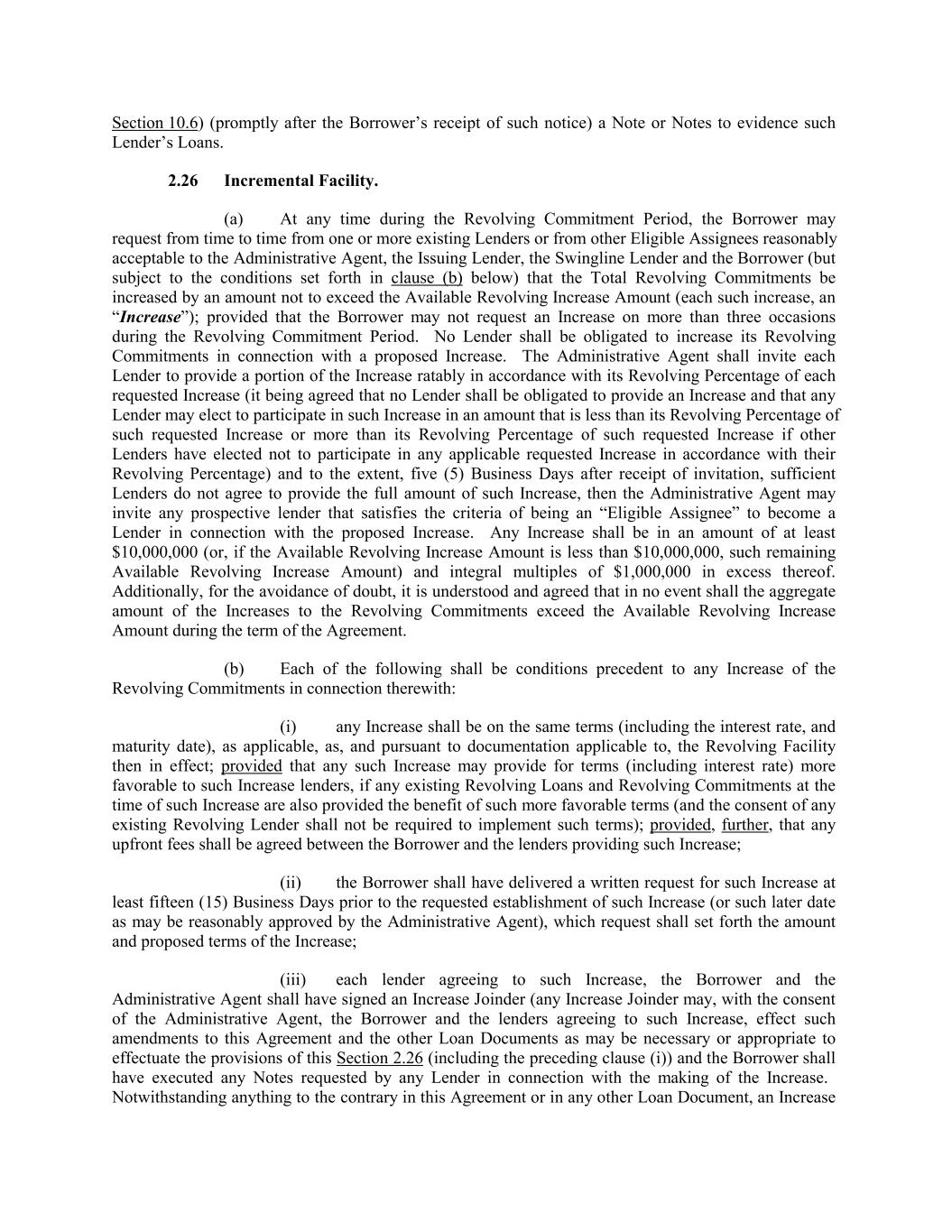 Section 10.6) (promptly after the Borrower’s receipt of such notice) a Note or Notes to evidence such Lender’s Loans. 2.26 Incremental Facility. (a) At any time during the Revolving Commitment Period, the Borrower may request from time to time from one or more existing Lenders or from other Eligible Assignees reasonably acceptable to the Administrative Agent, the Issuing Lender, the Swingline Lender and the Borrower (but subject to the conditions set forth in clause (b) below) that the Total Revolving Commitments be increased by an amount not to exceed the Available Revolving Increase Amount (each such increase, an “Increase”); provided that the Borrower may not request an Increase on more than three occasions during the Revolving Commitment Period. No Lender shall be obligated to increase its Revolving Commitments in connection with a proposed Increase. The Administrative Agent shall invite each Lender to provide a portion of the Increase ratably in accordance with its Revolving Percentage of each requested Increase (it being agreed that no Lender shall be obligated to provide an Increase and that any Lender may elect to participate in such Increase in an amount that is less than its Revolving Percentage of such requested Increase or more than its Revolving Percentage of such requested Increase if other Lenders have elected not to participate in any applicable requested Increase in accordance with their Revolving Percentage) and to the extent, five (5) Business Days after receipt of invitation, sufficient Lenders do not agree to provide the full amount of such Increase, then the Administrative Agent may invite any prospective lender that satisfies the criteria of being an “Eligible Assignee” to become a Lender in connection with the proposed Increase. Any Increase shall be in an amount of at least $10,000,000 (or, if the Available Revolving Increase Amount is less than $10,000,000, such remaining Available Revolving Increase Amount) and integral multiples of $1,000,000 in excess thereof. Additionally, for the avoidance of doubt, it is understood and agreed that in no event shall the aggregate amount of the Increases to the Revolving Commitments exceed the Available Revolving Increase Amount during the term of the Agreement. (b) Each of the following shall be conditions precedent to any Increase of the Revolving Commitments in connection therewith: (i) any Increase shall be on the same terms (including the interest rate, and maturity date), as applicable, as, and pursuant to documentation applicable to, the Revolving Facility then in effect; provided that any such Increase may provide for terms (including interest rate) more favorable to such Increase lenders, if any existing Revolving Loans and Revolving Commitments at the time of such Increase are also provided the benefit of such more favorable terms (and the consent of any existing Revolving Lender shall not be required to implement such terms); provided, further, that any upfront fees shall be agreed between the Borrower and the lenders providing such Increase; (ii) the Borrower shall have delivered a written request for such Increase at least fifteen (15) Business Days prior to the requested establishment of such Increase (or such later date as may be reasonably approved by the Administrative Agent), which request shall set forth the amount and proposed terms of the Increase; (iii) each lender agreeing to such Increase, the Borrower and the Administrative Agent shall have signed an Increase Joinder (any Increase Joinder may, with the consent of the Administrative Agent, the Borrower and the lenders agreeing to such Increase, effect such amendments to this Agreement and the other Loan Documents as may be necessary or appropriate to effectuate the provisions of this Section 2.26 (including the preceding clause (i)) and the Borrower shall have executed any Notes requested by any Lender in connection with the making of the Increase. Notwithstanding anything to the contrary in this Agreement or in any other Loan Document, an Increase