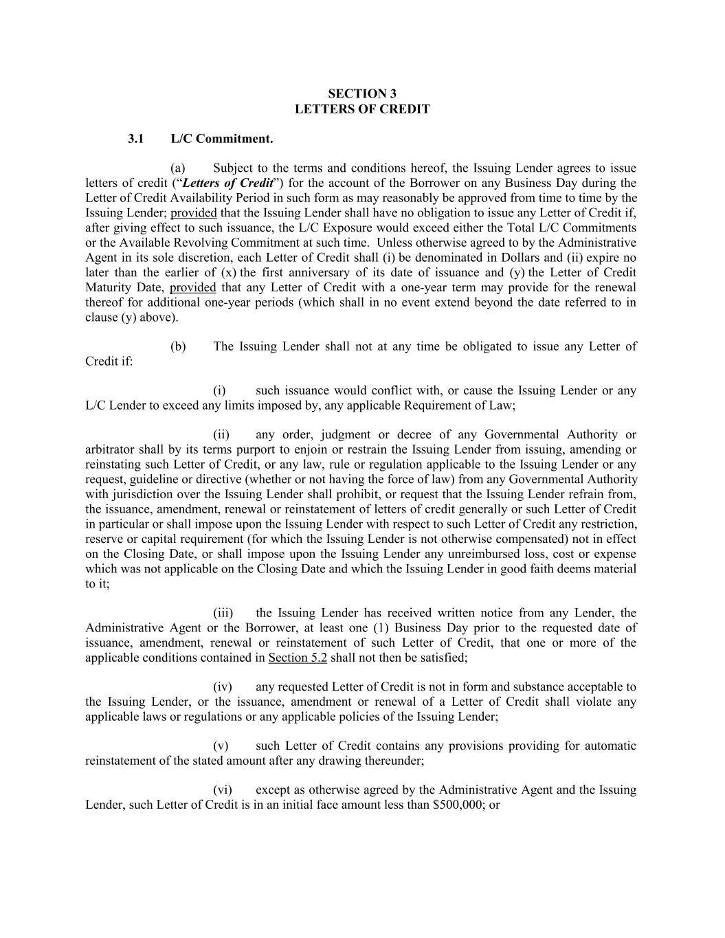 SECTION 3 LETTERS OF CREDIT 3.1 L/C Commitment. (a) Subject to the terms and conditions hereof, the Issuing Lender agrees to issue letters of credit (“Letters of Credit”) for the account of the Borrower on any Business Day during the Letter of Credit Availability Period in such form as may reasonably be approved from time to time by the Issuing Lender; provided that the Issuing Lender shall have no obligation to issue any Letter of Credit if, after giving effect to such issuance, the L/C Exposure would exceed either the Total L/C Commitments or the Available Revolving Commitment at such time. Unless otherwise agreed to by the Administrative Agent in its sole discretion, each Letter of Credit shall (i) be denominated in Dollars and (ii) expire no later than the earlier of (x) the first anniversary of its date of issuance and (y) the Letter of Credit Maturity Date, provided that any Letter of Credit with a one-year term may provide for the renewal thereof for additional one-year periods (which shall in no event extend beyond the date referred to in clause (y) above). (b) The Issuing Lender shall not at any time be obligated to issue any Letter of Credit if: (i) such issuance would conflict with, or cause the Issuing Lender or any L/C Lender to exceed any limits imposed by, any applicable Requirement of Law; (ii) any order, judgment or decree of any Governmental Authority or arbitrator shall by its terms purport to enjoin or restrain the Issuing Lender from issuing, amending or reinstating such Letter of Credit, or any law, rule or regulation applicable to the Issuing Lender or any request, guideline or directive (whether or not having the force of law) from any Governmental Authority with jurisdiction over the Issuing Lender shall prohibit, or request that the Issuing Lender refrain from, the issuance, amendment, renewal or reinstatement of letters of credit generally or such Letter of Credit in particular or shall impose upon the Issuing Lender with respect to such Letter of Credit any restriction, reserve or capital requirement (for which the Issuing Lender is not otherwise compensated) not in effect on the Closing Date, or shall impose upon the Issuing Lender any unreimbursed loss, cost or expense which was not applicable on the Closing Date and which the Issuing Lender in good faith deems material to it; (iii) the Issuing Lender has received written notice from any Lender, the Administrative Agent or the Borrower, at least one (1) Business Day prior to the requested date of issuance, amendment, renewal or reinstatement of such Letter of Credit, that one or more of the applicable conditions contained in Section 5.2 shall not then be satisfied; (iv) any requested Letter of Credit is not in form and substance acceptable to the Issuing Lender, or the issuance, amendment or renewal of a Letter of Credit shall violate any applicable laws or regulations or any applicable policies of the Issuing Lender; (v) such Letter of Credit contains any provisions providing for automatic reinstatement of the stated amount after any drawing thereunder; (vi) except as otherwise agreed by the Administrative Agent and the Issuing Lender, such Letter of Credit is in an initial face amount less than $500,000; or