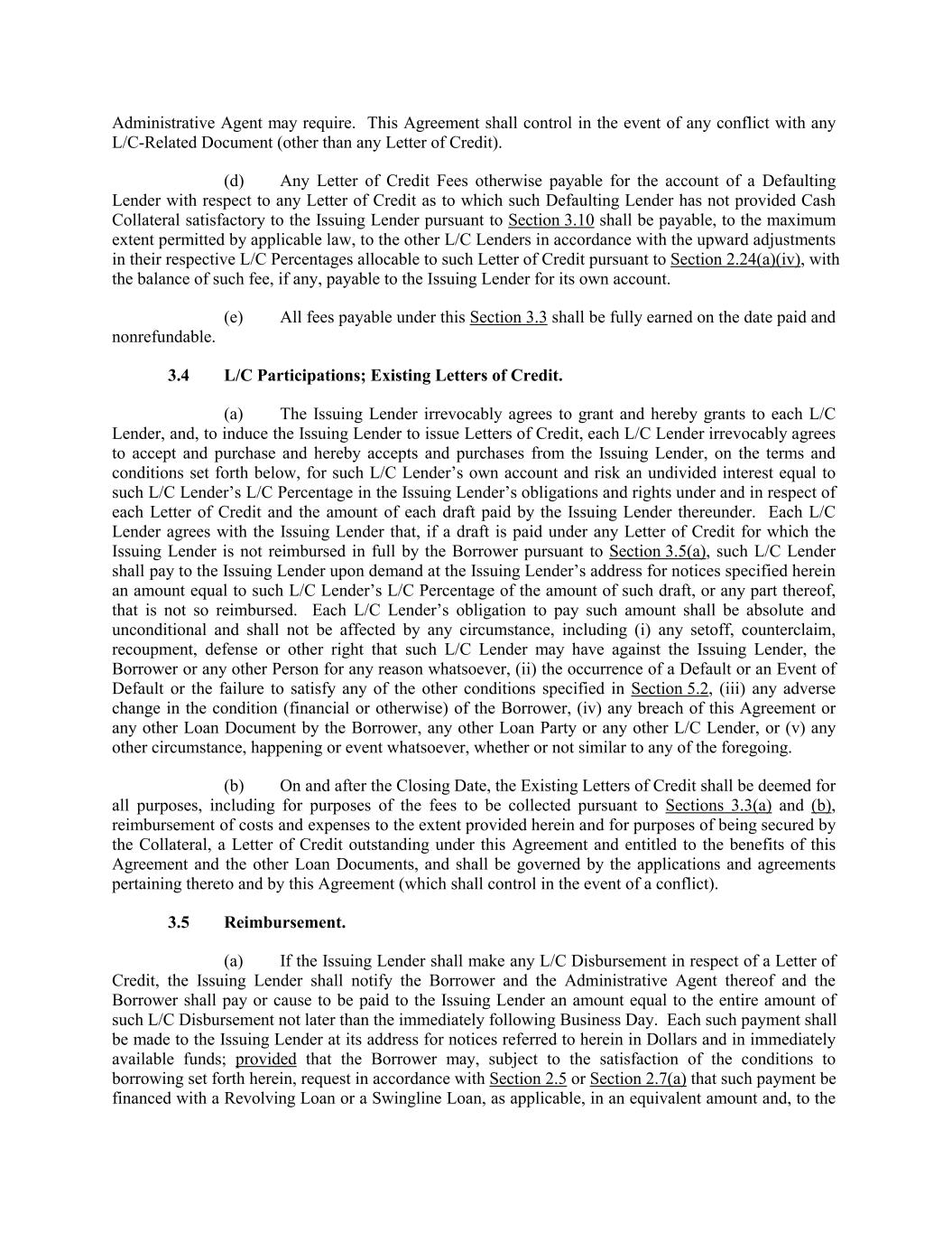 Administrative Agent may require. This Agreement shall control in the event of any conflict with any L/C-Related Document (other than any Letter of Credit). (d) Any Letter of Credit Fees otherwise payable for the account of a Defaulting Lender with respect to any Letter of Credit as to which such Defaulting Lender has not provided Cash Collateral satisfactory to the Issuing Lender pursuant to Section 3.10 shall be payable, to the maximum extent permitted by applicable law, to the other L/C Lenders in accordance with the upward adjustments in their respective L/C Percentages allocable to such Letter of Credit pursuant to Section 2.24(a)(iv), with the balance of such fee, if any, payable to the Issuing Lender for its own account. (e) All fees payable under this Section 3.3 shall be fully earned on the date paid and nonrefundable. 3.4 L/C Participations; Existing Letters of Credit. (a) The Issuing Lender irrevocably agrees to grant and hereby grants to each L/C Lender, and, to induce the Issuing Lender to issue Letters of Credit, each L/C Lender irrevocably agrees to accept and purchase and hereby accepts and purchases from the Issuing Lender, on the terms and conditions set forth below, for such L/C Lender’s own account and risk an undivided interest equal to such L/C Lender’s L/C Percentage in the Issuing Lender’s obligations and rights under and in respect of each Letter of Credit and the amount of each draft paid by the Issuing Lender thereunder. Each L/C Lender agrees with the Issuing Lender that, if a draft is paid under any Letter of Credit for which the Issuing Lender is not reimbursed in full by the Borrower pursuant to Section 3.5(a), such L/C Lender shall pay to the Issuing Lender upon demand at the Issuing Lender’s address for notices specified herein an amount equal to such L/C Lender’s L/C Percentage of the amount of such draft, or any part thereof, that is not so reimbursed. Each L/C Lender’s obligation to pay such amount shall be absolute and unconditional and shall not be affected by any circumstance, including (i) any setoff, counterclaim, recoupment, defense or other right that such L/C Lender may have against the Issuing Lender, the Borrower or any other Person for any reason whatsoever, (ii) the occurrence of a Default or an Event of Default or the failure to satisfy any of the other conditions specified in Section 5.2, (iii) any adverse change in the condition (financial or otherwise) of the Borrower, (iv) any breach of this Agreement or any other Loan Document by the Borrower, any other Loan Party or any other L/C Lender, or (v) any other circumstance, happening or event whatsoever, whether or not similar to any of the foregoing. (b) On and after the Closing Date, the Existing Letters of Credit shall be deemed for all purposes, including for purposes of the fees to be collected pursuant to Sections 3.3(a) and (b), reimbursement of costs and expenses to the extent provided herein and for purposes of being secured by the Collateral, a Letter of Credit outstanding under this Agreement and entitled to the benefits of this Agreement and the other Loan Documents, and shall be governed by the applications and agreements pertaining thereto and by this Agreement (which shall control in the event of a conflict). 3.5 Reimbursement. (a) If the Issuing Lender shall make any L/C Disbursement in respect of a Letter of Credit, the Issuing Lender shall notify the Borrower and the Administrative Agent thereof and the Borrower shall pay or cause to be paid to the Issuing Lender an amount equal to the entire amount of such L/C Disbursement not later than the immediately following Business Day. Each such payment shall be made to the Issuing Lender at its address for notices referred to herein in Dollars and in immediately available funds; provided that the Borrower may, subject to the satisfaction of the conditions to borrowing set forth herein, request in accordance with Section 2.5 or Section 2.7(a) that such payment be financed with a Revolving Loan or a Swingline Loan, as applicable, in an equivalent amount and, to the
