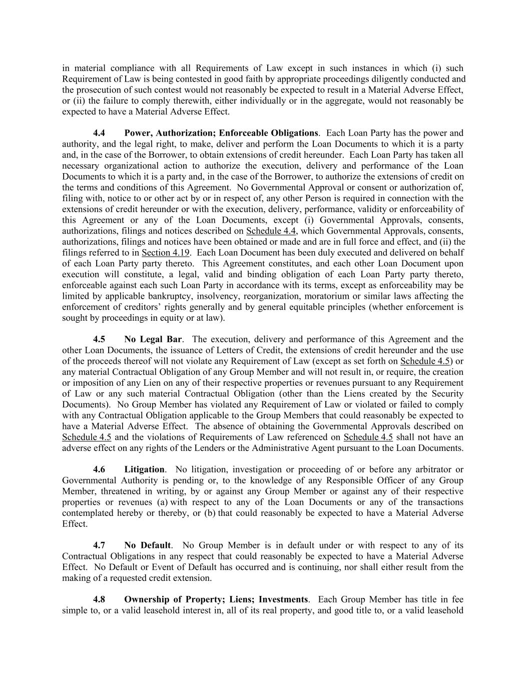 in material compliance with all Requirements of Law except in such instances in which (i) such Requirement of Law is being contested in good faith by appropriate proceedings diligently conducted and the prosecution of such contest would not reasonably be expected to result in a Material Adverse Effect, or (ii) the failure to comply therewith, either individually or in the aggregate, would not reasonably be expected to have a Material Adverse Effect. 4.4 Power, Authorization; Enforceable Obligations. Each Loan Party has the power and authority, and the legal right, to make, deliver and perform the Loan Documents to which it is a party and, in the case of the Borrower, to obtain extensions of credit hereunder. Each Loan Party has taken all necessary organizational action to authorize the execution, delivery and performance of the Loan Documents to which it is a party and, in the case of the Borrower, to authorize the extensions of credit on the terms and conditions of this Agreement. No Governmental Approval or consent or authorization of, filing with, notice to or other act by or in respect of, any other Person is required in connection with the extensions of credit hereunder or with the execution, delivery, performance, validity or enforceability of this Agreement or any of the Loan Documents, except (i) Governmental Approvals, consents, authorizations, filings and notices described on Schedule 4.4, which Governmental Approvals, consents, authorizations, filings and notices have been obtained or made and are in full force and effect, and (ii) the filings referred to in Section 4.19. Each Loan Document has been duly executed and delivered on behalf of each Loan Party party thereto. This Agreement constitutes, and each other Loan Document upon execution will constitute, a legal, valid and binding obligation of each Loan Party party thereto, enforceable against each such Loan Party in accordance with its terms, except as enforceability may be limited by applicable bankruptcy, insolvency, reorganization, moratorium or similar laws affecting the enforcement of creditors’ rights generally and by general equitable principles (whether enforcement is sought by proceedings in equity or at law). 4.5 No Legal Bar. The execution, delivery and performance of this Agreement and the other Loan Documents, the issuance of Letters of Credit, the extensions of credit hereunder and the use of the proceeds thereof will not violate any Requirement of Law (except as set forth on Schedule 4.5) or any material Contractual Obligation of any Group Member and will not result in, or require, the creation or imposition of any Lien on any of their respective properties or revenues pursuant to any Requirement of Law or any such material Contractual Obligation (other than the Liens created by the Security Documents). No Group Member has violated any Requirement of Law or violated or failed to comply with any Contractual Obligation applicable to the Group Members that could reasonably be expected to have a Material Adverse Effect. The absence of obtaining the Governmental Approvals described on Schedule 4.5 and the violations of Requirements of Law referenced on Schedule 4.5 shall not have an adverse effect on any rights of the Lenders or the Administrative Agent pursuant to the Loan Documents. 4.6 Litigation. No litigation, investigation or proceeding of or before any arbitrator or Governmental Authority is pending or, to the knowledge of any Responsible Officer of any Group Member, threatened in writing, by or against any Group Member or against any of their respective properties or revenues (a) with respect to any of the Loan Documents or any of the transactions contemplated hereby or thereby, or (b) that could reasonably be expected to have a Material Adverse Effect. 4.7 No Default. No Group Member is in default under or with respect to any of its Contractual Obligations in any respect that could reasonably be expected to have a Material Adverse Effect. No Default or Event of Default has occurred and is continuing, nor shall either result from the making of a requested credit extension. 4.8 Ownership of Property; Liens; Investments. Each Group Member has title in fee simple to, or a valid leasehold interest in, all of its real property, and good title to, or a valid leasehold