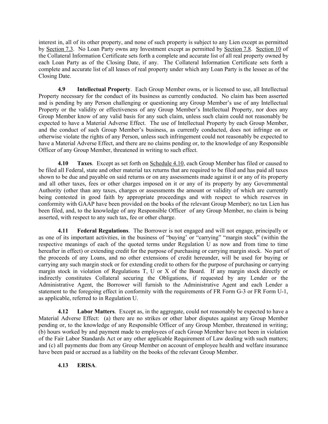 interest in, all of its other property, and none of such property is subject to any Lien except as permitted by Section 7.3. No Loan Party owns any Investment except as permitted by Section 7.8. Section 10 of the Collateral Information Certificate sets forth a complete and accurate list of all real property owned by each Loan Party as of the Closing Date, if any. The Collateral Information Certificate sets forth a complete and accurate list of all leases of real property under which any Loan Party is the lessee as of the Closing Date. 4.9 Intellectual Property. Each Group Member owns, or is licensed to use, all Intellectual Property necessary for the conduct of its business as currently conducted. No claim has been asserted and is pending by any Person challenging or questioning any Group Member’s use of any Intellectual Property or the validity or effectiveness of any Group Member’s Intellectual Property, nor does any Group Member know of any valid basis for any such claim, unless such claim could not reasonably be expected to have a Material Adverse Effect. The use of Intellectual Property by each Group Member, and the conduct of such Group Member’s business, as currently conducted, does not infringe on or otherwise violate the rights of any Person, unless such infringement could not reasonably be expected to have a Material Adverse Effect, and there are no claims pending or, to the knowledge of any Responsible Officer of any Group Member, threatened in writing to such effect. 4.10 Taxes. Except as set forth on Schedule 4.10, each Group Member has filed or caused to be filed all Federal, state and other material tax returns that are required to be filed and has paid all taxes shown to be due and payable on said returns or on any assessments made against it or any of its property and all other taxes, fees or other charges imposed on it or any of its property by any Governmental Authority (other than any taxes, charges or assessments the amount or validity of which are currently being contested in good faith by appropriate proceedings and with respect to which reserves in conformity with GAAP have been provided on the books of the relevant Group Member); no tax Lien has been filed, and, to the knowledge of any Responsible Officer of any Group Member, no claim is being asserted, with respect to any such tax, fee or other charge. 4.11 Federal Regulations. The Borrower is not engaged and will not engage, principally or as one of its important activities, in the business of “buying’ or “carrying” “margin stock” (within the respective meanings of each of the quoted terms under Regulation U as now and from time to time hereafter in effect) or extending credit for the purpose of purchasing or carrying margin stock. No part of the proceeds of any Loans, and no other extensions of credit hereunder, will be used for buying or carrying any such margin stock or for extending credit to others for the purpose of purchasing or carrying margin stock in violation of Regulations T, U or X of the Board. If any margin stock directly or indirectly constitutes Collateral securing the Obligations, if requested by any Lender or the Administrative Agent, the Borrower will furnish to the Administrative Agent and each Lender a statement to the foregoing effect in conformity with the requirements of FR Form G-3 or FR Form U-1, as applicable, referred to in Regulation U. 4.12 Labor Matters. Except as, in the aggregate, could not reasonably be expected to have a Material Adverse Effect: (a) there are no strikes or other labor disputes against any Group Member pending or, to the knowledge of any Responsible Officer of any Group Member, threatened in writing; (b) hours worked by and payment made to employees of each Group Member have not been in violation of the Fair Labor Standards Act or any other applicable Requirement of Law dealing with such matters; and (c) all payments due from any Group Member on account of employee health and welfare insurance have been paid or accrued as a liability on the books of the relevant Group Member. 4.13 ERISA.