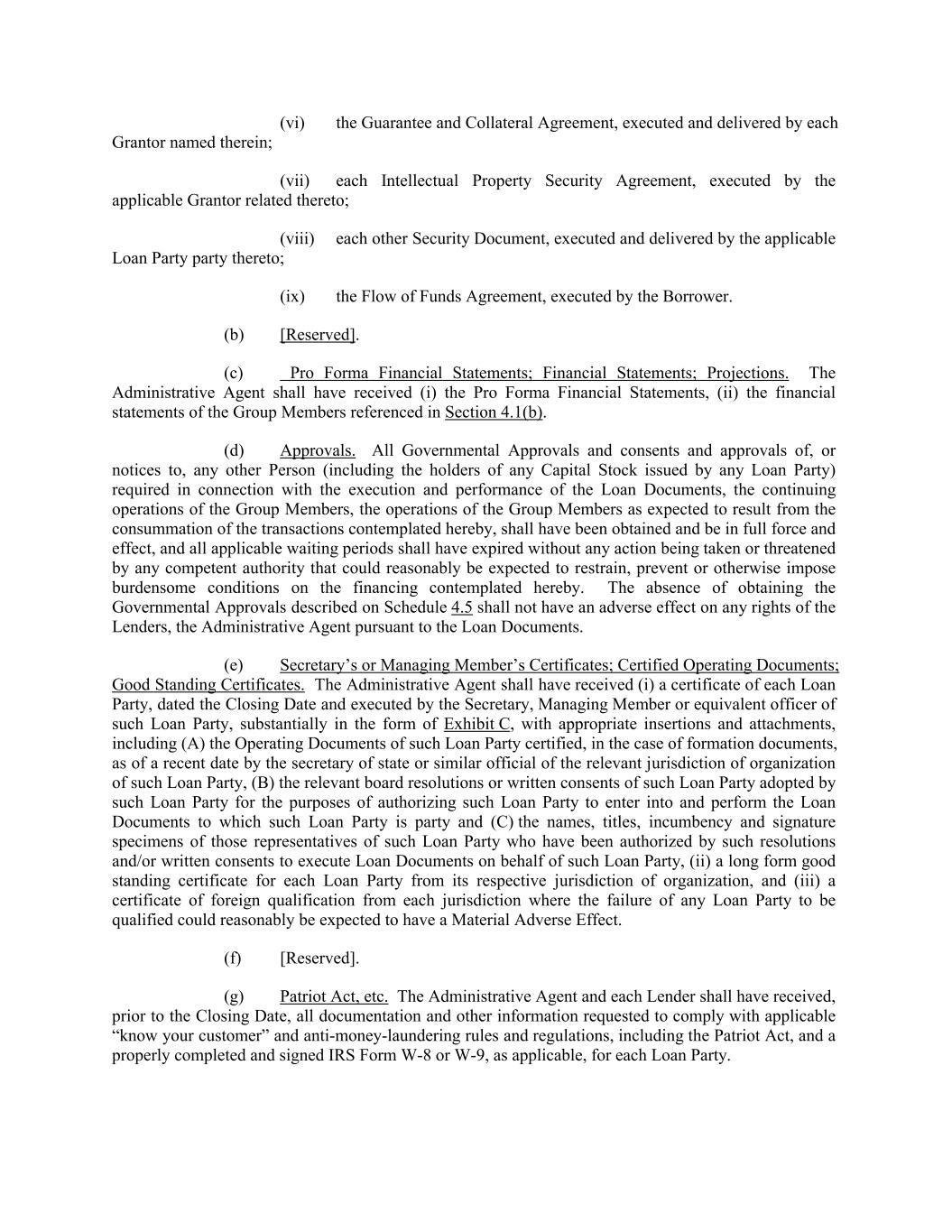 (vi) the Guarantee and Collateral Agreement, executed and delivered by each Grantor named therein; (vii) each Intellectual Property Security Agreement, executed by the applicable Grantor related thereto; (viii) each other Security Document, executed and delivered by the applicable Loan Party party thereto; (ix) the Flow of Funds Agreement, executed by the Borrower. (b) [Reserved]. (c) Pro Forma Financial Statements; Financial Statements; Projections. The Administrative Agent shall have received (i) the Pro Forma Financial Statements, (ii) the financial statements of the Group Members referenced in Section 4.1(b). (d) Approvals. All Governmental Approvals and consents and approvals of, or notices to, any other Person (including the holders of any Capital Stock issued by any Loan Party) required in connection with the execution and performance of the Loan Documents, the continuing operations of the Group Members, the operations of the Group Members as expected to result from the consummation of the transactions contemplated hereby, shall have been obtained and be in full force and effect, and all applicable waiting periods shall have expired without any action being taken or threatened by any competent authority that could reasonably be expected to restrain, prevent or otherwise impose burdensome conditions on the financing contemplated hereby. The absence of obtaining the Governmental Approvals described on Schedule 4.5 shall not have an adverse effect on any rights of the Lenders, the Administrative Agent pursuant to the Loan Documents. (e) Secretary’s or Managing Member’s Certificates; Certified Operating Documents; Good Standing Certificates. The Administrative Agent shall have received (i) a certificate of each Loan Party, dated the Closing Date and executed by the Secretary, Managing Member or equivalent officer of such Loan Party, substantially in the form of Exhibit C, with appropriate insertions and attachments, including (A) the Operating Documents of such Loan Party certified, in the case of formation documents, as of a recent date by the secretary of state or similar official of the relevant jurisdiction of organization of such Loan Party, (B) the relevant board resolutions or written consents of such Loan Party adopted by such Loan Party for the purposes of authorizing such Loan Party to enter into and perform the Loan Documents to which such Loan Party is party and (C) the names, titles, incumbency and signature specimens of those representatives of such Loan Party who have been authorized by such resolutions and/or written consents to execute Loan Documents on behalf of such Loan Party, (ii) a long form good standing certificate for each Loan Party from its respective jurisdiction of organization, and (iii) a certificate of foreign qualification from each jurisdiction where the failure of any Loan Party to be qualified could reasonably be expected to have a Material Adverse Effect. (f) [Reserved]. (g) Patriot Act, etc. The Administrative Agent and each Lender shall have received, prior to the Closing Date, all documentation and other information requested to comply with applicable “know your customer” and anti-money-laundering rules and regulations, including the Patriot Act, and a properly completed and signed IRS Form W-8 or W-9, as applicable, for each Loan Party.