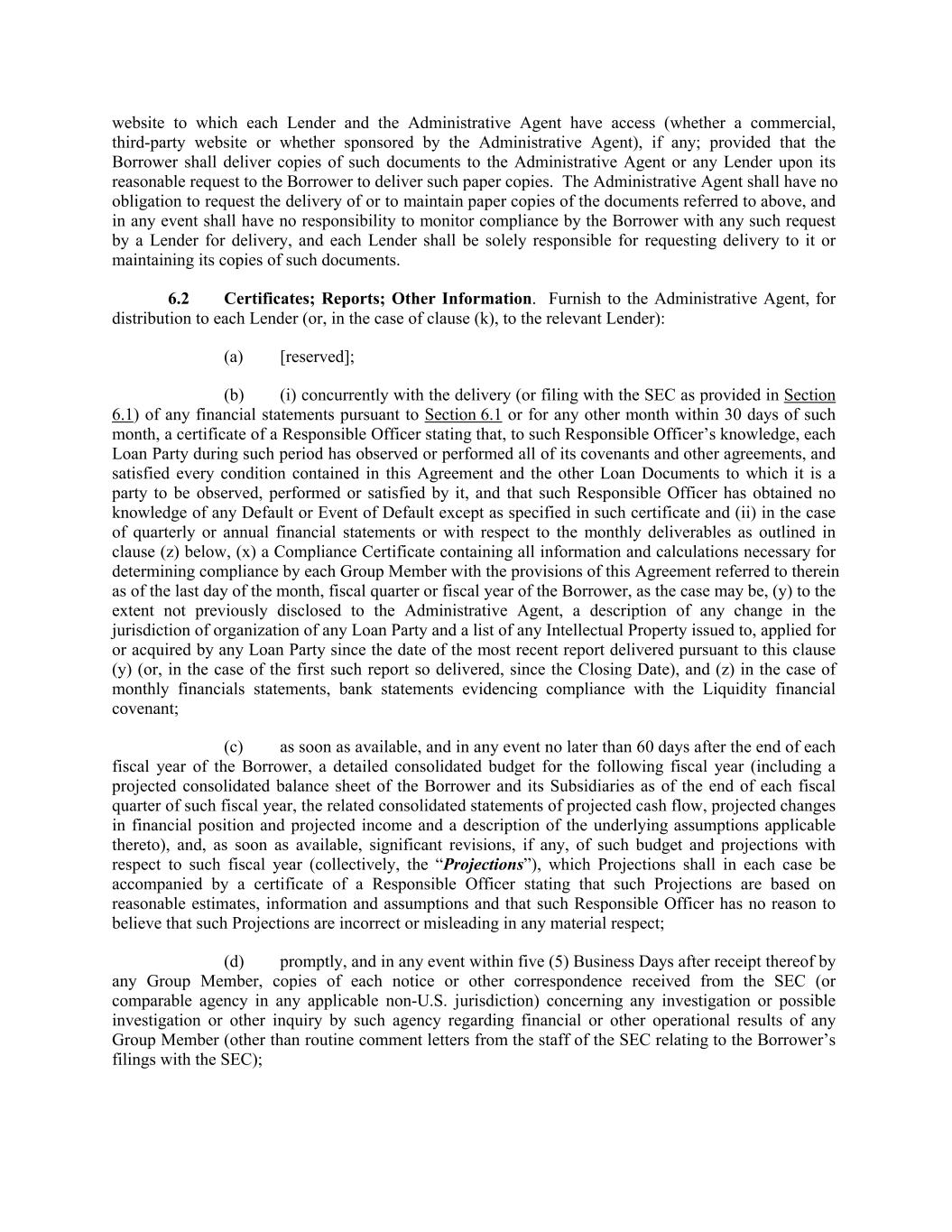 website to which each Lender and the Administrative Agent have access (whether a commercial, third-party website or whether sponsored by the Administrative Agent), if any; provided that the Borrower shall deliver copies of such documents to the Administrative Agent or any Lender upon its reasonable request to the Borrower to deliver such paper copies. The Administrative Agent shall have no obligation to request the delivery of or to maintain paper copies of the documents referred to above, and in any event shall have no responsibility to monitor compliance by the Borrower with any such request by a Lender for delivery, and each Lender shall be solely responsible for requesting delivery to it or maintaining its copies of such documents. 6.2 Certificates; Reports; Other Information. Furnish to the Administrative Agent, for distribution to each Lender (or, in the case of clause (k), to the relevant Lender): (a) [reserved]; (b) (i) concurrently with the delivery (or filing with the SEC as provided in Section 6.1) of any financial statements pursuant to Section 6.1 or for any other month within 30 days of such month, a certificate of a Responsible Officer stating that, to such Responsible Officer’s knowledge, each Loan Party during such period has observed or performed all of its covenants and other agreements, and satisfied every condition contained in this Agreement and the other Loan Documents to which it is a party to be observed, performed or satisfied by it, and that such Responsible Officer has obtained no knowledge of any Default or Event of Default except as specified in such certificate and (ii) in the case of quarterly or annual financial statements or with respect to the monthly deliverables as outlined in clause (z) below, (x) a Compliance Certificate containing all information and calculations necessary for determining compliance by each Group Member with the provisions of this Agreement referred to therein as of the last day of the month, fiscal quarter or fiscal year of the Borrower, as the case may be, (y) to the extent not previously disclosed to the Administrative Agent, a description of any change in the jurisdiction of organization of any Loan Party and a list of any Intellectual Property issued to, applied for or acquired by any Loan Party since the date of the most recent report delivered pursuant to this clause (y) (or, in the case of the first such report so delivered, since the Closing Date), and (z) in the case of monthly financials statements, bank statements evidencing compliance with the Liquidity financial covenant; (c) as soon as available, and in any event no later than 60 days after the end of each fiscal year of the Borrower, a detailed consolidated budget for the following fiscal year (including a projected consolidated balance sheet of the Borrower and its Subsidiaries as of the end of each fiscal quarter of such fiscal year, the related consolidated statements of projected cash flow, projected changes in financial position and projected income and a description of the underlying assumptions applicable thereto), and, as soon as available, significant revisions, if any, of such budget and projections with respect to such fiscal year (collectively, the “Projections”), which Projections shall in each case be accompanied by a certificate of a Responsible Officer stating that such Projections are based on reasonable estimates, information and assumptions and that such Responsible Officer has no reason to believe that such Projections are incorrect or misleading in any material respect; (d) promptly, and in any event within five (5) Business Days after receipt thereof by any Group Member, copies of each notice or other correspondence received from the SEC (or comparable agency in any applicable non-U.S. jurisdiction) concerning any investigation or possible investigation or other inquiry by such agency regarding financial or other operational results of any Group Member (other than routine comment letters from the staff of the SEC relating to the Borrower’s filings with the SEC);