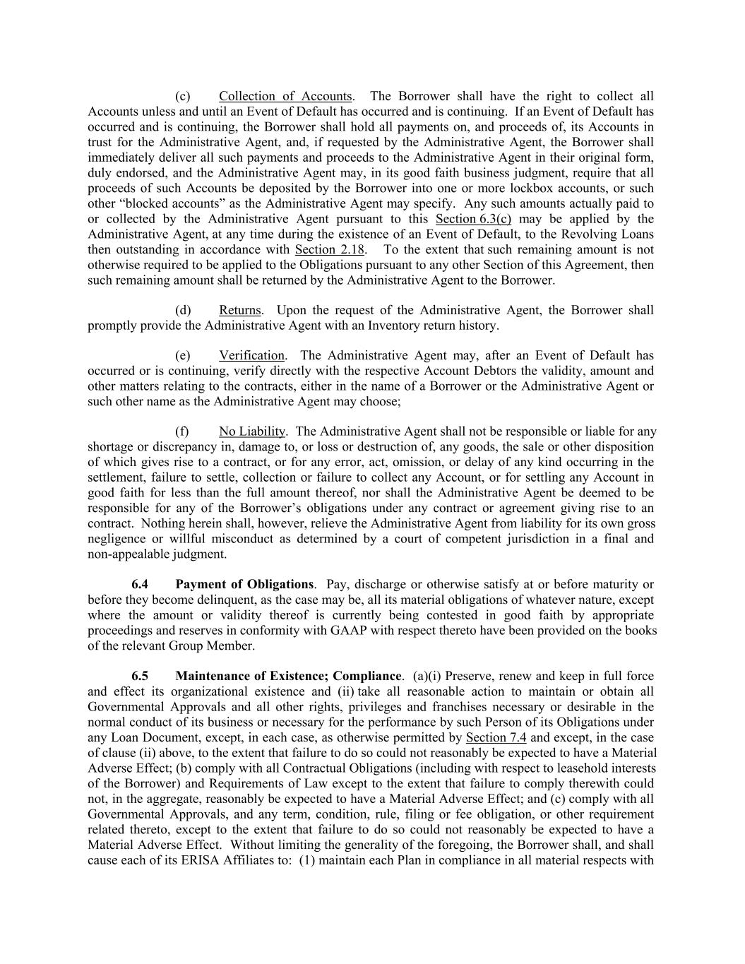 (c) Collection of Accounts. The Borrower shall have the right to collect all Accounts unless and until an Event of Default has occurred and is continuing. If an Event of Default has occurred and is continuing, the Borrower shall hold all payments on, and proceeds of, its Accounts in trust for the Administrative Agent, and, if requested by the Administrative Agent, the Borrower shall immediately deliver all such payments and proceeds to the Administrative Agent in their original form, duly endorsed, and the Administrative Agent may, in its good faith business judgment, require that all proceeds of such Accounts be deposited by the Borrower into one or more lockbox accounts, or such other “blocked accounts” as the Administrative Agent may specify. Any such amounts actually paid to or collected by the Administrative Agent pursuant to this Section 6.3(c) may be applied by the Administrative Agent, at any time during the existence of an Event of Default, to the Revolving Loans then outstanding in accordance with Section 2.18. To the extent that such remaining amount is not otherwise required to be applied to the Obligations pursuant to any other Section of this Agreement, then such remaining amount shall be returned by the Administrative Agent to the Borrower. (d) Returns. Upon the request of the Administrative Agent, the Borrower shall promptly provide the Administrative Agent with an Inventory return history. (e) Verification. The Administrative Agent may, after an Event of Default has occurred or is continuing, verify directly with the respective Account Debtors the validity, amount and other matters relating to the contracts, either in the name of a Borrower or the Administrative Agent or such other name as the Administrative Agent may choose; (f) No Liability. The Administrative Agent shall not be responsible or liable for any shortage or discrepancy in, damage to, or loss or destruction of, any goods, the sale or other disposition of which gives rise to a contract, or for any error, act, omission, or delay of any kind occurring in the settlement, failure to settle, collection or failure to collect any Account, or for settling any Account in good faith for less than the full amount thereof, nor shall the Administrative Agent be deemed to be responsible for any of the Borrower’s obligations under any contract or agreement giving rise to an contract. Nothing herein shall, however, relieve the Administrative Agent from liability for its own gross negligence or willful misconduct as determined by a court of competent jurisdiction in a final and non-appealable judgment. 6.4 Payment of Obligations. Pay, discharge or otherwise satisfy at or before maturity or before they become delinquent, as the case may be, all its material obligations of whatever nature, except where the amount or validity thereof is currently being contested in good faith by appropriate proceedings and reserves in conformity with GAAP with respect thereto have been provided on the books of the relevant Group Member. 6.5 Maintenance of Existence; Compliance. (a)(i) Preserve, renew and keep in full force and effect its organizational existence and (ii) take all reasonable action to maintain or obtain all Governmental Approvals and all other rights, privileges and franchises necessary or desirable in the normal conduct of its business or necessary for the performance by such Person of its Obligations under any Loan Document, except, in each case, as otherwise permitted by Section 7.4 and except, in the case of clause (ii) above, to the extent that failure to do so could not reasonably be expected to have a Material Adverse Effect; (b) comply with all Contractual Obligations (including with respect to leasehold interests of the Borrower) and Requirements of Law except to the extent that failure to comply therewith could not, in the aggregate, reasonably be expected to have a Material Adverse Effect; and (c) comply with all Governmental Approvals, and any term, condition, rule, filing or fee obligation, or other requirement related thereto, except to the extent that failure to do so could not reasonably be expected to have a Material Adverse Effect. Without limiting the generality of the foregoing, the Borrower shall, and shall cause each of its ERISA Affiliates to: (1) maintain each Plan in compliance in all material respects with