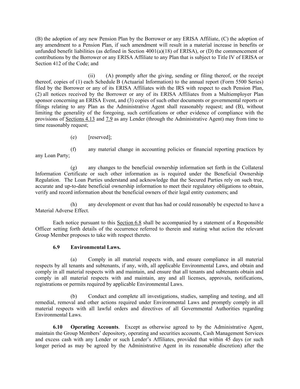 (B) the adoption of any new Pension Plan by the Borrower or any ERISA Affiliate, (C) the adoption of any amendment to a Pension Plan, if such amendment will result in a material increase in benefits or unfunded benefit liabilities (as defined in Section 4001(a)(18) of ERISA), or (D) the commencement of contributions by the Borrower or any ERISA Affiliate to any Plan that is subject to Title IV of ERISA or Section 412 of the Code; and (ii) (A) promptly after the giving, sending or filing thereof, or the receipt thereof, copies of (1) each Schedule B (Actuarial Information) to the annual report (Form 5500 Series) filed by the Borrower or any of its ERISA Affiliates with the IRS with respect to each Pension Plan, (2) all notices received by the Borrower or any of its ERISA Affiliates from a Multiemployer Plan sponsor concerning an ERISA Event, and (3) copies of such other documents or governmental reports or filings relating to any Plan as the Administrative Agent shall reasonably request; and (B), without limiting the generality of the foregoing, such certifications or other evidence of compliance with the provisions of Sections 4.13 and 7.9 as any Lender (through the Administrative Agent) may from time to time reasonably request; (e) [reserved]; (f) any material change in accounting policies or financial reporting practices by any Loan Party; (g) any changes to the beneficial ownership information set forth in the Collateral Information Certificate or such other information as is required under the Beneficial Ownership Regulation. The Loan Parties understand and acknowledge that the Secured Parties rely on such true, accurate and up-to-date beneficial ownership information to meet their regulatory obligations to obtain, verify and record information about the beneficial owners of their legal entity customers; and (h) any development or event that has had or could reasonably be expected to have a Material Adverse Effect. Each notice pursuant to this Section 6.8 shall be accompanied by a statement of a Responsible Officer setting forth details of the occurrence referred to therein and stating what action the relevant Group Member proposes to take with respect thereto. 6.9 Environmental Laws. (a) Comply in all material respects with, and ensure compliance in all material respects by all tenants and subtenants, if any, with, all applicable Environmental Laws, and obtain and comply in all material respects with and maintain, and ensure that all tenants and subtenants obtain and comply in all material respects with and maintain, any and all licenses, approvals, notifications, registrations or permits required by applicable Environmental Laws. (b) Conduct and complete all investigations, studies, sampling and testing, and all remedial, removal and other actions required under Environmental Laws and promptly comply in all material respects with all lawful orders and directives of all Governmental Authorities regarding Environmental Laws. 6.10 Operating Accounts. Except as otherwise agreed to by the Administrative Agent, maintain the Group Members’ depository, operating and securities accounts, Cash Management Services and excess cash with any Lender or such Lender’s Affiliates, provided that within 45 days (or such longer period as may be agreed by the Administrative Agent in its reasonable discretion) after the