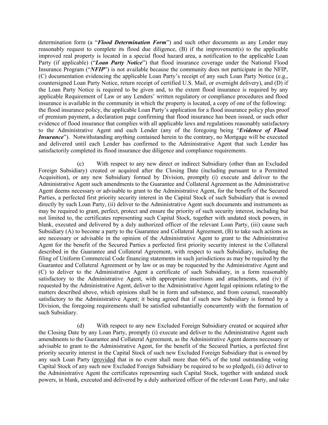 determination form (a “Flood Determination Form”) and such other documents as any Lender may reasonably request to complete its flood due diligence, (B) if the improvement(s) to the applicable improved real property is located in a special flood hazard area, a notification to the applicable Loan Party (if applicable) (“Loan Party Notice”) that flood insurance coverage under the National Flood Insurance Program (“NFIP”) is not available because the community does not participate in the NFIP, (C) documentation evidencing the applicable Loan Party’s receipt of any such Loan Party Notice (e.g., countersigned Loan Party Notice, return receipt of certified U.S. Mail, or overnight delivery), and (D) if the Loan Party Notice is required to be given and, to the extent flood insurance is required by any applicable Requirement of Law or any Lenders’ written regulatory or compliance procedures and flood insurance is available in the community in which the property is located, a copy of one of the following: the flood insurance policy, the applicable Loan Party’s application for a flood insurance policy plus proof of premium payment, a declaration page confirming that flood insurance has been issued, or such other evidence of flood insurance that complies with all applicable laws and regulations reasonably satisfactory to the Administrative Agent and each Lender (any of the foregoing being “Evidence of Flood Insurance”). Notwithstanding anything contained herein to the contrary, no Mortgage will be executed and delivered until each Lender has confirmed to the Administrative Agent that such Lender has satisfactorily completed its flood insurance due diligence and compliance requirements. (c) With respect to any new direct or indirect Subsidiary (other than an Excluded Foreign Subsidiary) created or acquired after the Closing Date (including pursuant to a Permitted Acquisition), or any new Subsidiary formed by Division, promptly (i) execute and deliver to the Administrative Agent such amendments to the Guarantee and Collateral Agreement as the Administrative Agent deems necessary or advisable to grant to the Administrative Agent, for the benefit of the Secured Parties, a perfected first priority security interest in the Capital Stock of such Subsidiary that is owned directly by such Loan Party, (ii) deliver to the Administrative Agent such documents and instruments as may be required to grant, perfect, protect and ensure the priority of such security interest, including but not limited to, the certificates representing such Capital Stock, together with undated stock powers, in blank, executed and delivered by a duly authorized officer of the relevant Loan Party, (iii) cause such Subsidiary (A) to become a party to the Guarantee and Collateral Agreement, (B) to take such actions as are necessary or advisable in the opinion of the Administrative Agent to grant to the Administrative Agent for the benefit of the Secured Parties a perfected first priority security interest in the Collateral described in the Guarantee and Collateral Agreement, with respect to such Subsidiary, including the filing of Uniform Commercial Code financing statements in such jurisdictions as may be required by the Guarantee and Collateral Agreement or by law or as may be requested by the Administrative Agent and (C) to deliver to the Administrative Agent a certificate of such Subsidiary, in a form reasonably satisfactory to the Administrative Agent, with appropriate insertions and attachments, and (iv) if requested by the Administrative Agent, deliver to the Administrative Agent legal opinions relating to the matters described above, which opinions shall be in form and substance, and from counsel, reasonably satisfactory to the Administrative Agent; it being agreed that if such new Subsidiary is formed by a Division, the foregoing requirements shall be satisfied substantially concurrently with the formation of such Subsidiary. (d) With respect to any new Excluded Foreign Subsidiary created or acquired after the Closing Date by any Loan Party, promptly (i) execute and deliver to the Administrative Agent such amendments to the Guarantee and Collateral Agreement, as the Administrative Agent deems necessary or advisable to grant to the Administrative Agent, for the benefit of the Secured Parties, a perfected first priority security interest in the Capital Stock of such new Excluded Foreign Subsidiary that is owned by any such Loan Party (provided that in no event shall more than 66% of the total outstanding voting Capital Stock of any such new Excluded Foreign Subsidiary be required to be so pledged), (ii) deliver to the Administrative Agent the certificates representing such Capital Stock, together with undated stock powers, in blank, executed and delivered by a duly authorized officer of the relevant Loan Party, and take