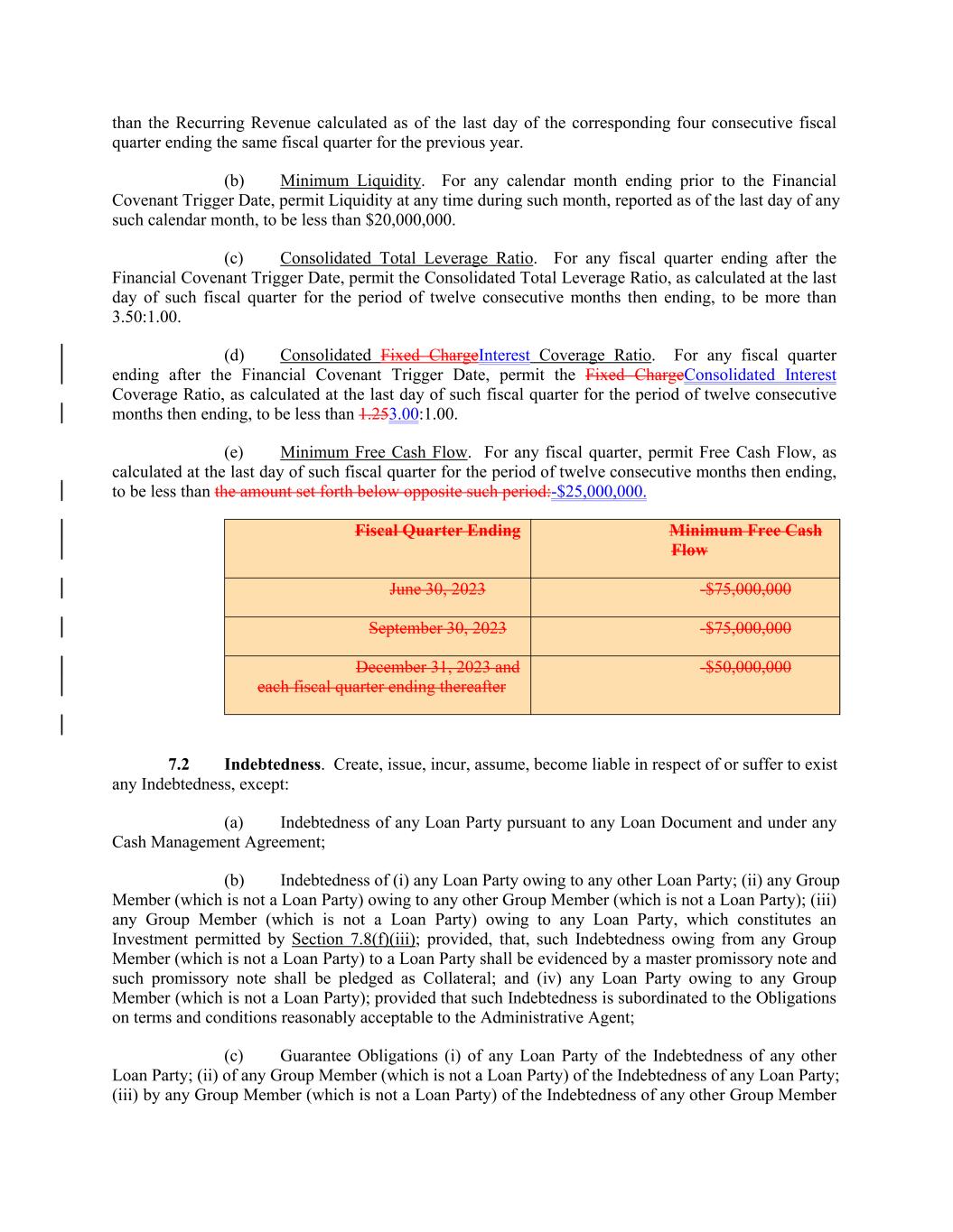 -$75,000,000 Fiscal Quarter Ending September 30, 2023 Minimum Free Cash Flow -$75,000,000 than the Recurring Revenue calculated as of the last day of the corresponding four consecutive fiscal quarter ending the same fiscal quarter for the previous year. (b) Minimum Liquidity. For any calendar month ending prior to the Financial Covenant Trigger Date, permit Liquidity at any time during such month, reported as of the last day of any such calendar month, to be less than $20,000,000. (c) Consolidated Total Leverage Ratio. For any fiscal quarter ending after the Financial Covenant Trigger Date, permit the Consolidated Total Leverage Ratio, as calculated at the last day of such fiscal quarter for the period of twelve consecutive months then ending, to be more than 3.50:1.00. (d) Consolidated Fixed ChargeInterest Coverage Ratio. For any fiscal quarter ending after the Financial Covenant Trigger Date, permit the Fixed ChargeConsolidated Interest Coverage Ratio, as calculated at the last day of such fiscal quarter for the period of twelve consecutive months then ending, to be less than 1.253.00:1.00. (e) Minimum Free Cash Flow. For any fiscal quarter, permit Free Cash Flow, as calculated at the last day of such fiscal quarter for the period of twelve consecutive months then ending, to be less than the amount set forth below opposite such period:-$25,000,000. December 31, 2023 and each fiscal quarter ending thereafter -$50,000,000 June 30, 2023 7.2 Indebtedness. Create, issue, incur, assume, become liable in respect of or suffer to exist any Indebtedness, except: (a) Indebtedness of any Loan Party pursuant to any Loan Document and under any Cash Management Agreement; (b) Indebtedness of (i) any Loan Party owing to any other Loan Party; (ii) any Group Member (which is not a Loan Party) owing to any other Group Member (which is not a Loan Party); (iii) any Group Member (which is not a Loan Party) owing to any Loan Party, which constitutes an Investment permitted by Section 7.8(f)(iii); provided, that, such Indebtedness owing from any Group Member (which is not a Loan Party) to a Loan Party shall be evidenced by a master promissory note and such promissory note shall be pledged as Collateral; and (iv) any Loan Party owing to any Group Member (which is not a Loan Party); provided that such Indebtedness is subordinated to the Obligations on terms and conditions reasonably acceptable to the Administrative Agent; (c) Guarantee Obligations (i) of any Loan Party of the Indebtedness of any other Loan Party; (ii) of any Group Member (which is not a Loan Party) of the Indebtedness of any Loan Party; (iii) by any Group Member (which is not a Loan Party) of the Indebtedness of any other Group Member