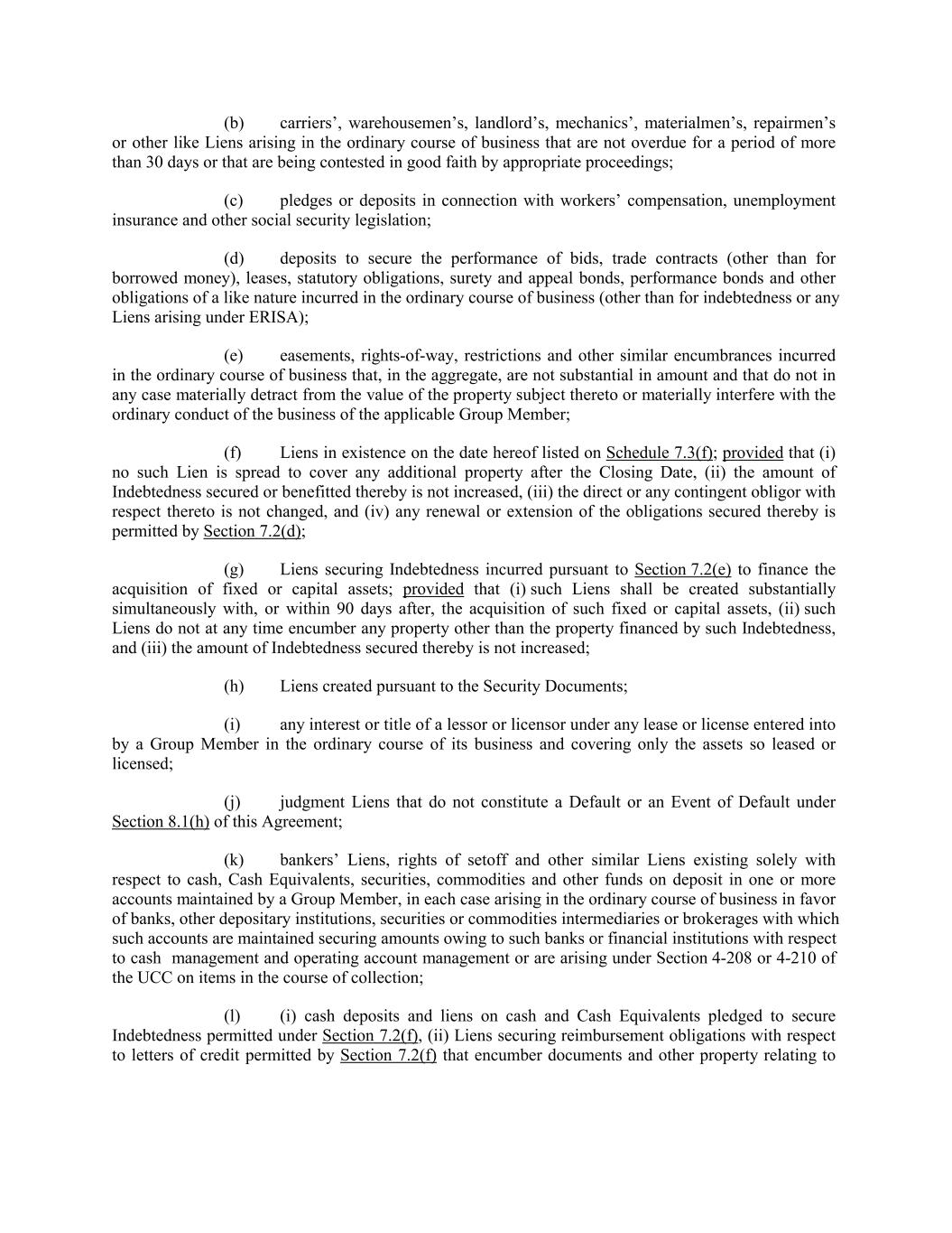 (b) carriers’, warehousemen’s, landlord’s, mechanics’, materialmen’s, repairmen’s or other like Liens arising in the ordinary course of business that are not overdue for a period of more than 30 days or that are being contested in good faith by appropriate proceedings; (c) pledges or deposits in connection with workers’ compensation, unemployment insurance and other social security legislation; (d) deposits to secure the performance of bids, trade contracts (other than for borrowed money), leases, statutory obligations, surety and appeal bonds, performance bonds and other obligations of a like nature incurred in the ordinary course of business (other than for indebtedness or any Liens arising under ERISA); (e) easements, rights-of-way, restrictions and other similar encumbrances incurred in the ordinary course of business that, in the aggregate, are not substantial in amount and that do not in any case materially detract from the value of the property subject thereto or materially interfere with the ordinary conduct of the business of the applicable Group Member; (f) Liens in existence on the date hereof listed on Schedule 7.3(f); provided that (i) no such Lien is spread to cover any additional property after the Closing Date, (ii) the amount of Indebtedness secured or benefitted thereby is not increased, (iii) the direct or any contingent obligor with respect thereto is not changed, and (iv) any renewal or extension of the obligations secured thereby is permitted by Section 7.2(d); (g) Liens securing Indebtedness incurred pursuant to Section 7.2(e) to finance the acquisition of fixed or capital assets; provided that (i) such Liens shall be created substantially simultaneously with, or within 90 days after, the acquisition of such fixed or capital assets, (ii) such Liens do not at any time encumber any property other than the property financed by such Indebtedness, and (iii) the amount of Indebtedness secured thereby is not increased; (h) Liens created pursuant to the Security Documents; (i) any interest or title of a lessor or licensor under any lease or license entered into by a Group Member in the ordinary course of its business and covering only the assets so leased or licensed; (j) judgment Liens that do not constitute a Default or an Event of Default under Section 8.1(h) of this Agreement; (k) bankers’ Liens, rights of setoff and other similar Liens existing solely with respect to cash, Cash Equivalents, securities, commodities and other funds on deposit in one or more accounts maintained by a Group Member, in each case arising in the ordinary course of business in favor of banks, other depositary institutions, securities or commodities intermediaries or brokerages with which such accounts are maintained securing amounts owing to such banks or financial institutions with respect to cash management and operating account management or are arising under Section 4-208 or 4-210 of the UCC on items in the course of collection; (l) (i) cash deposits and liens on cash and Cash Equivalents pledged to secure Indebtedness permitted under Section 7.2(f), (ii) Liens securing reimbursement obligations with respect to letters of credit permitted by Section 7.2(f) that encumber documents and other property relating to