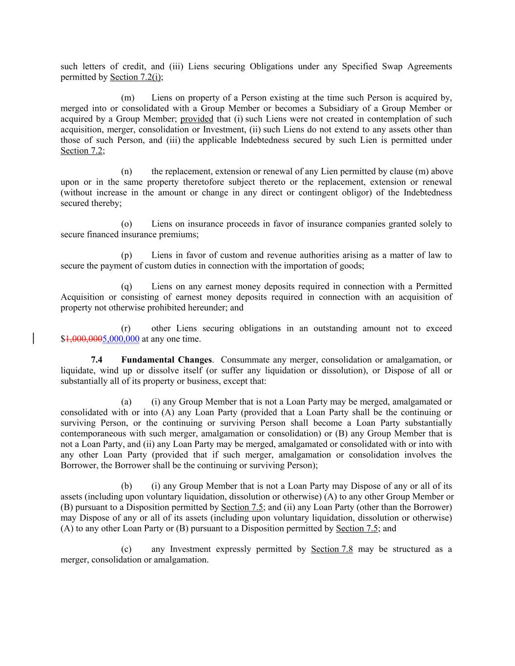 such letters of credit, and (iii) Liens securing Obligations under any Specified Swap Agreements permitted by Section 7.2(i); (m) Liens on property of a Person existing at the time such Person is acquired by, merged into or consolidated with a Group Member or becomes a Subsidiary of a Group Member or acquired by a Group Member; provided that (i) such Liens were not created in contemplation of such acquisition, merger, consolidation or Investment, (ii) such Liens do not extend to any assets other than those of such Person, and (iii) the applicable Indebtedness secured by such Lien is permitted under Section 7.2; (n) the replacement, extension or renewal of any Lien permitted by clause (m) above upon or in the same property theretofore subject thereto or the replacement, extension or renewal (without increase in the amount or change in any direct or contingent obligor) of the Indebtedness secured thereby; (o) Liens on insurance proceeds in favor of insurance companies granted solely to secure financed insurance premiums; (p) Liens in favor of custom and revenue authorities arising as a matter of law to secure the payment of custom duties in connection with the importation of goods; (q) Liens on any earnest money deposits required in connection with a Permitted Acquisition or consisting of earnest money deposits required in connection with an acquisition of property not otherwise prohibited hereunder; and (r) other Liens securing obligations in an outstanding amount not to exceed $1,000,0005,000,000 at any one time. 7.4 Fundamental Changes. Consummate any merger, consolidation or amalgamation, or liquidate, wind up or dissolve itself (or suffer any liquidation or dissolution), or Dispose of all or substantially all of its property or business, except that: (a) (i) any Group Member that is not a Loan Party may be merged, amalgamated or consolidated with or into (A) any Loan Party (provided that a Loan Party shall be the continuing or surviving Person, or the continuing or surviving Person shall become a Loan Party substantially contemporaneous with such merger, amalgamation or consolidation) or (B) any Group Member that is not a Loan Party, and (ii) any Loan Party may be merged, amalgamated or consolidated with or into with any other Loan Party (provided that if such merger, amalgamation or consolidation involves the Borrower, the Borrower shall be the continuing or surviving Person); (b) (i) any Group Member that is not a Loan Party may Dispose of any or all of its assets (including upon voluntary liquidation, dissolution or otherwise) (A) to any other Group Member or (B) pursuant to a Disposition permitted by Section 7.5; and (ii) any Loan Party (other than the Borrower) may Dispose of any or all of its assets (including upon voluntary liquidation, dissolution or otherwise) (A) to any other Loan Party or (B) pursuant to a Disposition permitted by Section 7.5; and (c) any Investment expressly permitted by Section 7.8 may be structured as a merger, consolidation or amalgamation.
