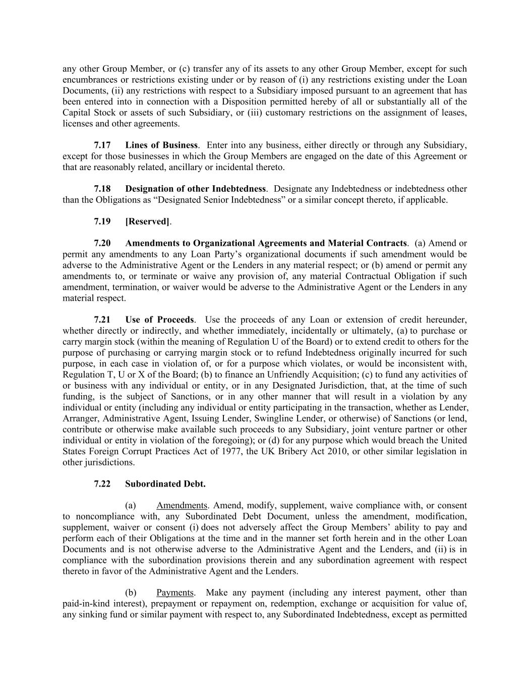 any other Group Member, or (c) transfer any of its assets to any other Group Member, except for such encumbrances or restrictions existing under or by reason of (i) any restrictions existing under the Loan Documents, (ii) any restrictions with respect to a Subsidiary imposed pursuant to an agreement that has been entered into in connection with a Disposition permitted hereby of all or substantially all of the Capital Stock or assets of such Subsidiary, or (iii) customary restrictions on the assignment of leases, licenses and other agreements. 7.17 Lines of Business. Enter into any business, either directly or through any Subsidiary, except for those businesses in which the Group Members are engaged on the date of this Agreement or that are reasonably related, ancillary or incidental thereto. 7.18 Designation of other Indebtedness. Designate any Indebtedness or indebtedness other than the Obligations as “Designated Senior Indebtedness” or a similar concept thereto, if applicable. 7.19 [Reserved]. 7.20 Amendments to Organizational Agreements and Material Contracts. (a) Amend or permit any amendments to any Loan Party’s organizational documents if such amendment would be adverse to the Administrative Agent or the Lenders in any material respect; or (b) amend or permit any amendments to, or terminate or waive any provision of, any material Contractual Obligation if such amendment, termination, or waiver would be adverse to the Administrative Agent or the Lenders in any material respect. 7.21 Use of Proceeds. Use the proceeds of any Loan or extension of credit hereunder, whether directly or indirectly, and whether immediately, incidentally or ultimately, (a) to purchase or carry margin stock (within the meaning of Regulation U of the Board) or to extend credit to others for the purpose of purchasing or carrying margin stock or to refund Indebtedness originally incurred for such purpose, in each case in violation of, or for a purpose which violates, or would be inconsistent with, Regulation T, U or X of the Board; (b) to finance an Unfriendly Acquisition; (c) to fund any activities of or business with any individual or entity, or in any Designated Jurisdiction, that, at the time of such funding, is the subject of Sanctions, or in any other manner that will result in a violation by any individual or entity (including any individual or entity participating in the transaction, whether as Lender, Arranger, Administrative Agent, Issuing Lender, Swingline Lender, or otherwise) of Sanctions (or lend, contribute or otherwise make available such proceeds to any Subsidiary, joint venture partner or other individual or entity in violation of the foregoing); or (d) for any purpose which would breach the United States Foreign Corrupt Practices Act of 1977, the UK Bribery Act 2010, or other similar legislation in other jurisdictions. 7.22 Subordinated Debt. (a) Amendments. Amend, modify, supplement, waive compliance with, or consent to noncompliance with, any Subordinated Debt Document, unless the amendment, modification, supplement, waiver or consent (i) does not adversely affect the Group Members’ ability to pay and perform each of their Obligations at the time and in the manner set forth herein and in the other Loan Documents and is not otherwise adverse to the Administrative Agent and the Lenders, and (ii) is in compliance with the subordination provisions therein and any subordination agreement with respect thereto in favor of the Administrative Agent and the Lenders. (b) Payments. Make any payment (including any interest payment, other than paid-in-kind interest), prepayment or repayment on, redemption, exchange or acquisition for value of, any sinking fund or similar payment with respect to, any Subordinated Indebtedness, except as permitted