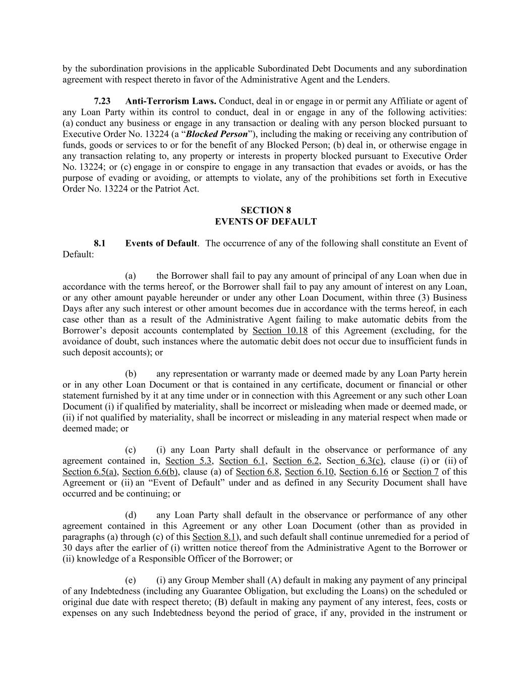 by the subordination provisions in the applicable Subordinated Debt Documents and any subordination agreement with respect thereto in favor of the Administrative Agent and the Lenders. 7.23 Anti-Terrorism Laws. Conduct, deal in or engage in or permit any Affiliate or agent of any Loan Party within its control to conduct, deal in or engage in any of the following activities: (a) conduct any business or engage in any transaction or dealing with any person blocked pursuant to Executive Order No. 13224 (a “Blocked Person”), including the making or receiving any contribution of funds, goods or services to or for the benefit of any Blocked Person; (b) deal in, or otherwise engage in any transaction relating to, any property or interests in property blocked pursuant to Executive Order No. 13224; or (c) engage in or conspire to engage in any transaction that evades or avoids, or has the purpose of evading or avoiding, or attempts to violate, any of the prohibitions set forth in Executive Order No. 13224 or the Patriot Act. SECTION 8 EVENTS OF DEFAULT 8.1 Events of Default. The occurrence of any of the following shall constitute an Event of Default: (a) the Borrower shall fail to pay any amount of principal of any Loan when due in accordance with the terms hereof, or the Borrower shall fail to pay any amount of interest on any Loan, or any other amount payable hereunder or under any other Loan Document, within three (3) Business Days after any such interest or other amount becomes due in accordance with the terms hereof, in each case other than as a result of the Administrative Agent failing to make automatic debits from the Borrower’s deposit accounts contemplated by Section 10.18 of this Agreement (excluding, for the avoidance of doubt, such instances where the automatic debit does not occur due to insufficient funds in such deposit accounts); or (b) any representation or warranty made or deemed made by any Loan Party herein or in any other Loan Document or that is contained in any certificate, document or financial or other statement furnished by it at any time under or in connection with this Agreement or any such other Loan Document (i) if qualified by materiality, shall be incorrect or misleading when made or deemed made, or (ii) if not qualified by materiality, shall be incorrect or misleading in any material respect when made or deemed made; or (c) (i) any Loan Party shall default in the observance or performance of any agreement contained in, Section 5.3, Section 6.1, Section 6.2, Section 6.3(c), clause (i) or (ii) of Section 6.5(a), Section 6.6(b), clause (a) of Section 6.8, Section 6.10, Section 6.16 or Section 7 of this Agreement or (ii) an “Event of Default” under and as defined in any Security Document shall have occurred and be continuing; or (d) any Loan Party shall default in the observance or performance of any other agreement contained in this Agreement or any other Loan Document (other than as provided in paragraphs (a) through (c) of this Section 8.1), and such default shall continue unremedied for a period of 30 days after the earlier of (i) written notice thereof from the Administrative Agent to the Borrower or (ii) knowledge of a Responsible Officer of the Borrower; or (e) (i) any Group Member shall (A) default in making any payment of any principal of any Indebtedness (including any Guarantee Obligation, but excluding the Loans) on the scheduled or original due date with respect thereto; (B) default in making any payment of any interest, fees, costs or expenses on any such Indebtedness beyond the period of grace, if any, provided in the instrument or