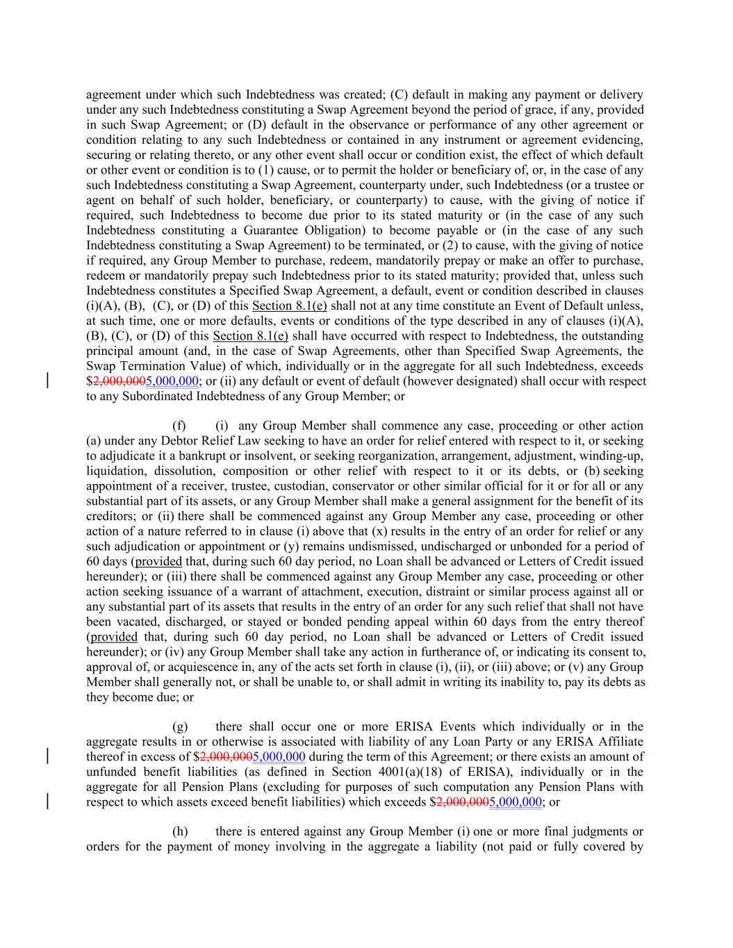 agreement under which such Indebtedness was created; (C) default in making any payment or delivery under any such Indebtedness constituting a Swap Agreement beyond the period of grace, if any, provided in such Swap Agreement; or (D) default in the observance or performance of any other agreement or condition relating to any such Indebtedness or contained in any instrument or agreement evidencing, securing or relating thereto, or any other event shall occur or condition exist, the effect of which default or other event or condition is to (1) cause, or to permit the holder or beneficiary of, or, in the case of any such Indebtedness constituting a Swap Agreement, counterparty under, such Indebtedness (or a trustee or agent on behalf of such holder, beneficiary, or counterparty) to cause, with the giving of notice if required, such Indebtedness to become due prior to its stated maturity or (in the case of any such Indebtedness constituting a Guarantee Obligation) to become payable or (in the case of any such Indebtedness constituting a Swap Agreement) to be terminated, or (2) to cause, with the giving of notice if required, any Group Member to purchase, redeem, mandatorily prepay or make an offer to purchase, redeem or mandatorily prepay such Indebtedness prior to its stated maturity; provided that, unless such Indebtedness constitutes a Specified Swap Agreement, a default, event or condition described in clauses (i)(A), (B), (C), or (D) of this Section 8.1(e) shall not at any time constitute an Event of Default unless, at such time, one or more defaults, events or conditions of the type described in any of clauses (i)(A), (B), (C), or (D) of this Section 8.1(e) shall have occurred with respect to Indebtedness, the outstanding principal amount (and, in the case of Swap Agreements, other than Specified Swap Agreements, the Swap Termination Value) of which, individually or in the aggregate for all such Indebtedness, exceeds $2,000,0005,000,000; or (ii) any default or event of default (however designated) shall occur with respect to any Subordinated Indebtedness of any Group Member; or (f) (i) any Group Member shall commence any case, proceeding or other action (a) under any Debtor Relief Law seeking to have an order for relief entered with respect to it, or seeking to adjudicate it a bankrupt or insolvent, or seeking reorganization, arrangement, adjustment, winding-up, liquidation, dissolution, composition or other relief with respect to it or its debts, or (b) seeking appointment of a receiver, trustee, custodian, conservator or other similar official for it or for all or any substantial part of its assets, or any Group Member shall make a general assignment for the benefit of its creditors; or (ii) there shall be commenced against any Group Member any case, proceeding or other action of a nature referred to in clause (i) above that (x) results in the entry of an order for relief or any such adjudication or appointment or (y) remains undismissed, undischarged or unbonded for a period of 60 days (provided that, during such 60 day period, no Loan shall be advanced or Letters of Credit issued hereunder); or (iii) there shall be commenced against any Group Member any case, proceeding or other action seeking issuance of a warrant of attachment, execution, distraint or similar process against all or any substantial part of its assets that results in the entry of an order for any such relief that shall not have been vacated, discharged, or stayed or bonded pending appeal within 60 days from the entry thereof (provided that, during such 60 day period, no Loan shall be advanced or Letters of Credit issued hereunder); or (iv) any Group Member shall take any action in furtherance of, or indicating its consent to, approval of, or acquiescence in, any of the acts set forth in clause (i), (ii), or (iii) above; or (v) any Group Member shall generally not, or shall be unable to, or shall admit in writing its inability to, pay its debts as they become due; or (g) there shall occur one or more ERISA Events which individually or in the aggregate results in or otherwise is associated with liability of any Loan Party or any ERISA Affiliate thereof in excess of $2,000,0005,000,000 during the term of this Agreement; or there exists an amount of unfunded benefit liabilities (as defined in Section 4001(a)(18) of ERISA), individually or in the aggregate for all Pension Plans (excluding for purposes of such computation any Pension Plans with respect to which assets exceed benefit liabilities) which exceeds $2,000,0005,000,000; or (h) there is entered against any Group Member (i) one or more final judgments or orders for the payment of money involving in the aggregate a liability (not paid or fully covered by