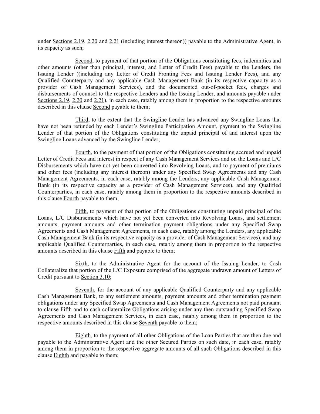under Sections 2.19, 2.20 and 2.21 (including interest thereon)) payable to the Administrative Agent, in its capacity as such; Second, to payment of that portion of the Obligations constituting fees, indemnities and other amounts (other than principal, interest, and Letter of Credit Fees) payable to the Lenders, the Issuing Lender ((including any Letter of Credit Fronting Fees and Issuing Lender Fees), and any Qualified Counterparty and any applicable Cash Management Bank (in its respective capacity as a provider of Cash Management Services), and the documented out-of-pocket fees, charges and disbursements of counsel to the respective Lenders and the Issuing Lender, and amounts payable under Sections 2.19, 2.20 and 2.21), in each case, ratably among them in proportion to the respective amounts described in this clause Second payable to them; Third, to the extent that the Swingline Lender has advanced any Swingline Loans that have not been refunded by each Lender’s Swingline Participation Amount, payment to the Swingline Lender of that portion of the Obligations constituting the unpaid principal of and interest upon the Swingline Loans advanced by the Swingline Lender; Fourth, to the payment of that portion of the Obligations constituting accrued and unpaid Letter of Credit Fees and interest in respect of any Cash Management Services and on the Loans and L/C Disbursements which have not yet been converted into Revolving Loans, and to payment of premiums and other fees (including any interest thereon) under any Specified Swap Agreements and any Cash Management Agreements, in each case, ratably among the Lenders, any applicable Cash Management Bank (in its respective capacity as a provider of Cash Management Services), and any Qualified Counterparties, in each case, ratably among them in proportion to the respective amounts described in this clause Fourth payable to them; Fifth, to payment of that portion of the Obligations constituting unpaid principal of the Loans, L/C Disbursements which have not yet been converted into Revolving Loans, and settlement amounts, payment amounts and other termination payment obligations under any Specified Swap Agreements and Cash Management Agreements, in each case, ratably among the Lenders, any applicable Cash Management Bank (in its respective capacity as a provider of Cash Management Services), and any applicable Qualified Counterparties, in each case, ratably among them in proportion to the respective amounts described in this clause Fifth and payable to them; Sixth, to the Administrative Agent for the account of the Issuing Lender, to Cash Collateralize that portion of the L/C Exposure comprised of the aggregate undrawn amount of Letters of Credit pursuant to Section 3.10; Seventh, for the account of any applicable Qualified Counterparty and any applicable Cash Management Bank, to any settlement amounts, payment amounts and other termination payment obligations under any Specified Swap Agreements and Cash Management Agreements not paid pursuant to clause Fifth and to cash collateralize Obligations arising under any then outstanding Specified Swap Agreements and Cash Management Services, in each case, ratably among them in proportion to the respective amounts described in this clause Seventh payable to them; Eighth, to the payment of all other Obligations of the Loan Parties that are then due and payable to the Administrative Agent and the other Secured Parties on such date, in each case, ratably among them in proportion to the respective aggregate amounts of all such Obligations described in this clause Eighth and payable to them;