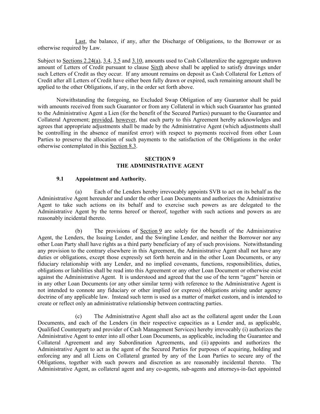Last, the balance, if any, after the Discharge of Obligations, to the Borrower or as otherwise required by Law. Subject to Sections 2.24(a), 3.4, 3.5 and 3.10, amounts used to Cash Collateralize the aggregate undrawn amount of Letters of Credit pursuant to clause Sixth above shall be applied to satisfy drawings under such Letters of Credit as they occur. If any amount remains on deposit as Cash Collateral for Letters of Credit after all Letters of Credit have either been fully drawn or expired, such remaining amount shall be applied to the other Obligations, if any, in the order set forth above. Notwithstanding the foregoing, no Excluded Swap Obligation of any Guarantor shall be paid with amounts received from such Guarantor or from any Collateral in which such Guarantor has granted to the Administrative Agent a Lien (for the benefit of the Secured Parties) pursuant to the Guarantee and Collateral Agreement; provided, however, that each party to this Agreement hereby acknowledges and agrees that appropriate adjustments shall be made by the Administrative Agent (which adjustments shall be controlling in the absence of manifest error) with respect to payments received from other Loan Parties to preserve the allocation of such payments to the satisfaction of the Obligations in the order otherwise contemplated in this Section 8.3. SECTION 9 THE ADMINISTRATIVE AGENT 9.1 Appointment and Authority. (a) Each of the Lenders hereby irrevocably appoints SVB to act on its behalf as the Administrative Agent hereunder and under the other Loan Documents and authorizes the Administrative Agent to take such actions on its behalf and to exercise such powers as are delegated to the Administrative Agent by the terms hereof or thereof, together with such actions and powers as are reasonably incidental thereto. (b) The provisions of Section 9 are solely for the benefit of the Administrative Agent, the Lenders, the Issuing Lender, and the Swingline Lender, and neither the Borrower nor any other Loan Party shall have rights as a third party beneficiary of any of such provisions. Notwithstanding any provision to the contrary elsewhere in this Agreement, the Administrative Agent shall not have any duties or obligations, except those expressly set forth herein and in the other Loan Documents, or any fiduciary relationship with any Lender, and no implied covenants, functions, responsibilities, duties, obligations or liabilities shall be read into this Agreement or any other Loan Document or otherwise exist against the Administrative Agent. It is understood and agreed that the use of the term “agent” herein or in any other Loan Documents (or any other similar term) with reference to the Administrative Agent is not intended to connote any fiduciary or other implied (or express) obligations arising under agency doctrine of any applicable law. Instead such term is used as a matter of market custom, and is intended to create or reflect only an administrative relationship between contracting parties. (c) The Administrative Agent shall also act as the collateral agent under the Loan Documents, and each of the Lenders (in their respective capacities as a Lender and, as applicable, Qualified Counterparty and provider of Cash Management Services) hereby irrevocably (i) authorizes the Administrative Agent to enter into all other Loan Documents, as applicable, including the Guarantee and Collateral Agreement and any Subordination Agreements, and (ii) appoints and authorizes the Administrative Agent to act as the agent of the Secured Parties for purposes of acquiring, holding and enforcing any and all Liens on Collateral granted by any of the Loan Parties to secure any of the Obligations, together with such powers and discretion as are reasonably incidental thereto. The Administrative Agent, as collateral agent and any co-agents, sub-agents and attorneys-in-fact appointed