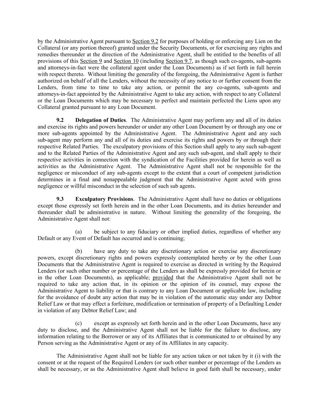 by the Administrative Agent pursuant to Section 9.2 for purposes of holding or enforcing any Lien on the Collateral (or any portion thereof) granted under the Security Documents, or for exercising any rights and remedies thereunder at the direction of the Administrative Agent, shall be entitled to the benefits of all provisions of this Section 9 and Section 10 (including Section 9.7, as though such co-agents, sub-agents and attorneys-in-fact were the collateral agent under the Loan Documents) as if set forth in full herein with respect thereto. Without limiting the generality of the foregoing, the Administrative Agent is further authorized on behalf of all the Lenders, without the necessity of any notice to or further consent from the Lenders, from time to time to take any action, or permit the any co-agents, sub-agents and attorneys-in-fact appointed by the Administrative Agent to take any action, with respect to any Collateral or the Loan Documents which may be necessary to perfect and maintain perfected the Liens upon any Collateral granted pursuant to any Loan Document. 9.2 Delegation of Duties. The Administrative Agent may perform any and all of its duties and exercise its rights and powers hereunder or under any other Loan Document by or through any one or more sub-agents appointed by the Administrative Agent. The Administrative Agent and any such sub-agent may perform any and all of its duties and exercise its rights and powers by or through their respective Related Parties. The exculpatory provisions of this Section shall apply to any such sub-agent and to the Related Parties of the Administrative Agent and any such sub-agent, and shall apply to their respective activities in connection with the syndication of the Facilities provided for herein as well as activities as the Administrative Agent. The Administrative Agent shall not be responsible for the negligence or misconduct of any sub-agents except to the extent that a court of competent jurisdiction determines in a final and nonappealable judgment that the Administrative Agent acted with gross negligence or willful misconduct in the selection of such sub agents. 9.3 Exculpatory Provisions. The Administrative Agent shall have no duties or obligations except those expressly set forth herein and in the other Loan Documents, and its duties hereunder and thereunder shall be administrative in nature. Without limiting the generality of the foregoing, the Administrative Agent shall not: (a) be subject to any fiduciary or other implied duties, regardless of whether any Default or any Event of Default has occurred and is continuing; (b) have any duty to take any discretionary action or exercise any discretionary powers, except discretionary rights and powers expressly contemplated hereby or by the other Loan Documents that the Administrative Agent is required to exercise as directed in writing by the Required Lenders (or such other number or percentage of the Lenders as shall be expressly provided for herein or in the other Loan Documents), as applicable; provided that the Administrative Agent shall not be required to take any action that, in its opinion or the opinion of its counsel, may expose the Administrative Agent to liability or that is contrary to any Loan Document or applicable law, including for the avoidance of doubt any action that may be in violation of the automatic stay under any Debtor Relief Law or that may effect a forfeiture, modification or termination of property of a Defaulting Lender in violation of any Debtor Relief Law; and (c) except as expressly set forth herein and in the other Loan Documents, have any duty to disclose, and the Administrative Agent shall not be liable for the failure to disclose, any information relating to the Borrower or any of its Affiliates that is communicated to or obtained by any Person serving as the Administrative Agent or any of its Affiliates in any capacity. The Administrative Agent shall not be liable for any action taken or not taken by it (i) with the consent or at the request of the Required Lenders (or such other number or percentage of the Lenders as shall be necessary, or as the Administrative Agent shall believe in good faith shall be necessary, under