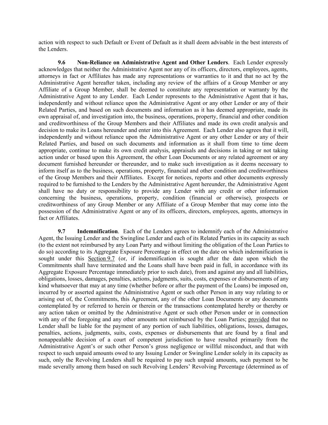 action with respect to such Default or Event of Default as it shall deem advisable in the best interests of the Lenders. 9.6 Non-Reliance on Administrative Agent and Other Lenders. Each Lender expressly acknowledges that neither the Administrative Agent nor any of its officers, directors, employees, agents, attorneys in fact or Affiliates has made any representations or warranties to it and that no act by the Administrative Agent hereafter taken, including any review of the affairs of a Group Member or any Affiliate of a Group Member, shall be deemed to constitute any representation or warranty by the Administrative Agent to any Lender. Each Lender represents to the Administrative Agent that it has, independently and without reliance upon the Administrative Agent or any other Lender or any of their Related Parties, and based on such documents and information as it has deemed appropriate, made its own appraisal of, and investigation into, the business, operations, property, financial and other condition and creditworthiness of the Group Members and their Affiliates and made its own credit analysis and decision to make its Loans hereunder and enter into this Agreement. Each Lender also agrees that it will, independently and without reliance upon the Administrative Agent or any other Lender or any of their Related Parties, and based on such documents and information as it shall from time to time deem appropriate, continue to make its own credit analysis, appraisals and decisions in taking or not taking action under or based upon this Agreement, the other Loan Documents or any related agreement or any document furnished hereunder or thereunder, and to make such investigation as it deems necessary to inform itself as to the business, operations, property, financial and other condition and creditworthiness of the Group Members and their Affiliates. Except for notices, reports and other documents expressly required to be furnished to the Lenders by the Administrative Agent hereunder, the Administrative Agent shall have no duty or responsibility to provide any Lender with any credit or other information concerning the business, operations, property, condition (financial or otherwise), prospects or creditworthiness of any Group Member or any Affiliate of a Group Member that may come into the possession of the Administrative Agent or any of its officers, directors, employees, agents, attorneys in fact or Affiliates. 9.7 Indemnification. Each of the Lenders agrees to indemnify each of the Administrative Agent, the Issuing Lender and the Swingline Lender and each of its Related Parties in its capacity as such (to the extent not reimbursed by any Loan Party and without limiting the obligation of the Loan Parties to do so) according to its Aggregate Exposure Percentage in effect on the date on which indemnification is sought under this Section 9.7 (or, if indemnification is sought after the date upon which the Commitments shall have terminated and the Loans shall have been paid in full, in accordance with its Aggregate Exposure Percentage immediately prior to such date), from and against any and all liabilities, obligations, losses, damages, penalties, actions, judgments, suits, costs, expenses or disbursements of any kind whatsoever that may at any time (whether before or after the payment of the Loans) be imposed on, incurred by or asserted against the Administrative Agent or such other Person in any way relating to or arising out of, the Commitments, this Agreement, any of the other Loan Documents or any documents contemplated by or referred to herein or therein or the transactions contemplated hereby or thereby or any action taken or omitted by the Administrative Agent or such other Person under or in connection with any of the foregoing and any other amounts not reimbursed by the Loan Parties; provided that no Lender shall be liable for the payment of any portion of such liabilities, obligations, losses, damages, penalties, actions, judgments, suits, costs, expenses or disbursements that are found by a final and nonappealable decision of a court of competent jurisdiction to have resulted primarily from the Administrative Agent’s or such other Person’s gross negligence or willful misconduct, and that with respect to such unpaid amounts owed to any Issuing Lender or Swingline Lender solely in its capacity as such, only the Revolving Lenders shall be required to pay such unpaid amounts, such payment to be made severally among them based on such Revolving Lenders’ Revolving Percentage (determined as of