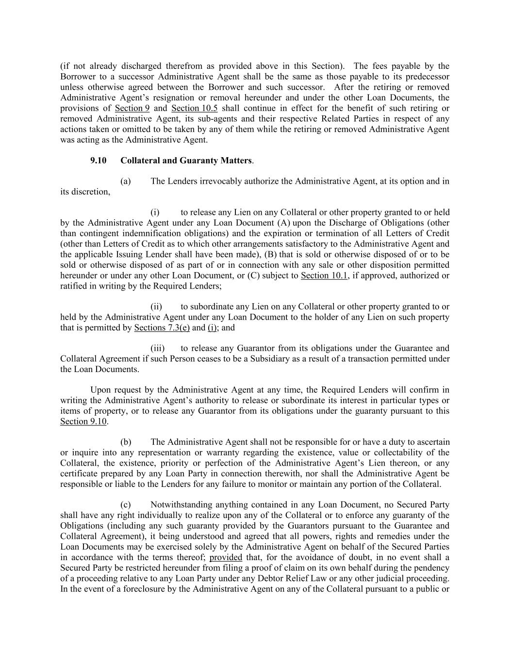 (if not already discharged therefrom as provided above in this Section). The fees payable by the Borrower to a successor Administrative Agent shall be the same as those payable to its predecessor unless otherwise agreed between the Borrower and such successor. After the retiring or removed Administrative Agent’s resignation or removal hereunder and under the other Loan Documents, the provisions of Section 9 and Section 10.5 shall continue in effect for the benefit of such retiring or removed Administrative Agent, its sub-agents and their respective Related Parties in respect of any actions taken or omitted to be taken by any of them while the retiring or removed Administrative Agent was acting as the Administrative Agent. 9.10 Collateral and Guaranty Matters. (a) The Lenders irrevocably authorize the Administrative Agent, at its option and in its discretion, (i) to release any Lien on any Collateral or other property granted to or held by the Administrative Agent under any Loan Document (A) upon the Discharge of Obligations (other than contingent indemnification obligations) and the expiration or termination of all Letters of Credit (other than Letters of Credit as to which other arrangements satisfactory to the Administrative Agent and the applicable Issuing Lender shall have been made), (B) that is sold or otherwise disposed of or to be sold or otherwise disposed of as part of or in connection with any sale or other disposition permitted hereunder or under any other Loan Document, or (C) subject to Section 10.1, if approved, authorized or ratified in writing by the Required Lenders; (ii) to subordinate any Lien on any Collateral or other property granted to or held by the Administrative Agent under any Loan Document to the holder of any Lien on such property that is permitted by Sections 7.3(e) and (i); and (iii) to release any Guarantor from its obligations under the Guarantee and Collateral Agreement if such Person ceases to be a Subsidiary as a result of a transaction permitted under the Loan Documents. Upon request by the Administrative Agent at any time, the Required Lenders will confirm in writing the Administrative Agent’s authority to release or subordinate its interest in particular types or items of property, or to release any Guarantor from its obligations under the guaranty pursuant to this Section 9.10. (b) The Administrative Agent shall not be responsible for or have a duty to ascertain or inquire into any representation or warranty regarding the existence, value or collectability of the Collateral, the existence, priority or perfection of the Administrative Agent’s Lien thereon, or any certificate prepared by any Loan Party in connection therewith, nor shall the Administrative Agent be responsible or liable to the Lenders for any failure to monitor or maintain any portion of the Collateral. (c) Notwithstanding anything contained in any Loan Document, no Secured Party shall have any right individually to realize upon any of the Collateral or to enforce any guaranty of the Obligations (including any such guaranty provided by the Guarantors pursuant to the Guarantee and Collateral Agreement), it being understood and agreed that all powers, rights and remedies under the Loan Documents may be exercised solely by the Administrative Agent on behalf of the Secured Parties in accordance with the terms thereof; provided that, for the avoidance of doubt, in no event shall a Secured Party be restricted hereunder from filing a proof of claim on its own behalf during the pendency of a proceeding relative to any Loan Party under any Debtor Relief Law or any other judicial proceeding. In the event of a foreclosure by the Administrative Agent on any of the Collateral pursuant to a public or