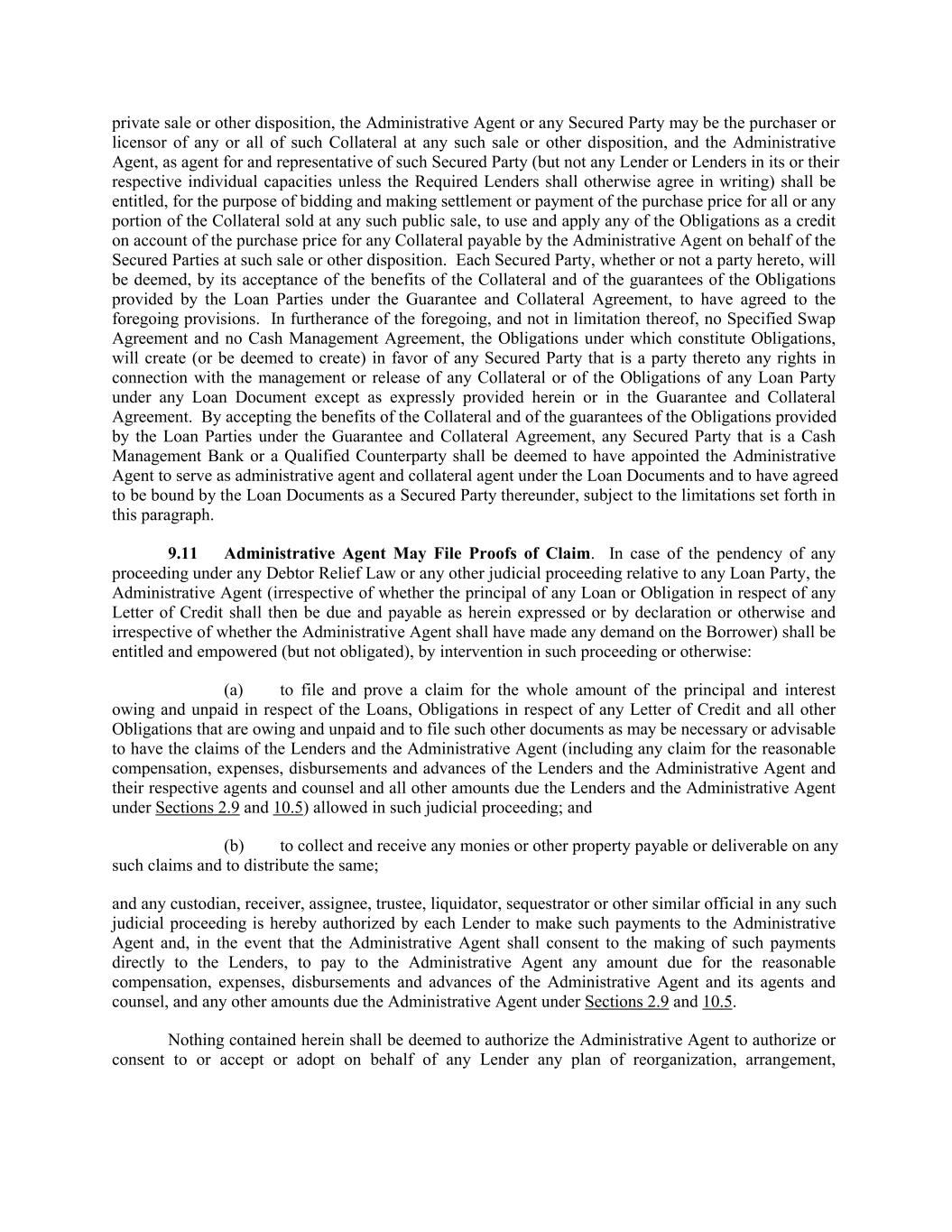 private sale or other disposition, the Administrative Agent or any Secured Party may be the purchaser or licensor of any or all of such Collateral at any such sale or other disposition, and the Administrative Agent, as agent for and representative of such Secured Party (but not any Lender or Lenders in its or their respective individual capacities unless the Required Lenders shall otherwise agree in writing) shall be entitled, for the purpose of bidding and making settlement or payment of the purchase price for all or any portion of the Collateral sold at any such public sale, to use and apply any of the Obligations as a credit on account of the purchase price for any Collateral payable by the Administrative Agent on behalf of the Secured Parties at such sale or other disposition. Each Secured Party, whether or not a party hereto, will be deemed, by its acceptance of the benefits of the Collateral and of the guarantees of the Obligations provided by the Loan Parties under the Guarantee and Collateral Agreement, to have agreed to the foregoing provisions. In furtherance of the foregoing, and not in limitation thereof, no Specified Swap Agreement and no Cash Management Agreement, the Obligations under which constitute Obligations, will create (or be deemed to create) in favor of any Secured Party that is a party thereto any rights in connection with the management or release of any Collateral or of the Obligations of any Loan Party under any Loan Document except as expressly provided herein or in the Guarantee and Collateral Agreement. By accepting the benefits of the Collateral and of the guarantees of the Obligations provided by the Loan Parties under the Guarantee and Collateral Agreement, any Secured Party that is a Cash Management Bank or a Qualified Counterparty shall be deemed to have appointed the Administrative Agent to serve as administrative agent and collateral agent under the Loan Documents and to have agreed to be bound by the Loan Documents as a Secured Party thereunder, subject to the limitations set forth in this paragraph. 9.11 Administrative Agent May File Proofs of Claim. In case of the pendency of any proceeding under any Debtor Relief Law or any other judicial proceeding relative to any Loan Party, the Administrative Agent (irrespective of whether the principal of any Loan or Obligation in respect of any Letter of Credit shall then be due and payable as herein expressed or by declaration or otherwise and irrespective of whether the Administrative Agent shall have made any demand on the Borrower) shall be entitled and empowered (but not obligated), by intervention in such proceeding or otherwise: (a) to file and prove a claim for the whole amount of the principal and interest owing and unpaid in respect of the Loans, Obligations in respect of any Letter of Credit and all other Obligations that are owing and unpaid and to file such other documents as may be necessary or advisable to have the claims of the Lenders and the Administrative Agent (including any claim for the reasonable compensation, expenses, disbursements and advances of the Lenders and the Administrative Agent and their respective agents and counsel and all other amounts due the Lenders and the Administrative Agent under Sections 2.9 and 10.5) allowed in such judicial proceeding; and (b) to collect and receive any monies or other property payable or deliverable on any such claims and to distribute the same; and any custodian, receiver, assignee, trustee, liquidator, sequestrator or other similar official in any such judicial proceeding is hereby authorized by each Lender to make such payments to the Administrative Agent and, in the event that the Administrative Agent shall consent to the making of such payments directly to the Lenders, to pay to the Administrative Agent any amount due for the reasonable compensation, expenses, disbursements and advances of the Administrative Agent and its agents and counsel, and any other amounts due the Administrative Agent under Sections 2.9 and 10.5. Nothing contained herein shall be deemed to authorize the Administrative Agent to authorize or consent to or accept or adopt on behalf of any Lender any plan of reorganization, arrangement,