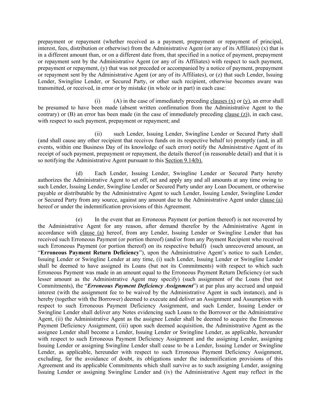 prepayment or repayment (whether received as a payment, prepayment or repayment of principal, interest, fees, distribution or otherwise) from the Administrative Agent (or any of its Affiliates) (x) that is in a different amount than, or on a different date from, that specified in a notice of payment, prepayment or repayment sent by the Administrative Agent (or any of its Affiliates) with respect to such payment, prepayment or repayment, (y) that was not preceded or accompanied by a notice of payment, prepayment or repayment sent by the Administrative Agent (or any of its Affiliates), or (z) that such Lender, Issuing Lender, Swingline Lender, or Secured Party, or other such recipient, otherwise becomes aware was transmitted, or received, in error or by mistake (in whole or in part) in each case: (i) (A) in the case of immediately preceding clauses (x) or (y), an error shall be presumed to have been made (absent written confirmation from the Administrative Agent to the contrary) or (B) an error has been made (in the case of immediately preceding clause (z)), in each case, with respect to such payment, prepayment or repayment; and (ii) such Lender, Issuing Lender, Swingline Lender or Secured Party shall (and shall cause any other recipient that receives funds on its respective behalf to) promptly (and, in all events, within one Business Day of its knowledge of such error) notify the Administrative Agent of its receipt of such payment, prepayment or repayment, the details thereof (in reasonable detail) and that it is so notifying the Administrative Agent pursuant to this Section 9.14(b). (d) Each Lender, Issuing Lender, Swingline Lender or Secured Party hereby authorizes the Administrative Agent to set off, net and apply any and all amounts at any time owing to such Lender, Issuing Lender, Swingline Lender or Secured Party under any Loan Document, or otherwise payable or distributable by the Administrative Agent to such Lender, Issuing Lender, Swingline Lender or Secured Party from any source, against any amount due to the Administrative Agent under clause (a) hereof or under the indemnification provisions of this Agreement. (e) In the event that an Erroneous Payment (or portion thereof) is not recovered by the Administrative Agent for any reason, after demand therefor by the Administrative Agent in accordance with clause (a) hereof, from any Lender, Issuing Lender or Swingline Lender that has received such Erroneous Payment (or portion thereof) (and/or from any Payment Recipient who received such Erroneous Payment (or portion thereof) on its respective behalf) (such unrecovered amount, an “Erroneous Payment Return Deficiency”), upon the Administrative Agent’s notice to such Lender, Issuing Lender or Swingline Lender at any time, (i) such Lender, Issuing Lender or Swingline Lender shall be deemed to have assigned its Loans (but not its Commitments) with respect to which such Erroneous Payment was made in an amount equal to the Erroneous Payment Return Deficiency (or such lesser amount as the Administrative Agent may specify) (such assignment of the Loans (but not Commitments), the “Erroneous Payment Deficiency Assignment”) at par plus any accrued and unpaid interest (with the assignment fee to be waived by the Administrative Agent in such instance), and is hereby (together with the Borrower) deemed to execute and deliver an Assignment and Assumption with respect to such Erroneous Payment Deficiency Assignment, and such Lender, Issuing Lender or Swingline Lender shall deliver any Notes evidencing such Loans to the Borrower or the Administrative Agent, (ii) the Administrative Agent as the assignee Lender shall be deemed to acquire the Erroneous Payment Deficiency Assignment, (iii) upon such deemed acquisition, the Administrative Agent as the assignee Lender shall become a Lender, Issuing Lender or Swingline Lender, as applicable, hereunder with respect to such Erroneous Payment Deficiency Assignment and the assigning Lender, assigning Issuing Lender or assigning Swingline Lender shall cease to be a Lender, Issuing Lender or Swingline Lender, as applicable, hereunder with respect to such Erroneous Payment Deficiency Assignment, excluding, for the avoidance of doubt, its obligations under the indemnification provisions of this Agreement and its applicable Commitments which shall survive as to such assigning Lender, assigning Issuing Lender or assigning Swingline Lender and (iv) the Administrative Agent may reflect in the